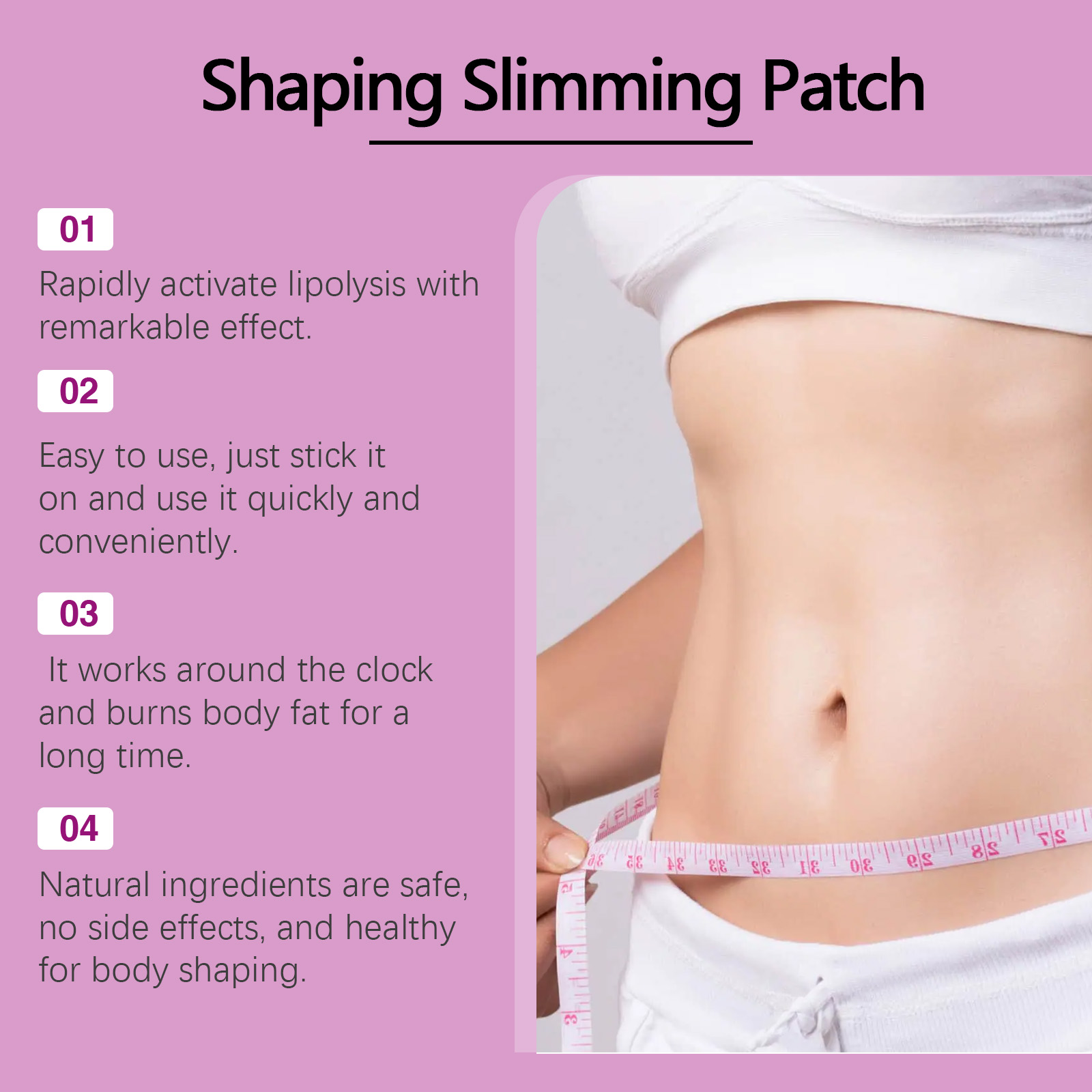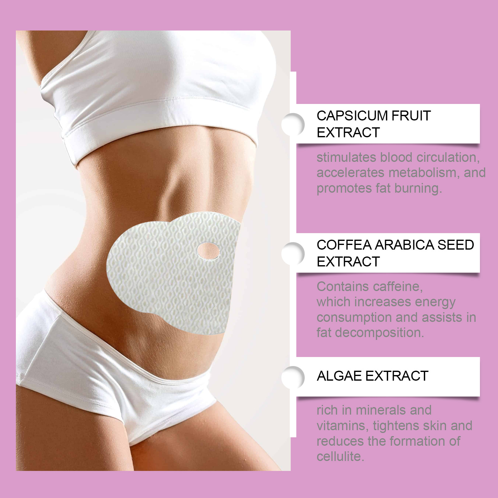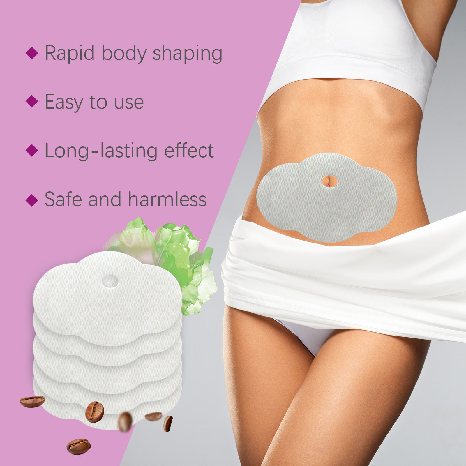 Our Shaping Beauty contains sophorins, catechins and capsicum fruit extract. It can stimulate blood circulation. Speed up metabolism and promote fat burning; Contains caffeine, which increases energy expenditure and helps with fat breakdown. Rich in minerals and vitamins, it tightens the skin and reduces cellulite formation. Its application method is simple: 1. Clean the skin around the belly button and keep it dry; 2. Place the patch on your belly button and gently press the patch to ensure proper adherence; 3. Wait 3-4 hours, then remove. Shaping Beauty Considerate continuously releases active ingredients that help burn deadly day. Relieve muscle fatigue and rejuvenate. Firming skin and reducing cellulite. Use natural ingredients that quickly activate fat breakdown and effectively shape your body. All ingredients are naturally extracted and do not contain hormones or harmful substances.