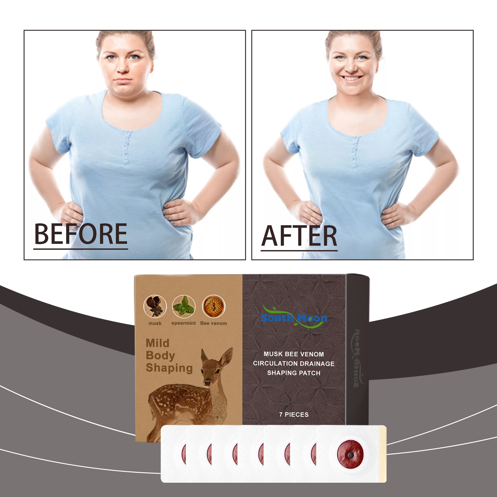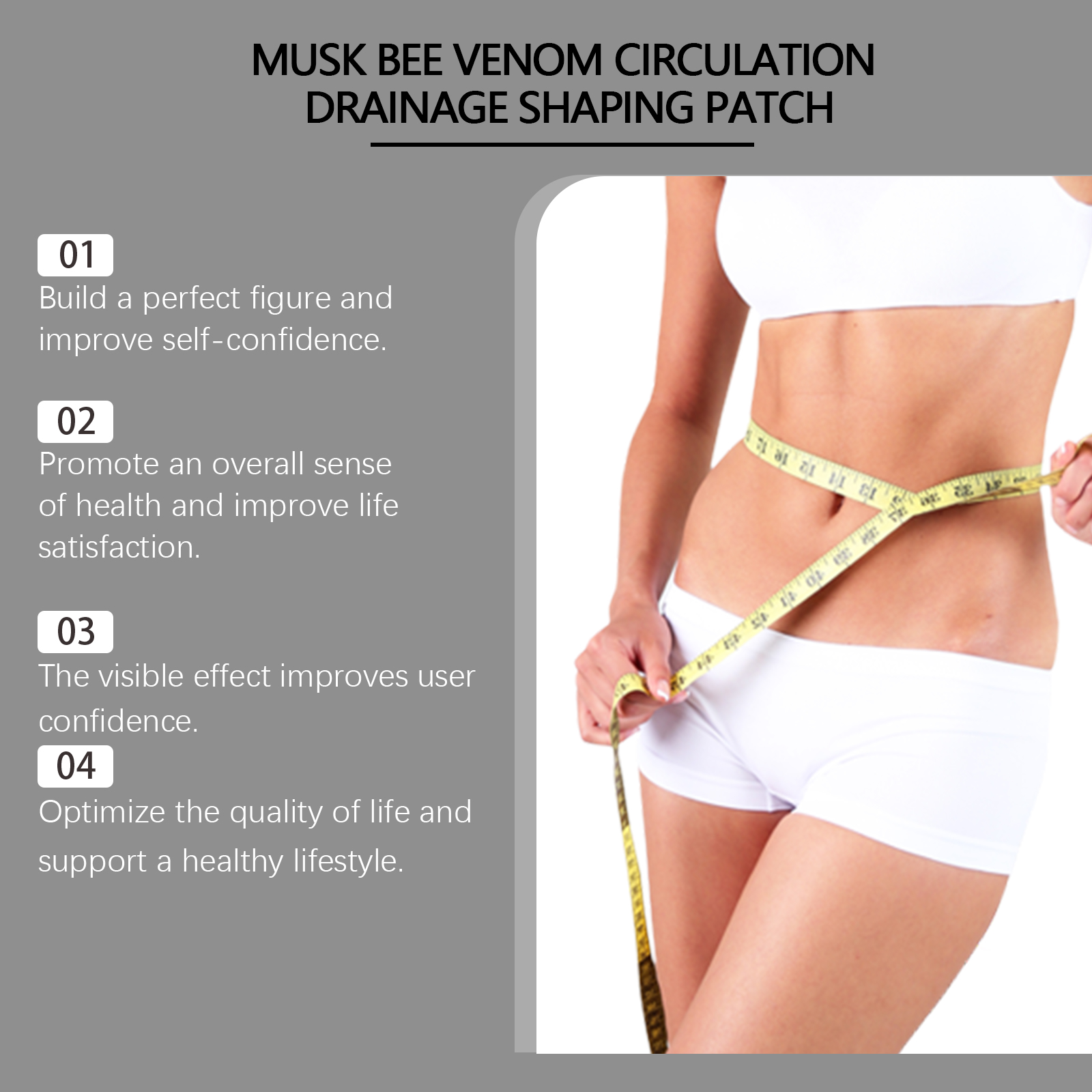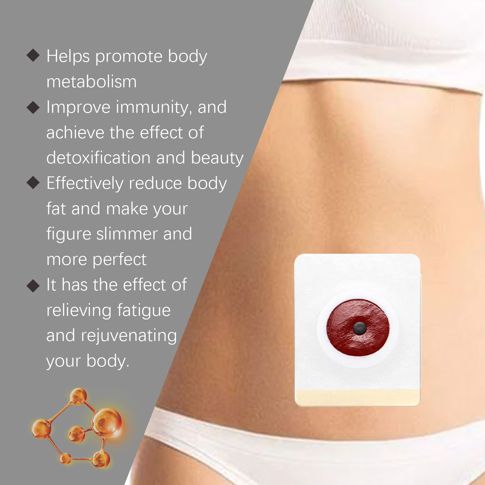 Our Musk Bee Venom Body Shaping patch contains ginger root extract and chamomile flower extract. It can effectively speed up the body's metabolism. Its application is simple: clean the skin around your belly button, keep it dry, place the patch on your belly button, gently press the patch to ensure the correct adhesion, wait 3-4 hours and then remove the patch. It can also optimize the quality of life and support a healthy lifestyle.