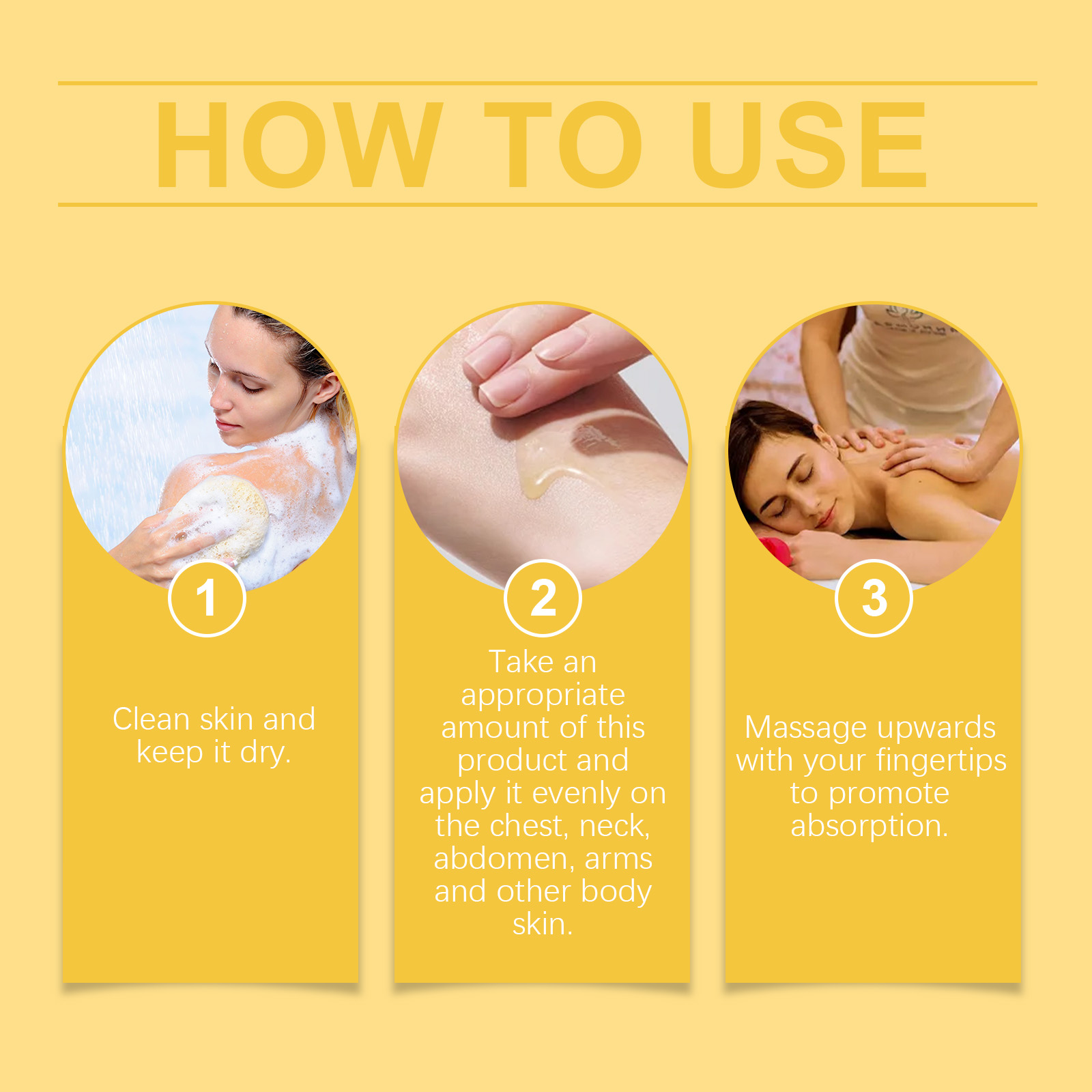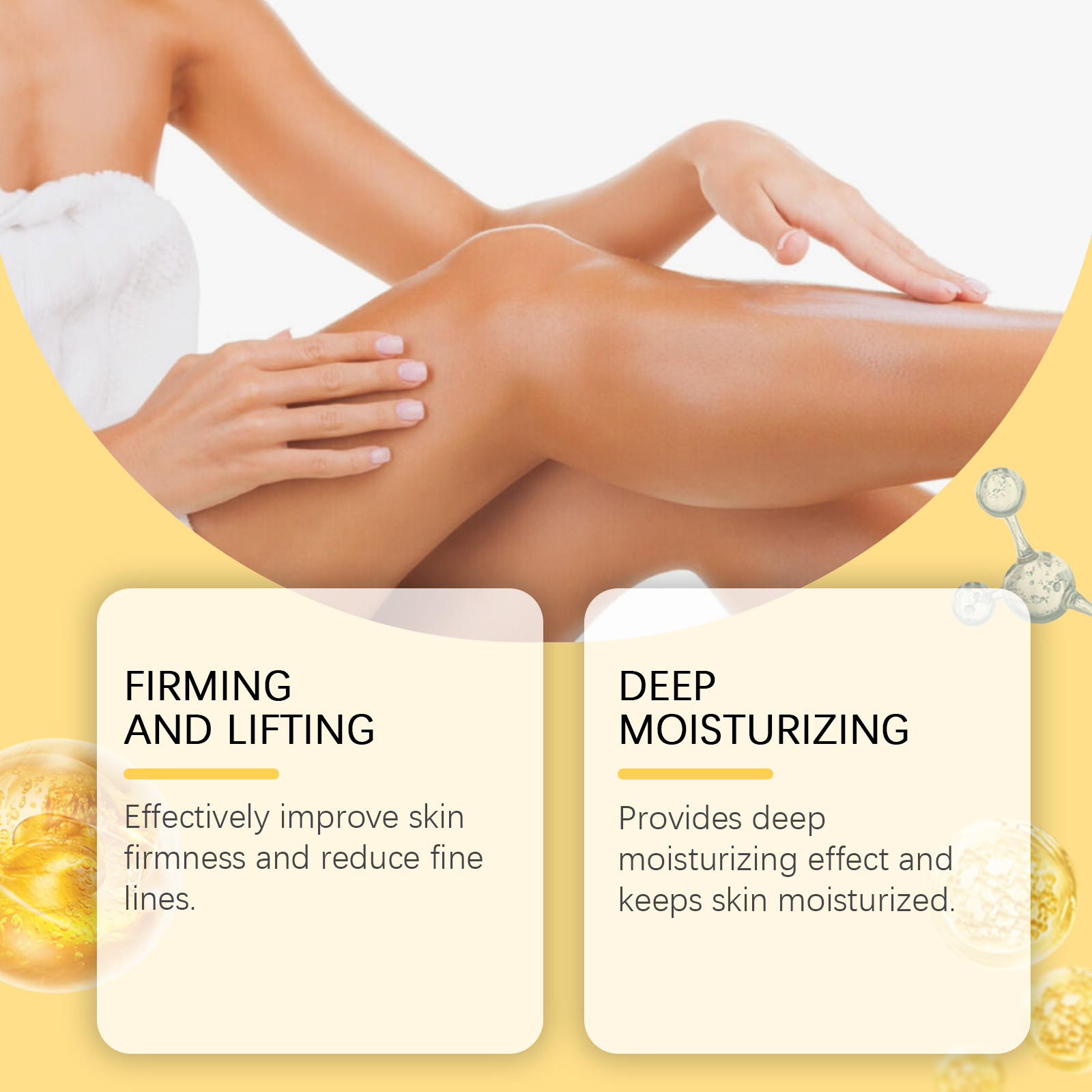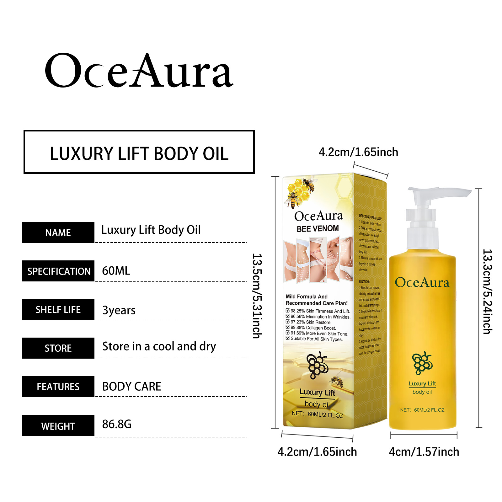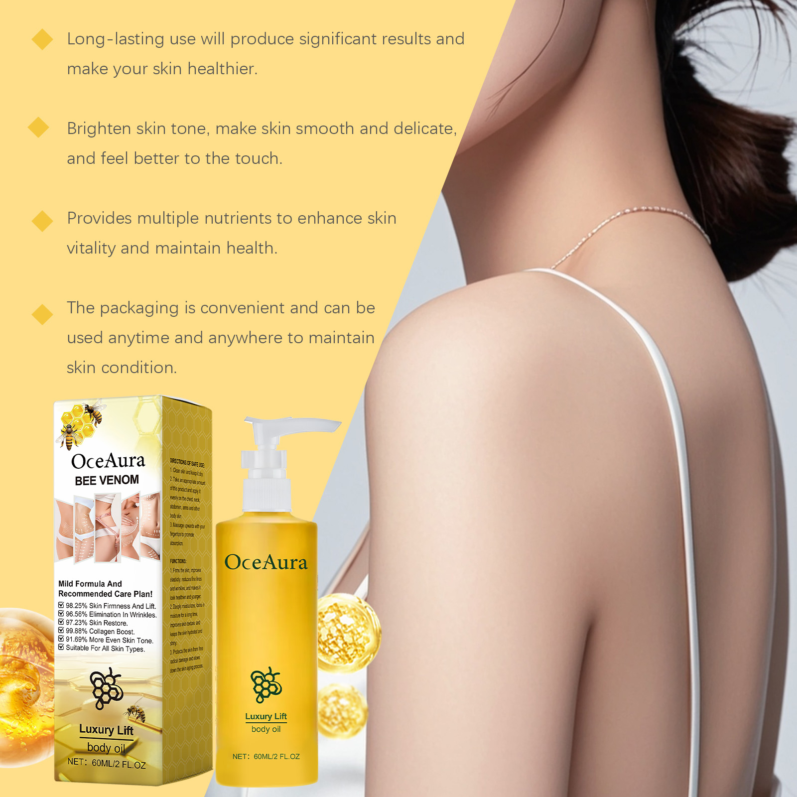 Our body skin firming oil contains bee venom, niacinamide. It can effectively improve skin firmness and reduce fine lines. Provides deep moisturizing effect to keep skin moisturized. The way to use it is simple: clean the skin and keep it dry. Take an appropriate amount of this product and evenly apply to the whole body skin such as chest, neck, abdomen and arms. Massage upward with your fingertips to promote absorption. It can resist the damage of the external environment to the skin and keep the youthful luster.