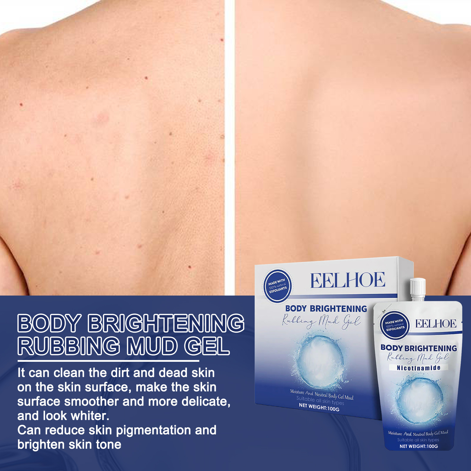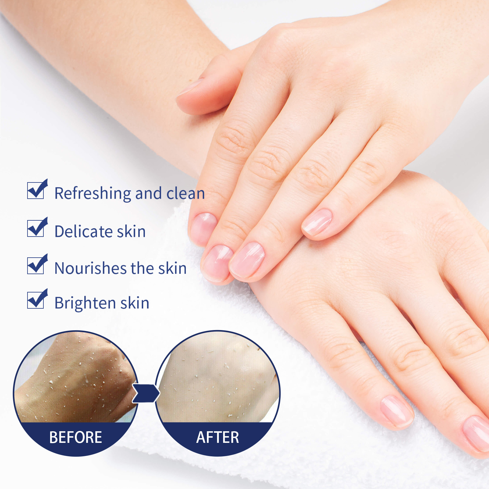 Our body whitening scrub contains niacinamide, aloe vera extract, and milk extract. It can clean the dirt and dead skin on the surface of the skin, making the surface of the skin smoother and finer, and looking whiter. It can reduce skin pigmentation and lighten skin tone. Its use method is very simple: 1. Bathe the body skin with warm water; 2. Apply an appropriate amount of scrub evenly on the skin; 3. Gently rub for 2-3 minutes; 4. Rinse with water. Suitable for all skin types, gently clean body dirt, gradually whiten body skin.