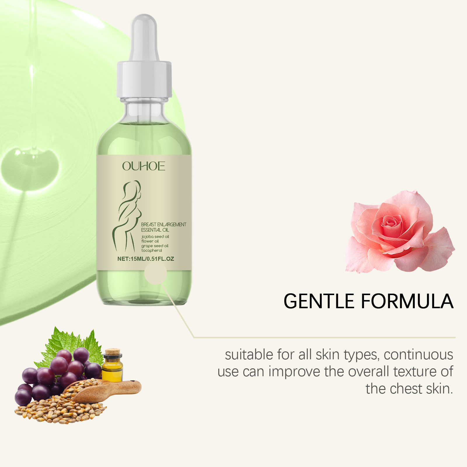 Our beauty cream oil contains grapeseed oil, rose oil. It can effectively nourish the skin of the chest, keep soft and elastic, and show beauty. The method of its use is very simple: first, wipe the breast with a hot wet towel, then evenly apply the right amount of this product to the two sides of the breast, and then massage the breast in a circular way from the outside to the inside until the essential oil is absorbed. And can improve the tightness of the chest skin, enhance the elastic curve.