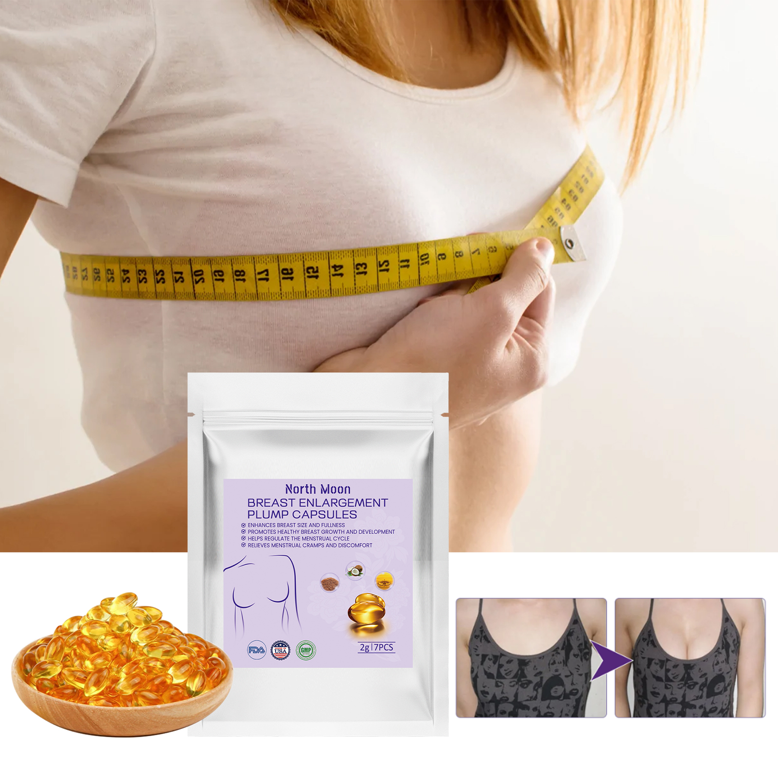 Our Breast Enlargement Plump Capsules contain Tocopherol (vitamin E), Trehalose, Glycerin. It can nourish the skin of the chest, enhance the absorption of ingredients, make the chest full and round, adjust the size of the chest, make the two sides of the chest symmetrical and perfect curve, and the chest becomes tight and full and perfect. Its use is very simple: keep your private parts wet after washing, when lying down or sitting, put the capsule into the vagina 6-7 cm deep (let the capsule be absorbed by the body naturally, use two hours before going to bed). It can stimulate the secretion of hormones needed to regulate menstruation and help regulate the menstrual cycle.