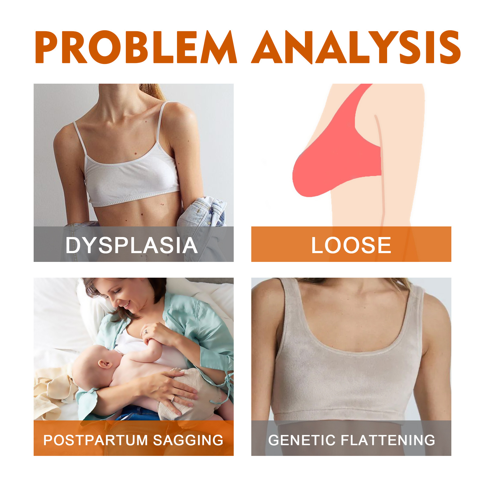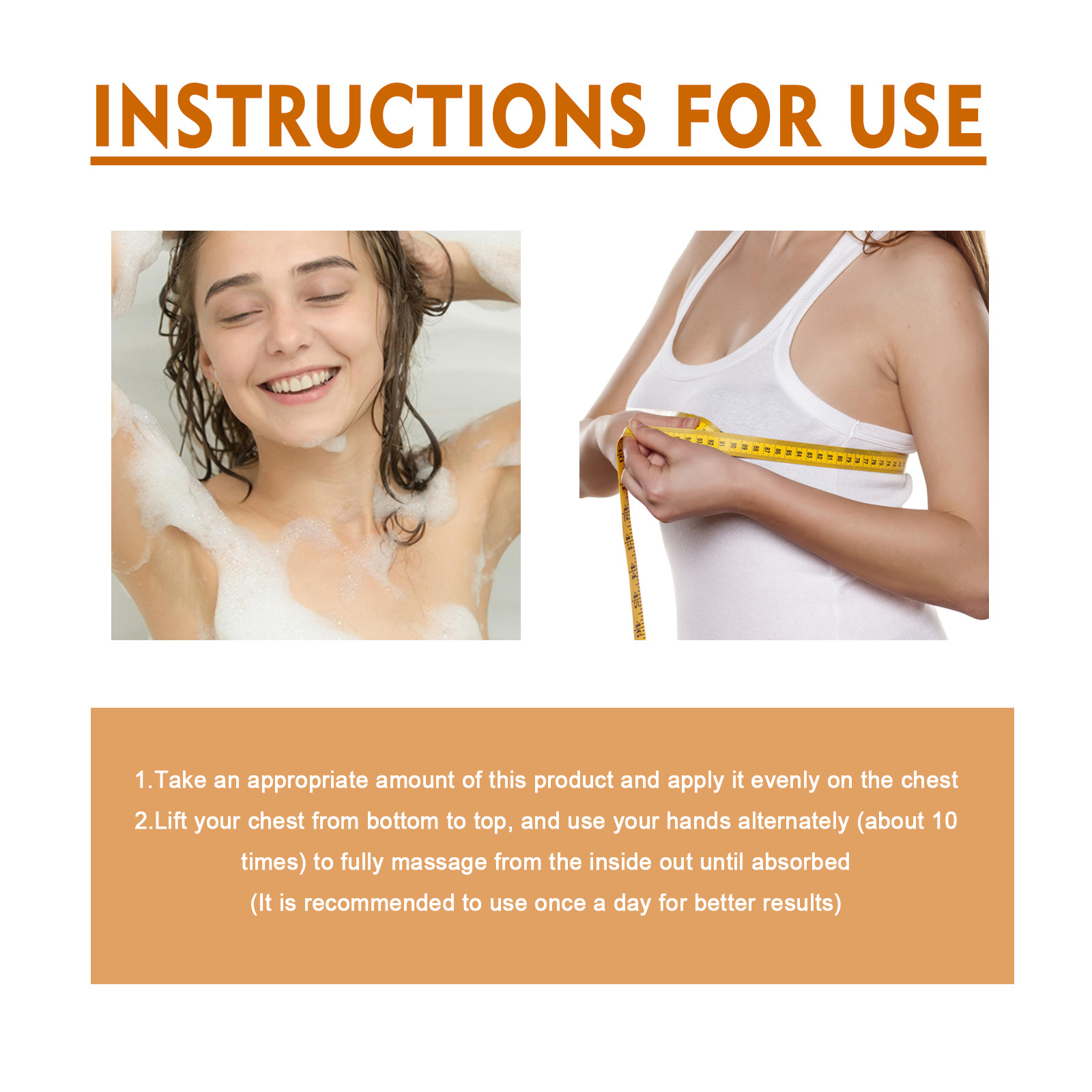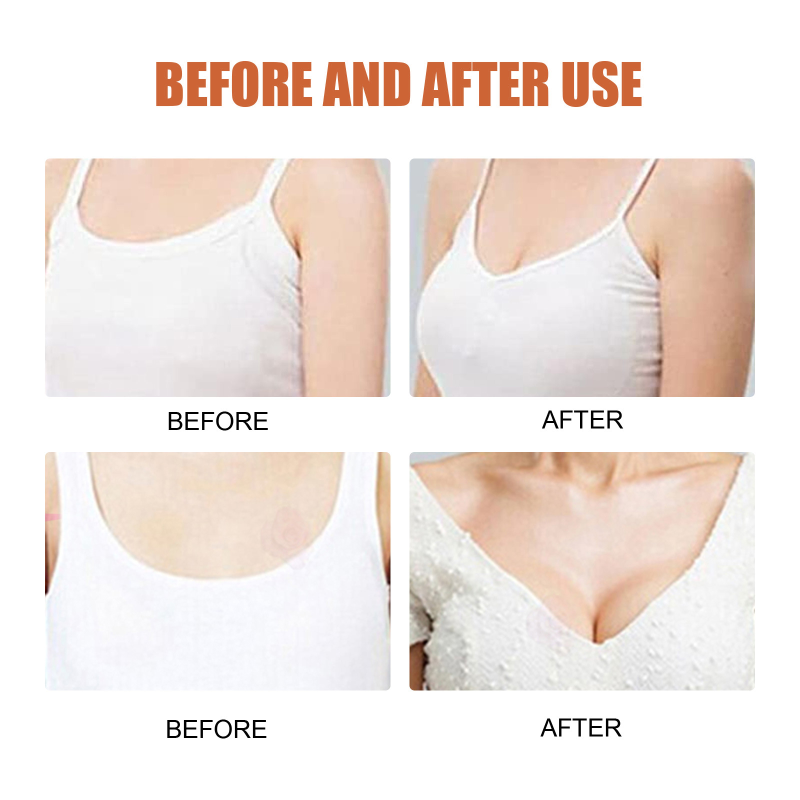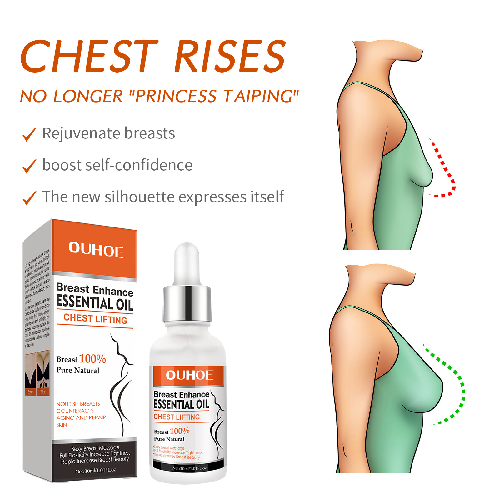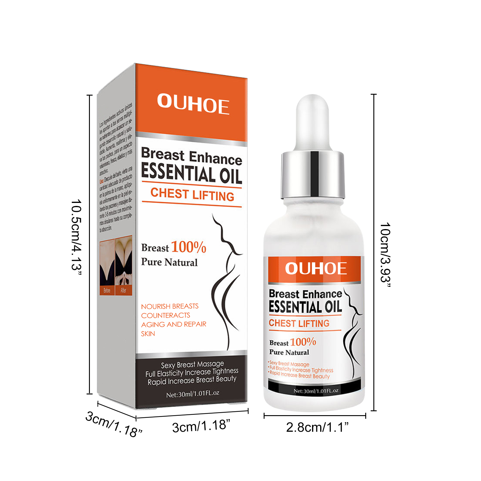 Our breast oils contain tocopherol, geranium flower oil and hydrogenated almond oil. It can enlarge breasts, improve sagging breasts, restore breasts, and improve self-confidence. Its use method is very simple: 1. Take appropriate amount of this product evenly spread on the chest; 2. Lift the chest from the bottom up, and massage the hands alternately (about 10 times) from inside to outside until absorbed (recommended once a day, the effect is better). Breast Care Essential oil is suitable for all body types, all age groups and all races.