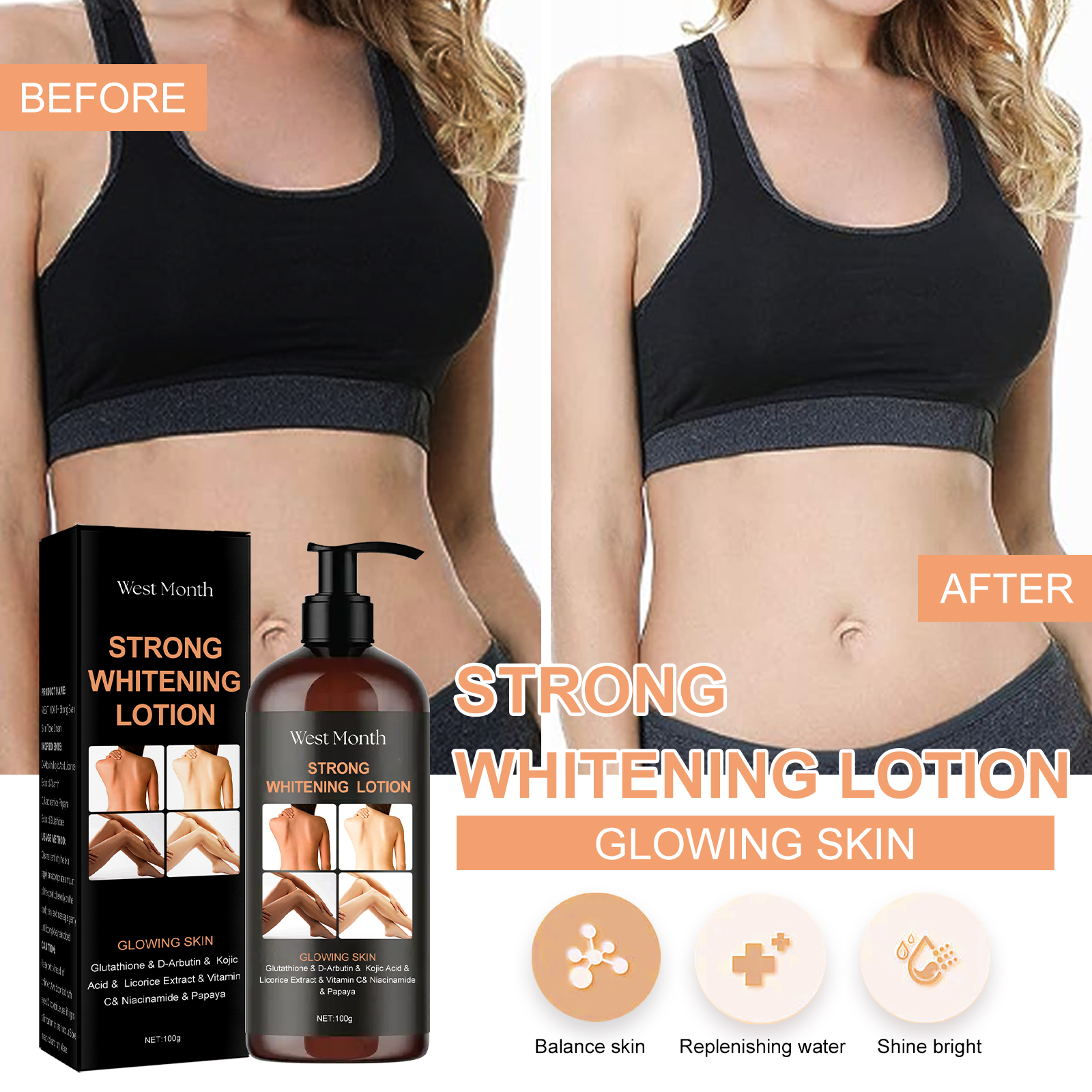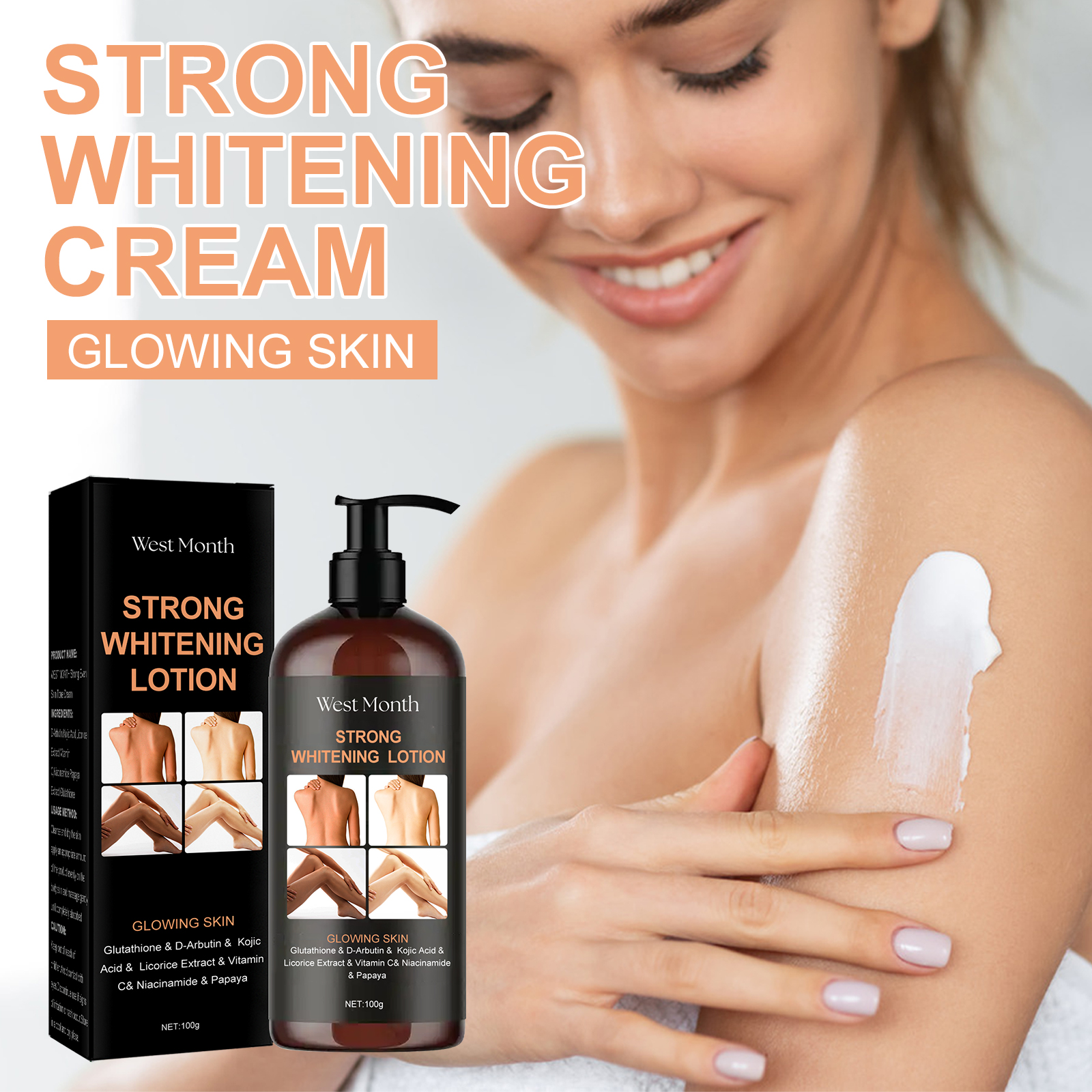 Our brightening body lotion contains D-ursa, kojic acid and licorice extract. It can improve dull skin and rejuvenate skin; Improve uneven skin tone and achieve even skin tone; Add moisturizing ingredients to effectively moisturize skin; Long-lasting moisturizing effect. Its use method is very simple: after cleansing, take appropriate amount of this product evenly apply to the body skin, gently massage until completely absorbed. Brightening Body Lotion brightens, balances, hydrates and radiates.