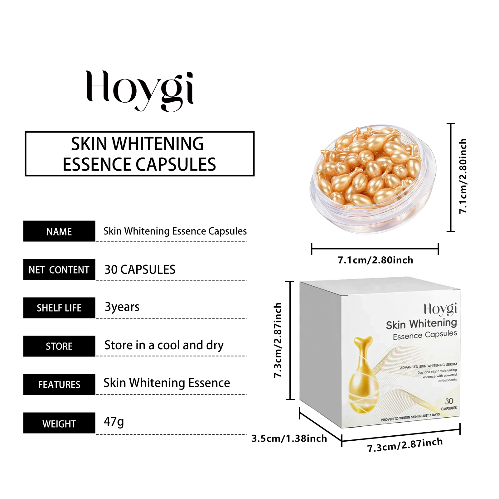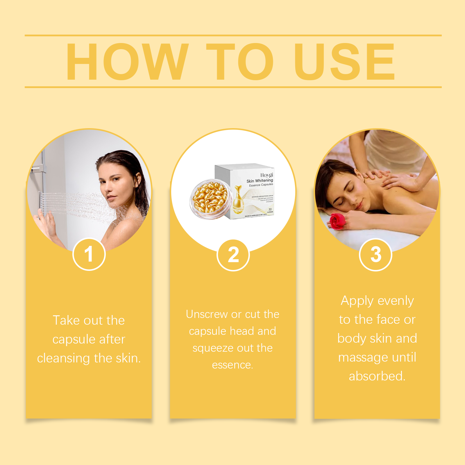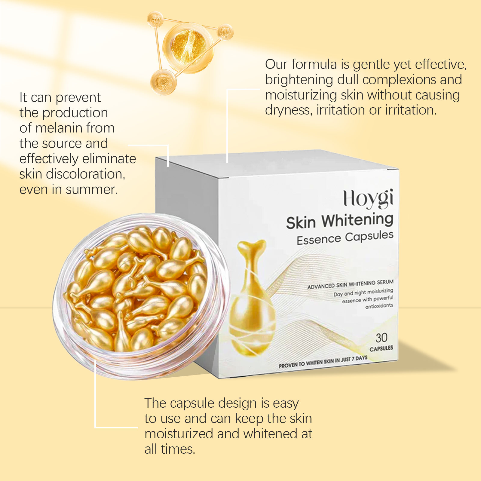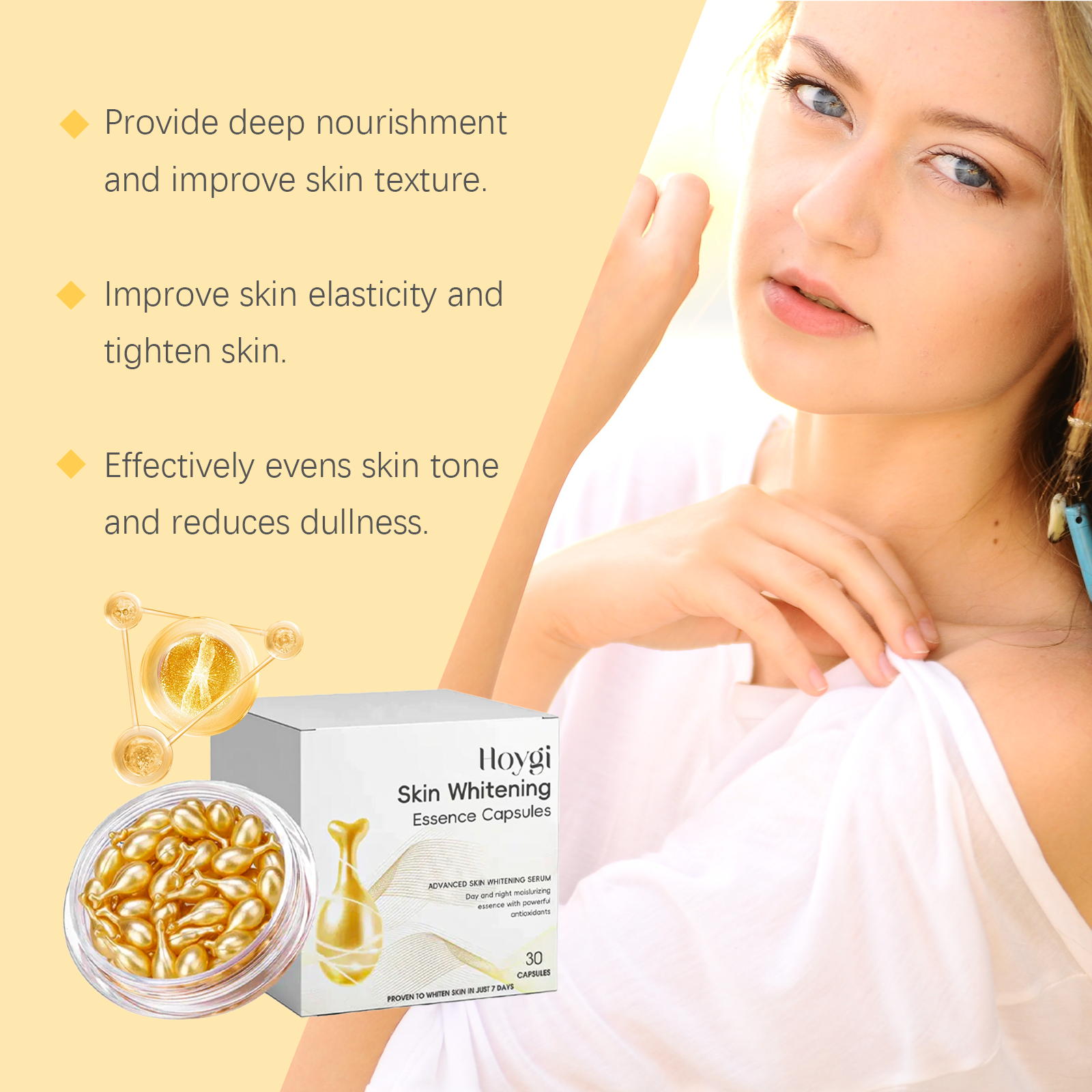 Our brightening and brightening capsules contain triethanolamine and tocopherol (vitamin E). It can provide deep nourishment, improve skin quality, improve skin elasticity, tighten skin, effectively balance skin tone, reduce dullness, prevent the production of melanin from the source, and effectively eliminate skin discoloration, even in the summer. Its application method is very simple: after cleaning the skin, take out the capsule, loosen or cut the capsule head, squeeze out the essence, evenly apply to the face or body skin, massage until absorbed. It gently and effectively lightens dull skin tones and moisturizes skin without causing dry irritation or irritation.
