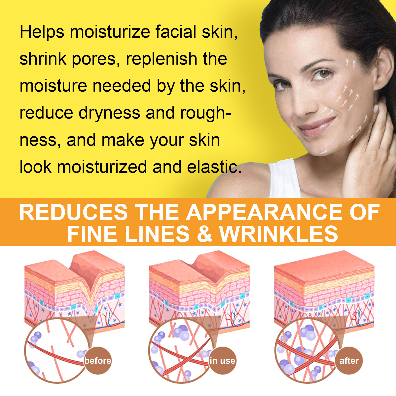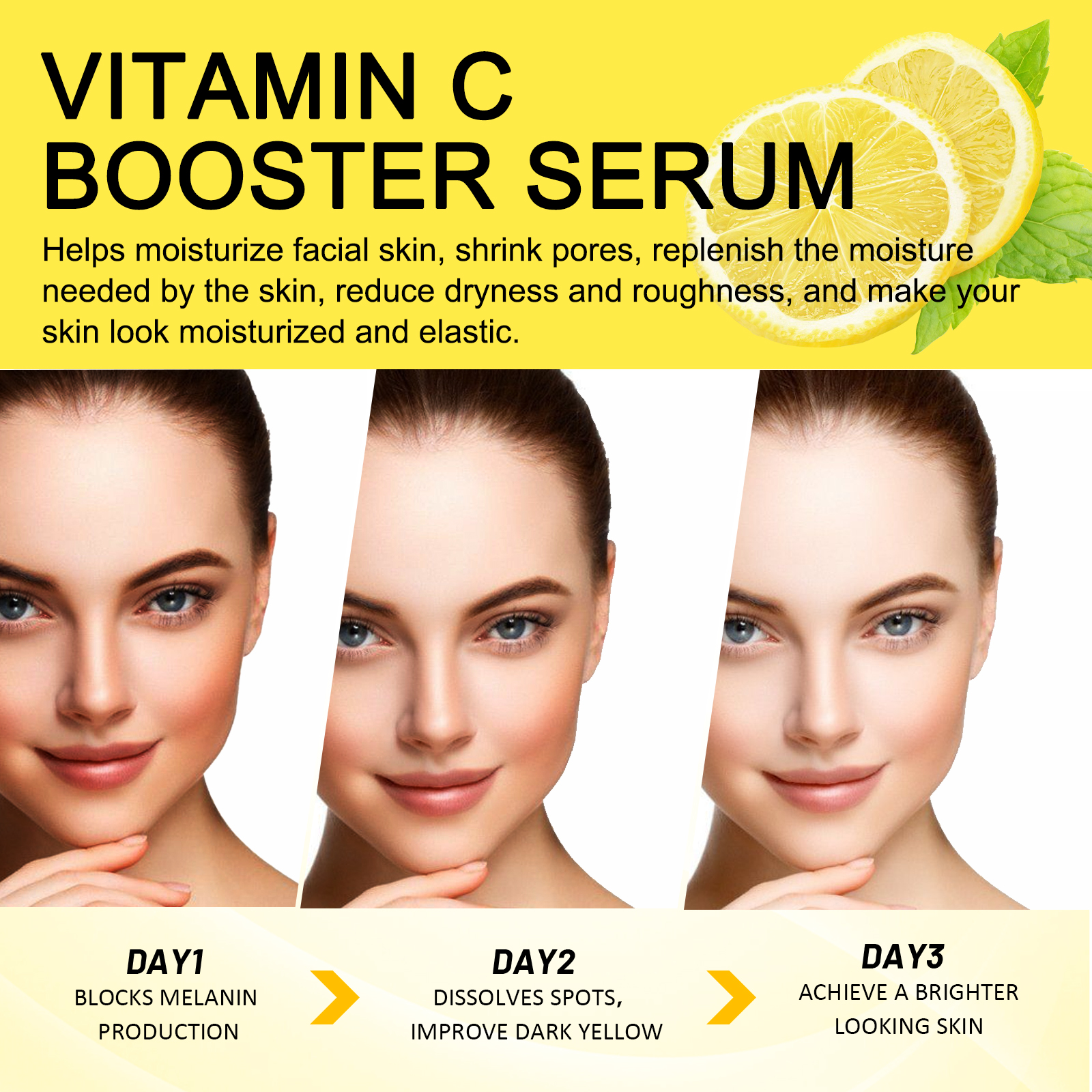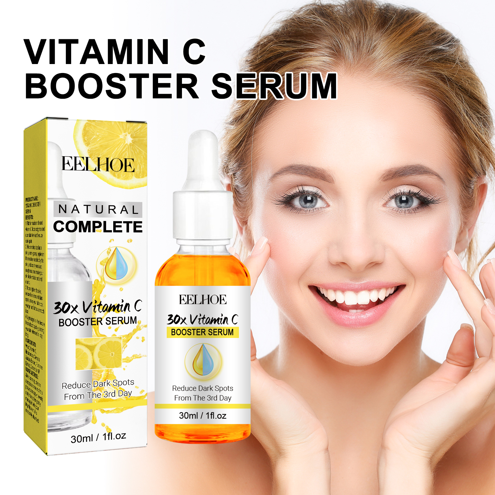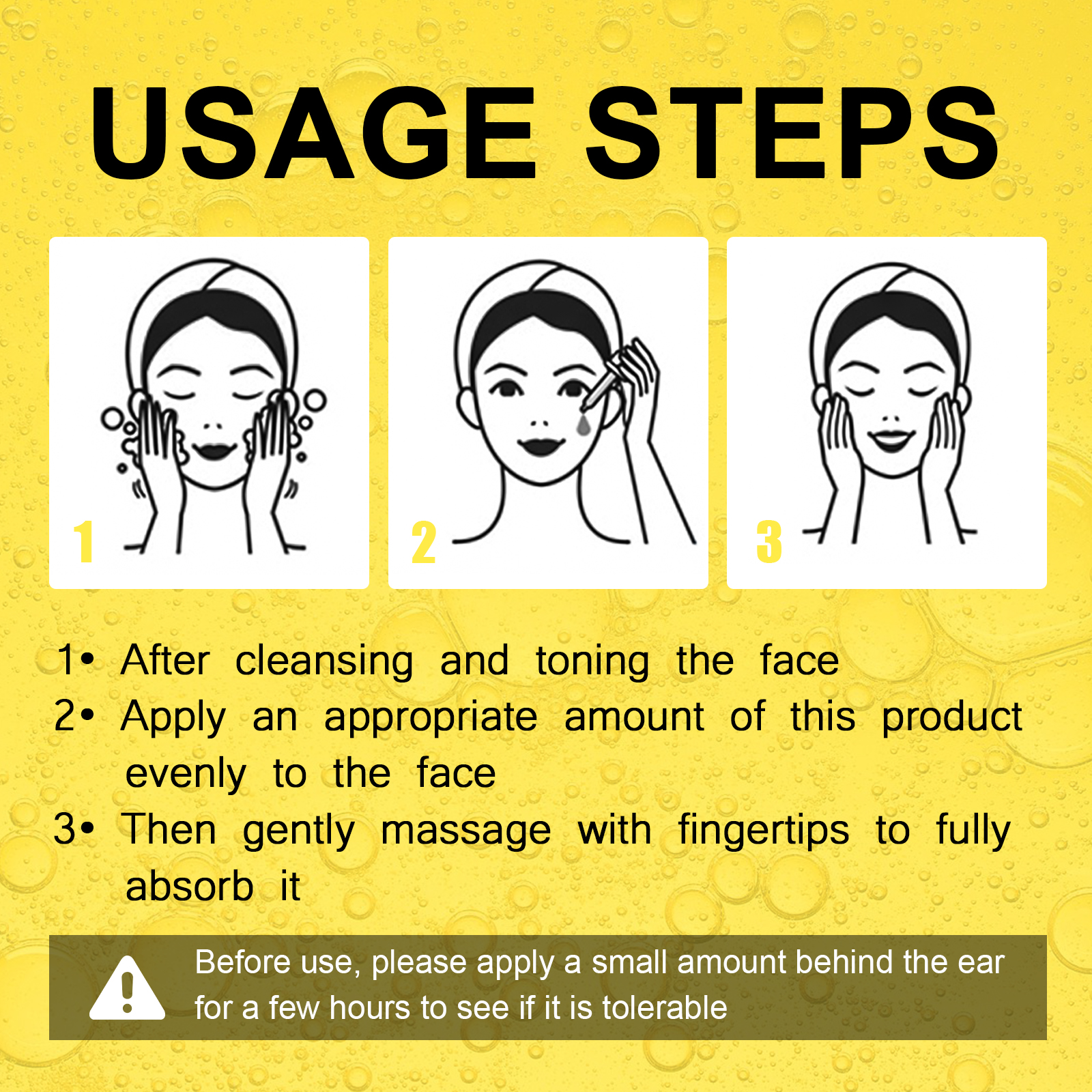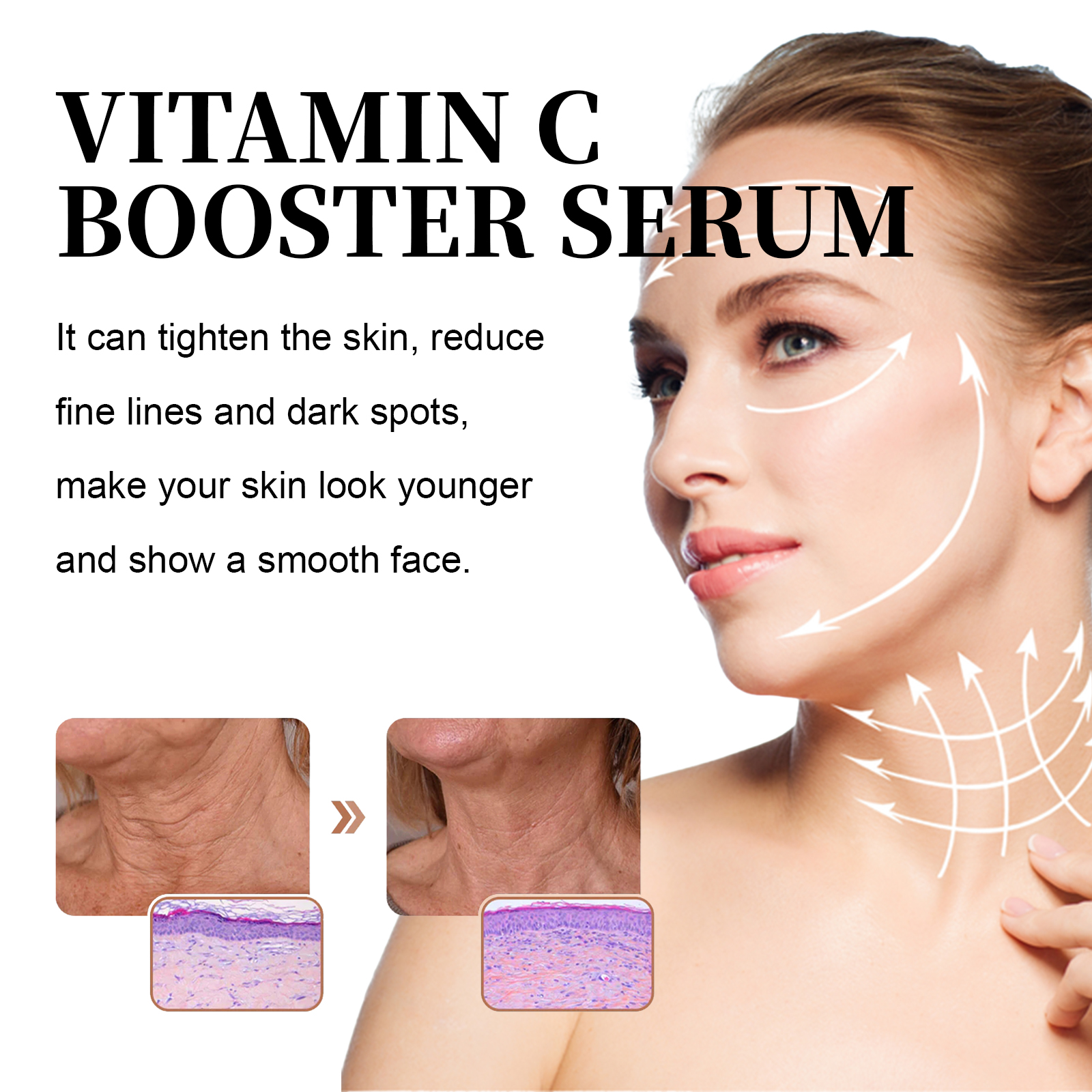Our VC brightening serum contains Centella asiatica extract, Purslane extract, ceramide NP. It can moisturize the facial skin, shrink pores, replenish the moisture the skin needs, reduce dryness and roughness, and make the skin look hydrated and elastic. Its use method is very simple: 1. Use after cleansing and toning; 2. Apply appropriate amount of the product evenly on the face; 3. Then gently massage with your fingertips to fully absorb it. It tightens the skin, reduces fine lines and dark spots, and makes your skin look younger and smoother.