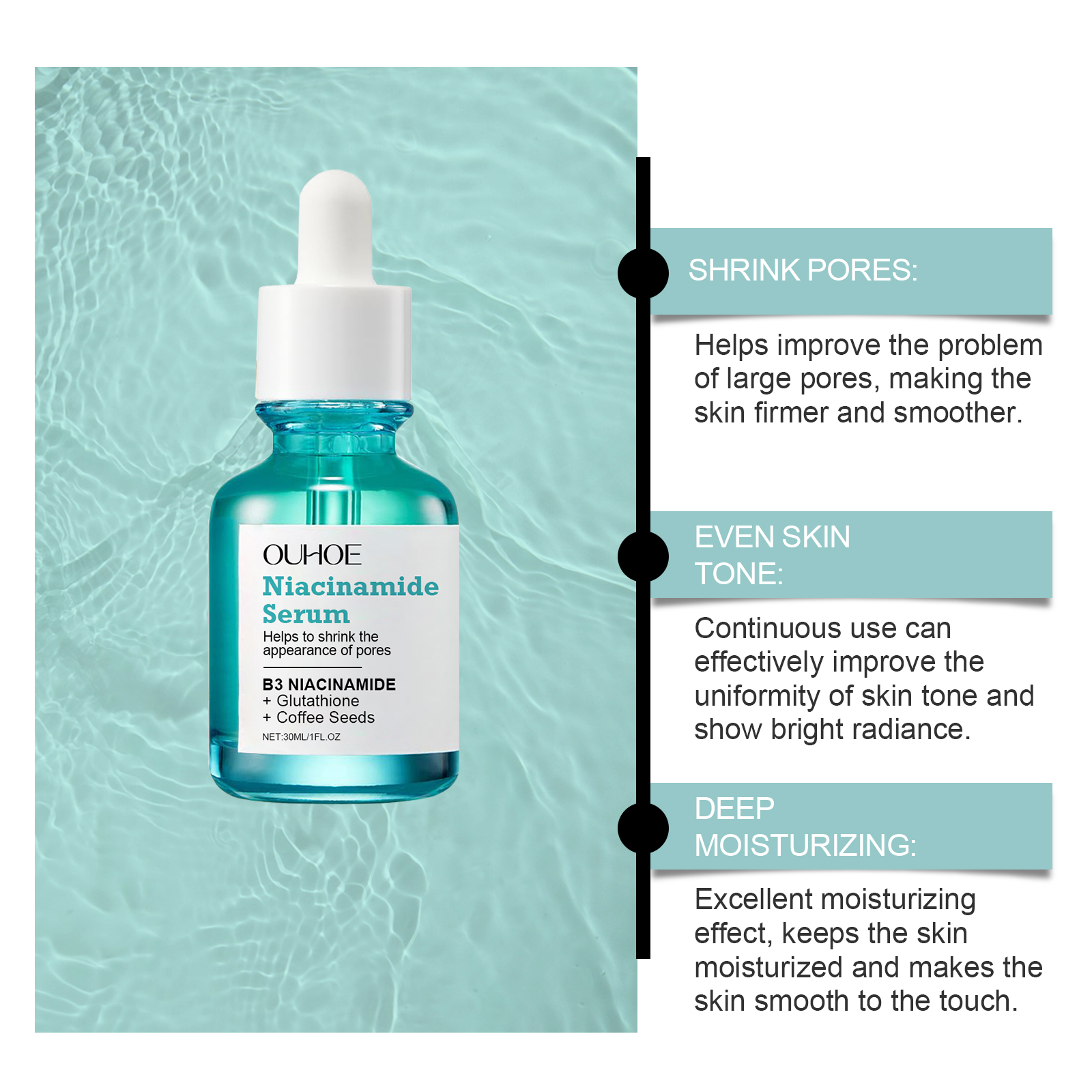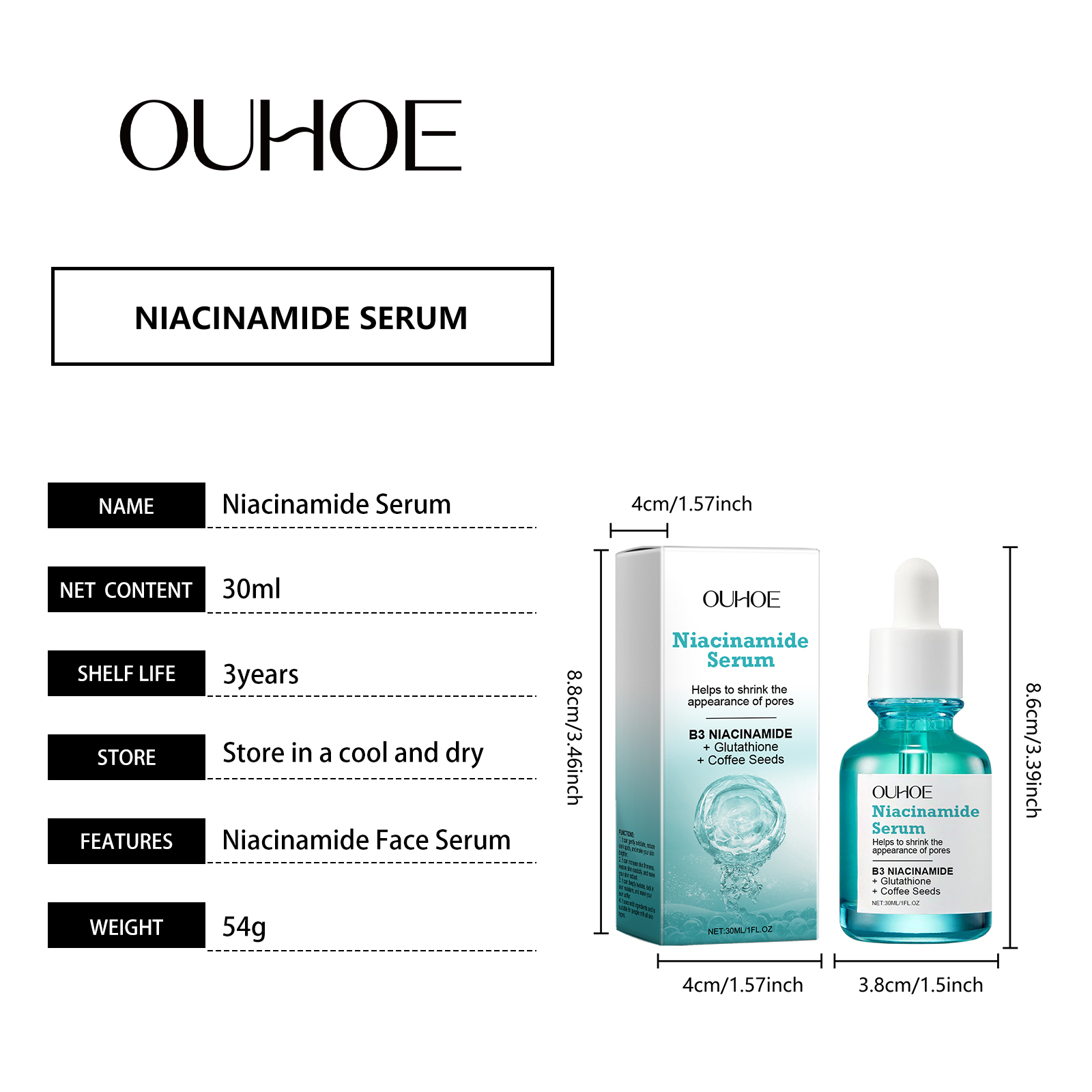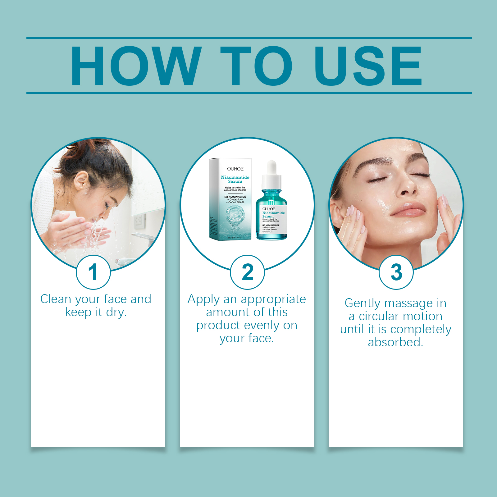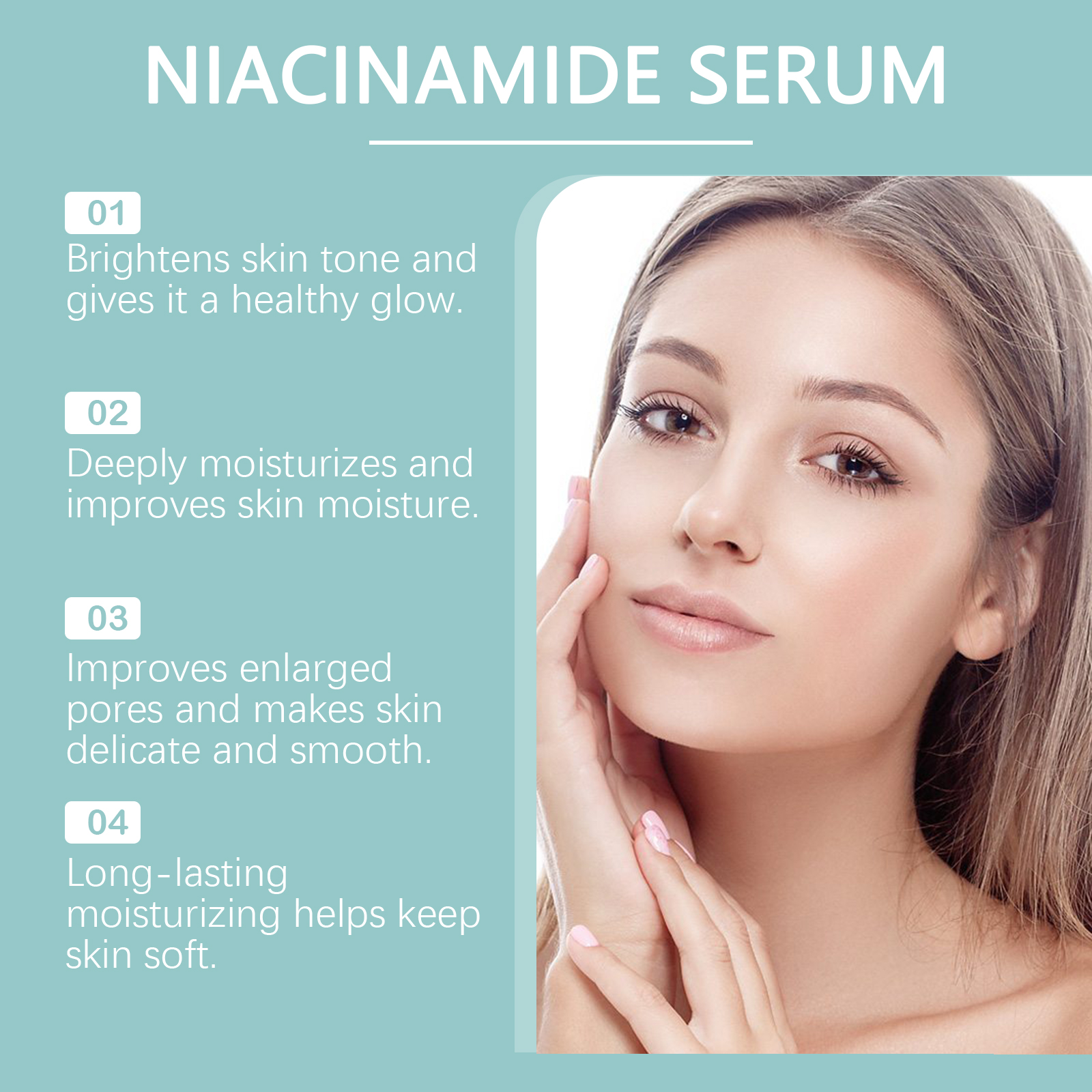 Our nicotinamide brightening serum contains coffee seed extract, ceramide AP. It can effectively moisturize and brighten the skin tone, helping to restore a healthy glow. Its application method is very simple: clean your face, keep dry, apply an appropriate amount of this product evenly on the face, gently massage in a circular motion until completely absorbed. It also provides deep moisture and helps to improve dry skin problems.