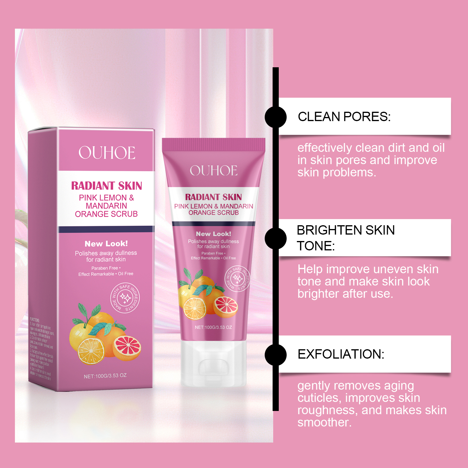 Our facial scrubs contain citrus fruit extract, lemon fruit extract. It can help repair skin barriers and maintain skin health and beauty. Its application method is very simple: wet your facial skin and apply appropriate amount of this product evenly on your facial skin, massage gently with your fingertips in circular motions, and finally rinse thoroughly with water. It can also improve the overall glossiness of the skin and make the skin glow.