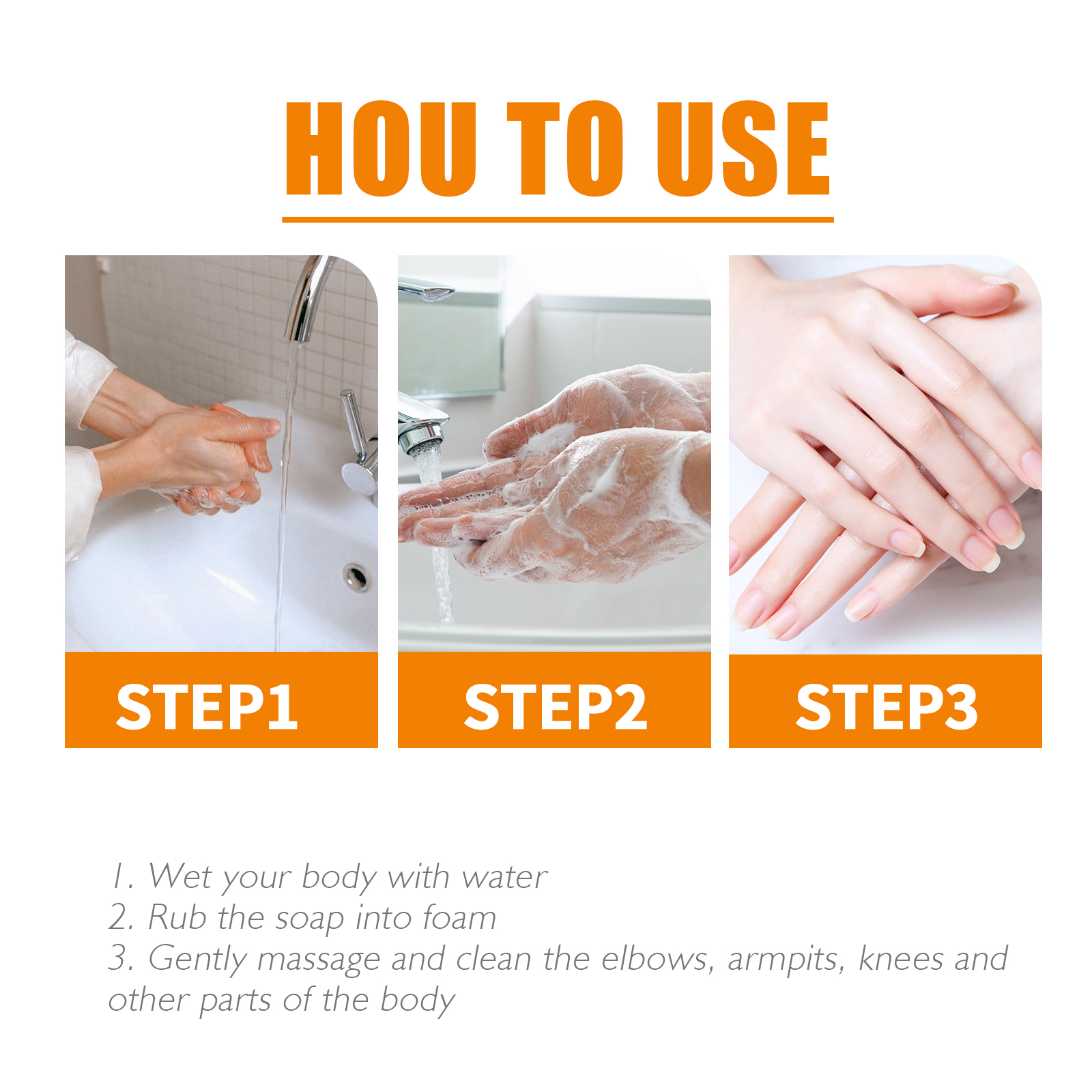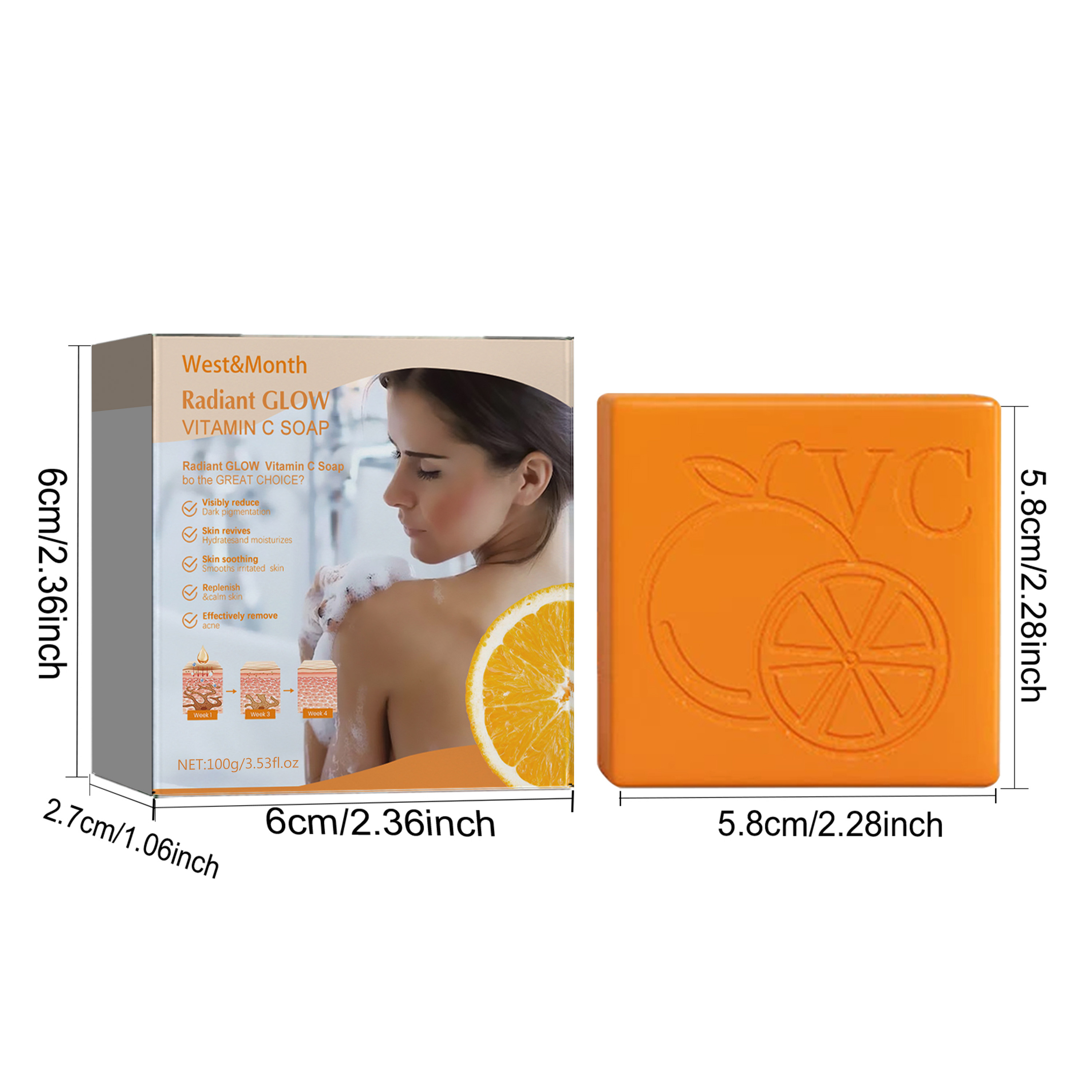 Our Radiant Glow Vitamin C Soap contains sweet orange extract, rose extract, aloe vera extract. It can eliminate dark pigmentation, reduce acne and acne spots, hydrates and moisturize skin. Its use method is very simple: Wet your body with water, rub the soap into foam, gently massage and clean the elbows, armpits, knees and other parts of the body. Moisturize skin, reducing dryness and hyperpigmentation for healthier looking skin with a more even tone.