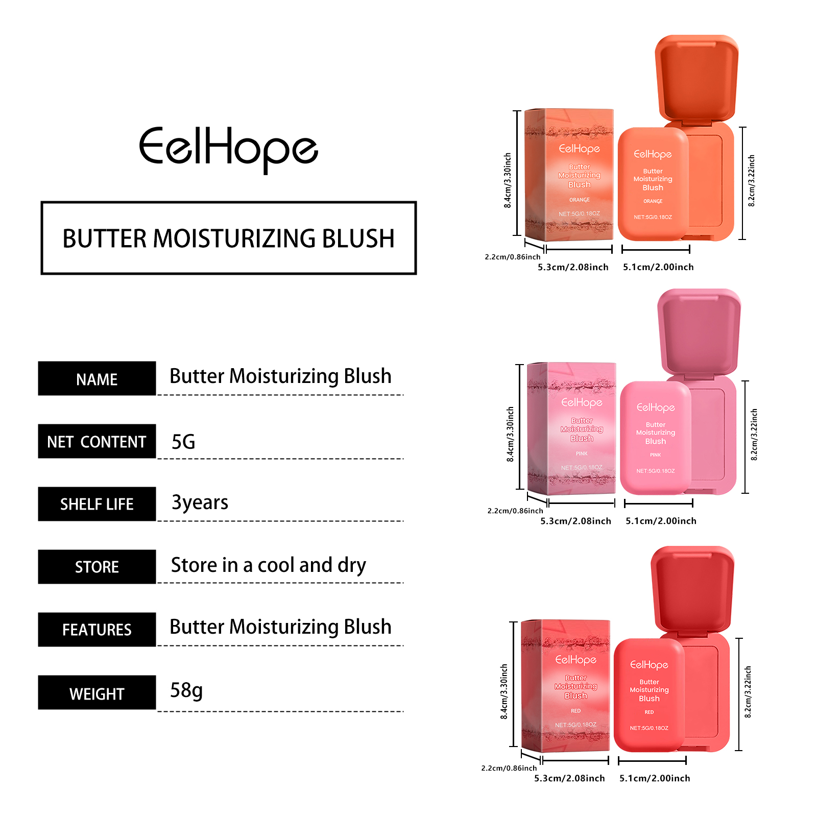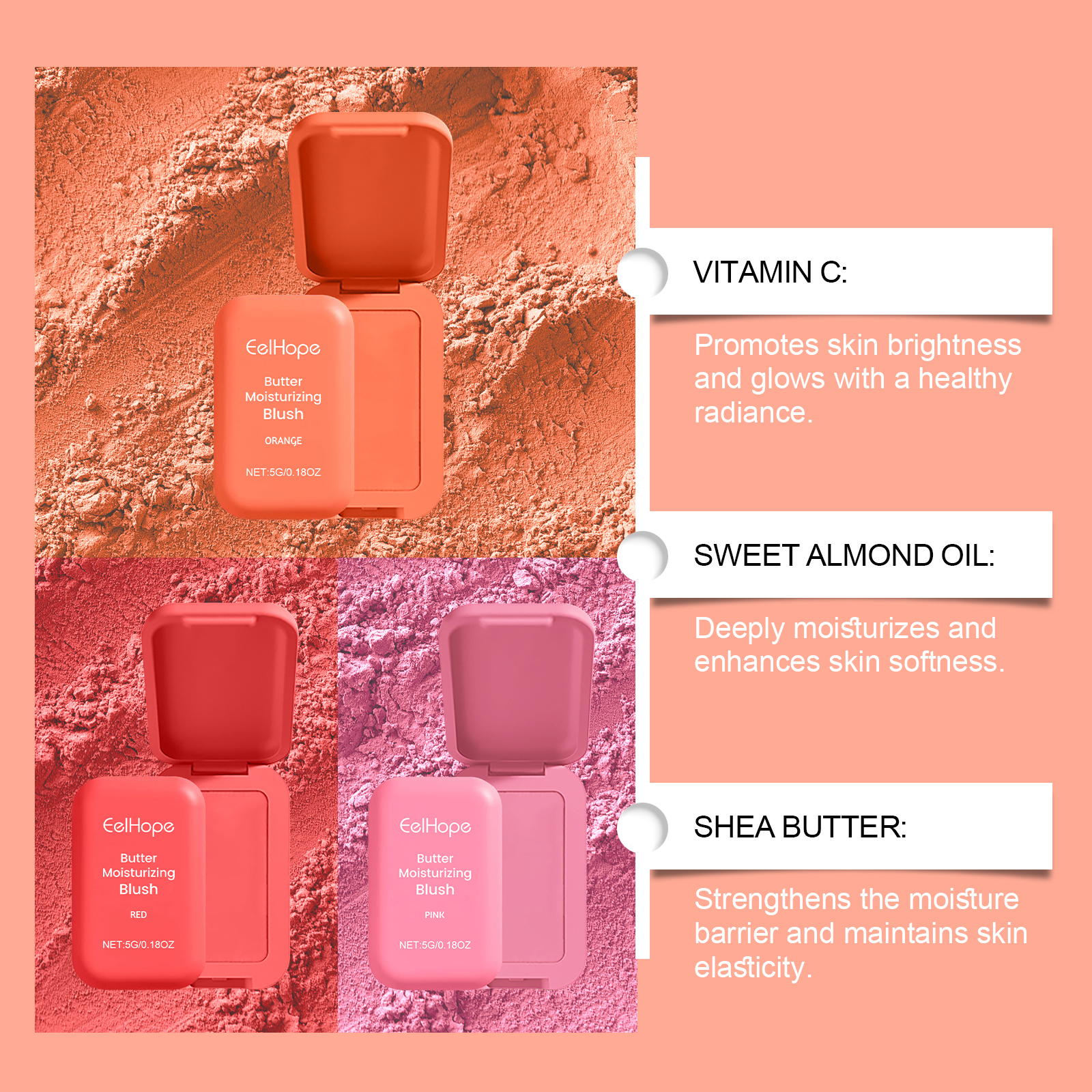 Our butter moisturizing blush contains mango extract, sweet almond oil, shea butter. It promotes skin glow and a healthy glow. Deep moisture, enhance skin softness; Enhance the moisturizing barrier and maintain skin elasticity. Its application is simple: apply blush lightly with a blush brush. Rich color, rejuvenate skin. Melted in the skin like butter, very docile.