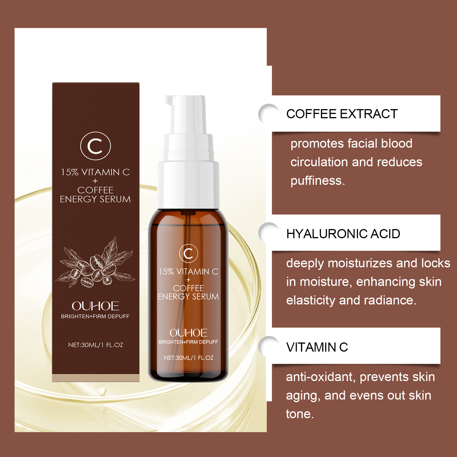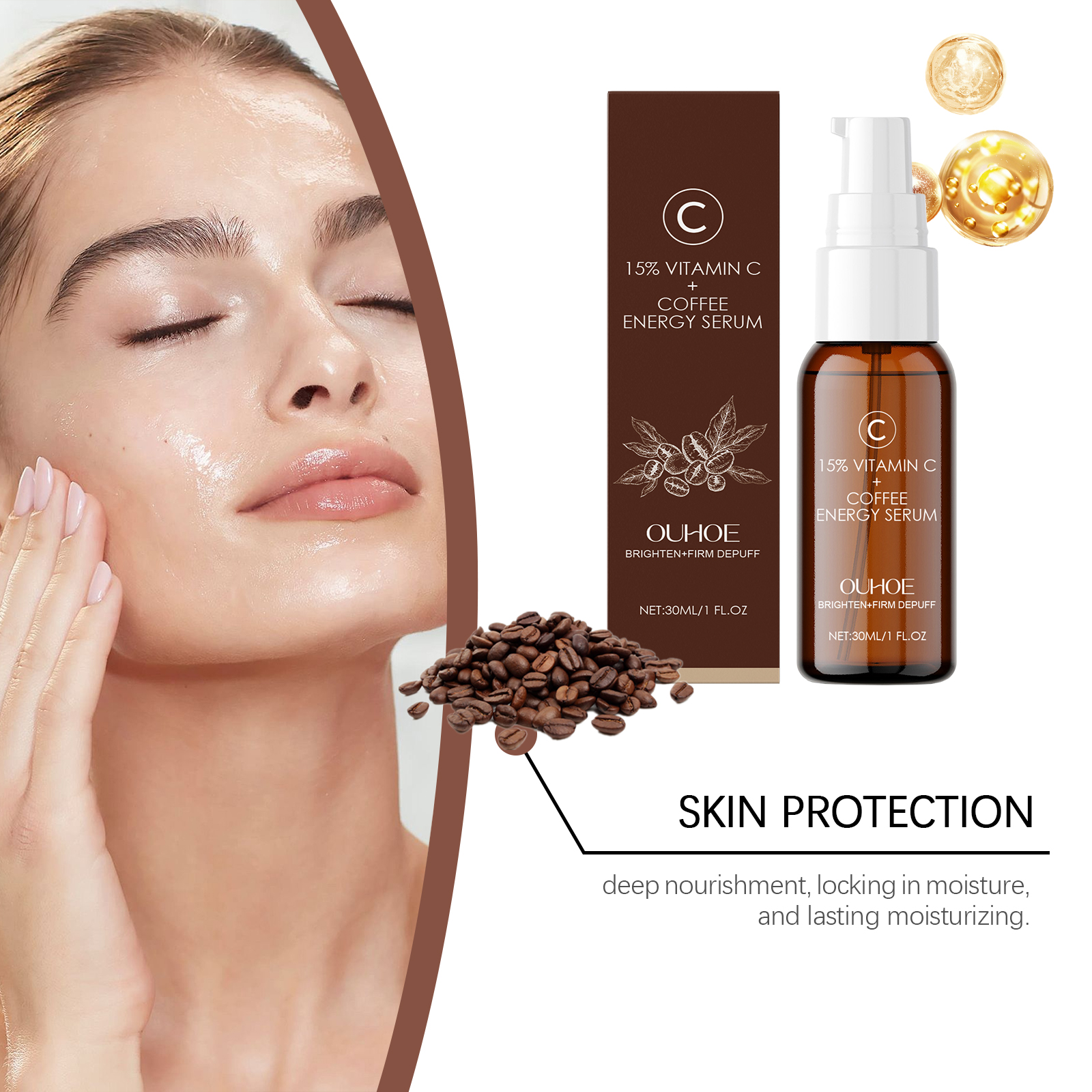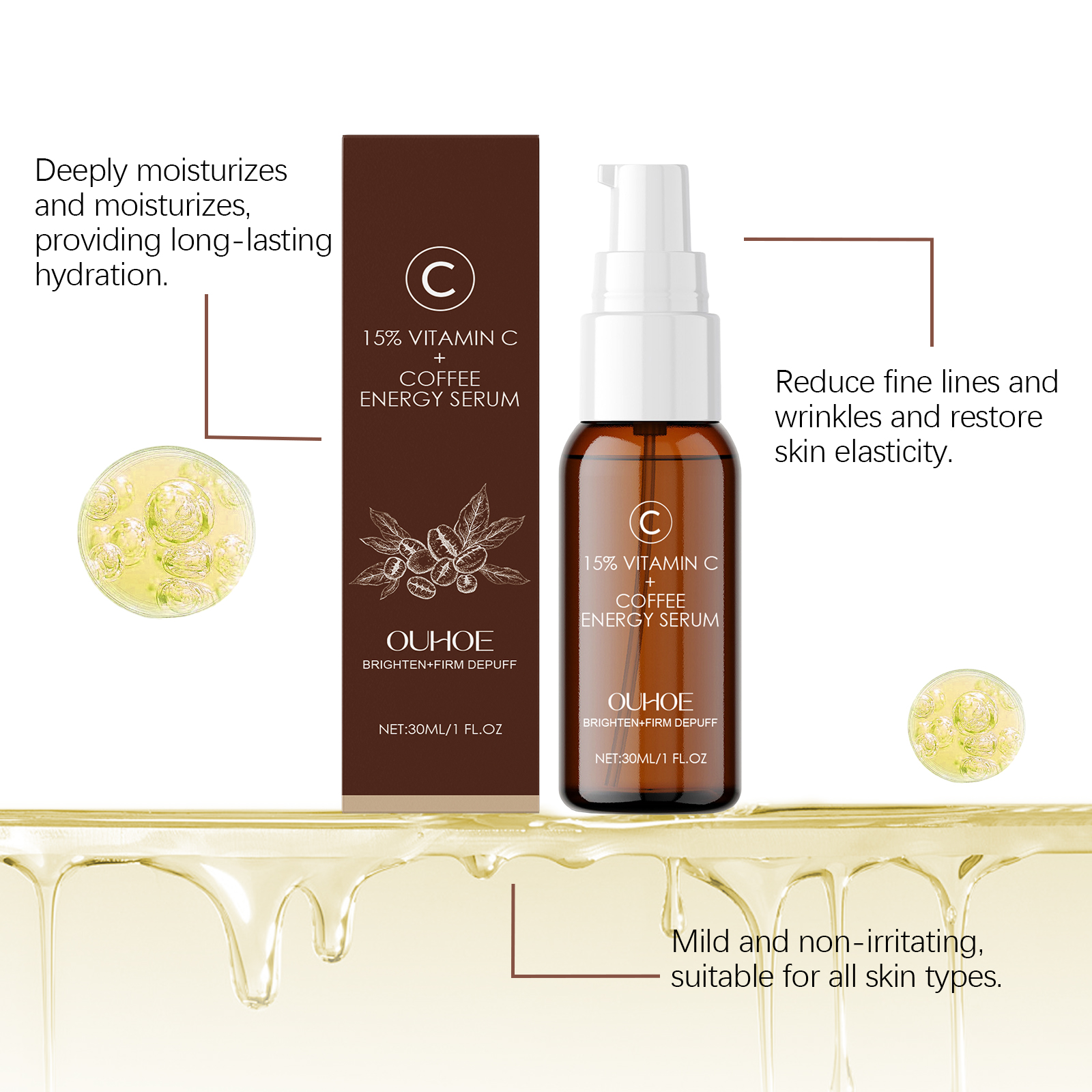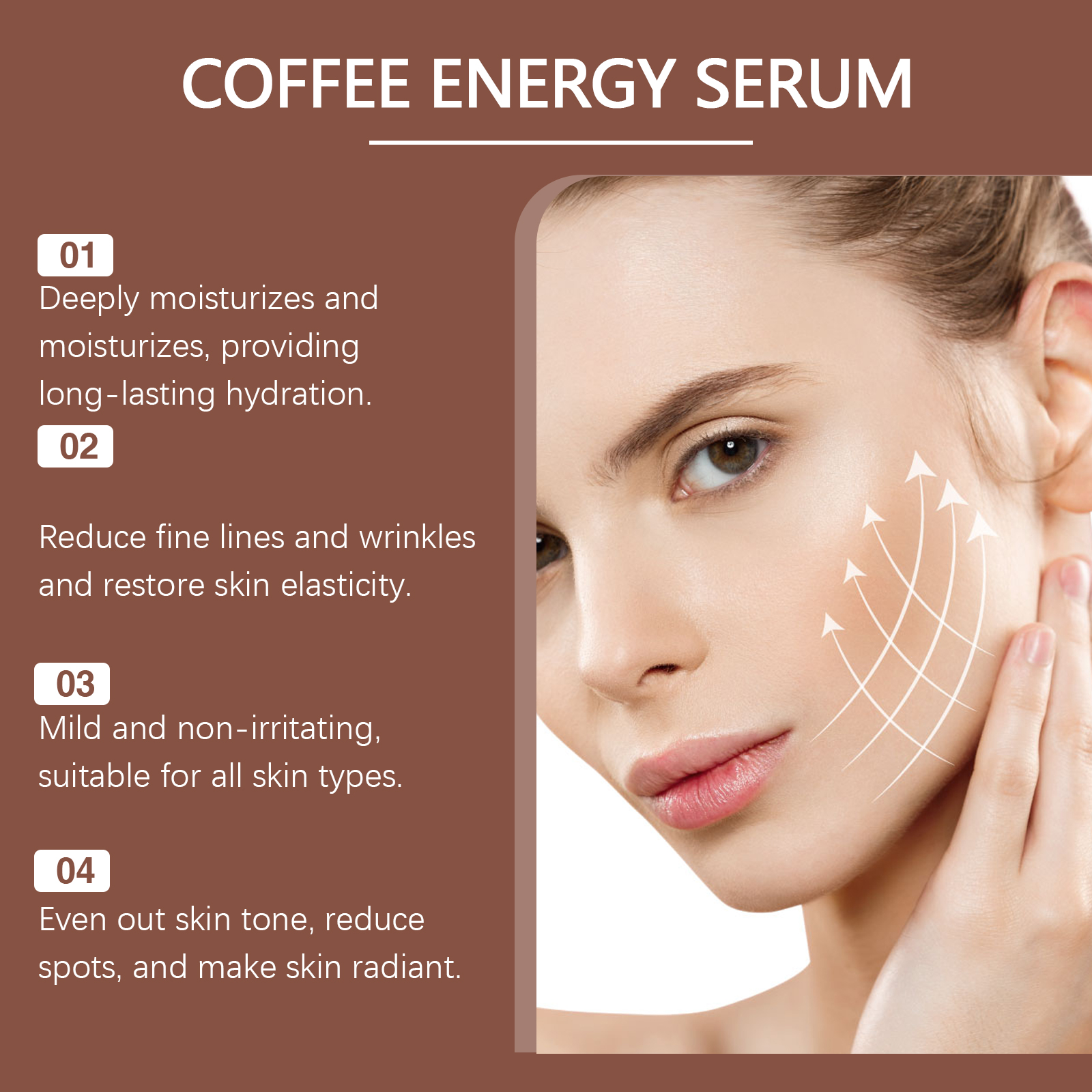 Our caffeine firming serum contains glycerin, coffee extract. It improves skin elasticity, helps reduce fine lines, and gives skin a firm glow. Deeply replenish skin moisture and keep skin soft and moisturized after use. The way to use it is simple: after washing your face, wipe your skin clean. Using the provided dropper, apply one third of the product to your face and gently massage in a circular motion with your hands to absorb. It can also improve skin elasticity, tighten skin, reduce fine lines and wrinkles, and keep skin young and energetic. Long-lasting moisturizing, penetrating deep into the skin, improving skin clarity and moisture.