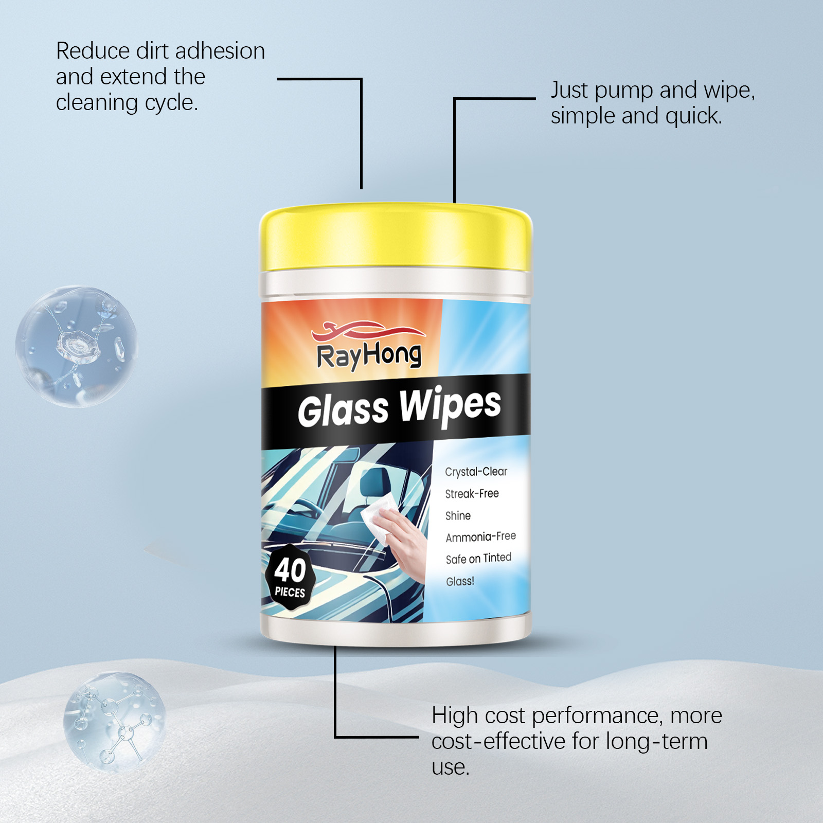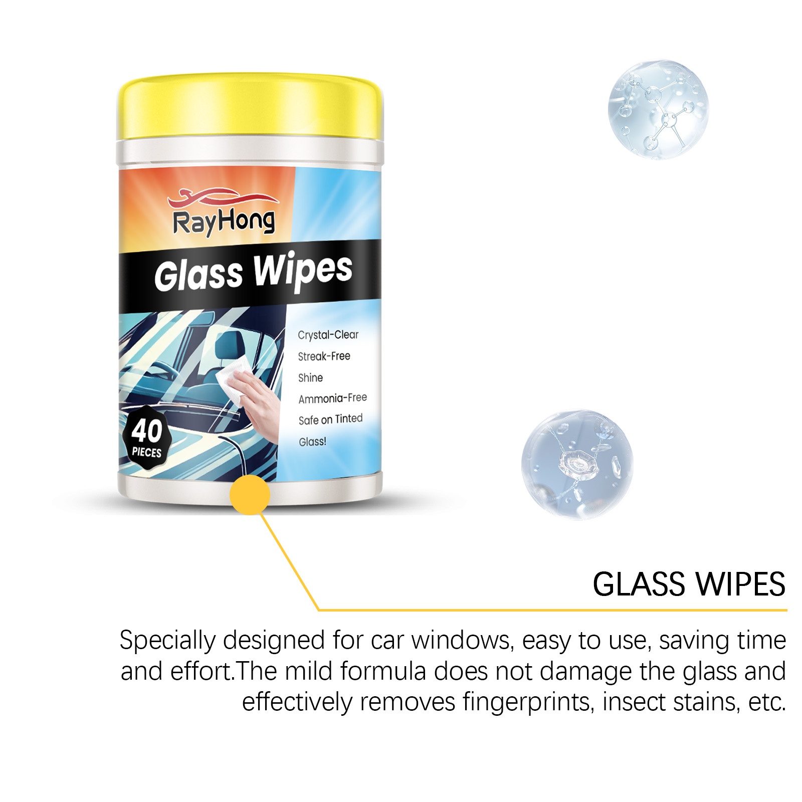 Our car glass cleaning wipes contain disodium EDTA, cocamidopropyl betaine, palm kernel oil amide DEA. It can effectively remove oil stains and dirt. Quickly restore glass transparency. Its use method is very simple: the first time to use, take a wet rag from the edge of the central drum gently pull out, close the lid tightly. Wipe the dirt off the surface of the glass with a damp rag. And can easily erase road dirt and film residue, keep the window clean.
