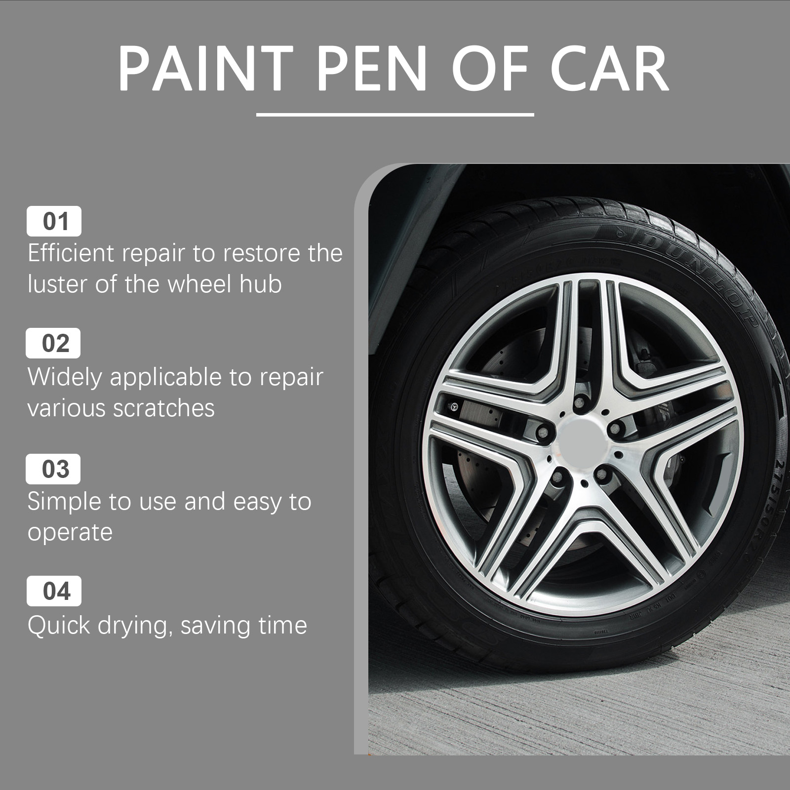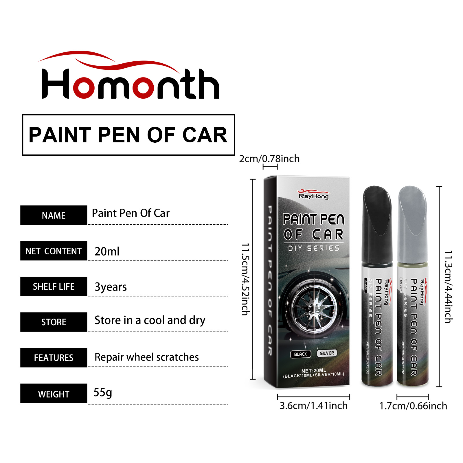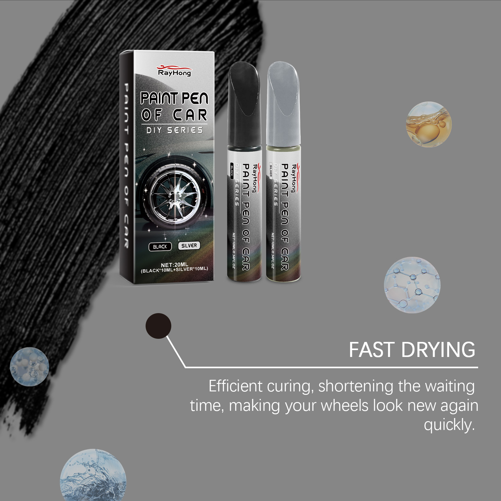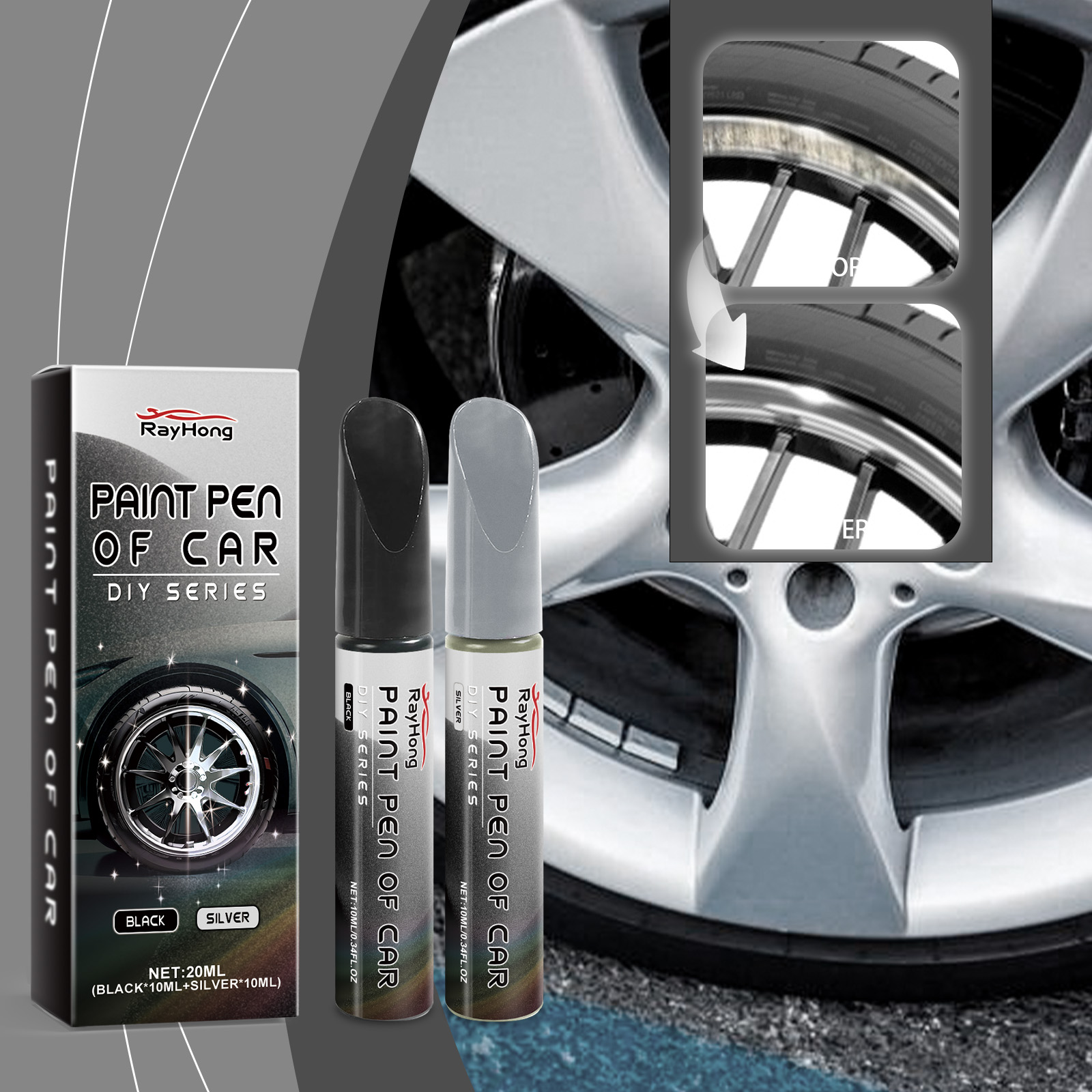 Our car wheel scratch pens contain acrylic resin emulsion, titanium dioxide. It can easily repair scratches and small dents on the wheel hub. The unique rust-proof and waterproof formula effectively protects the surface of metal, aluminum and steel rings. Its use method is very simple: 1. Clean the scratched area; 2. Before use, shake the repair pen to make the internal ingredients evenly mixed; 3. Apply repair solution to the scratch. 4. After applying the repair solution, let it dry naturally. The meticulous repair effect ensures that the surface is smooth and smooth, and maintains the overall beauty of the vehicle.
