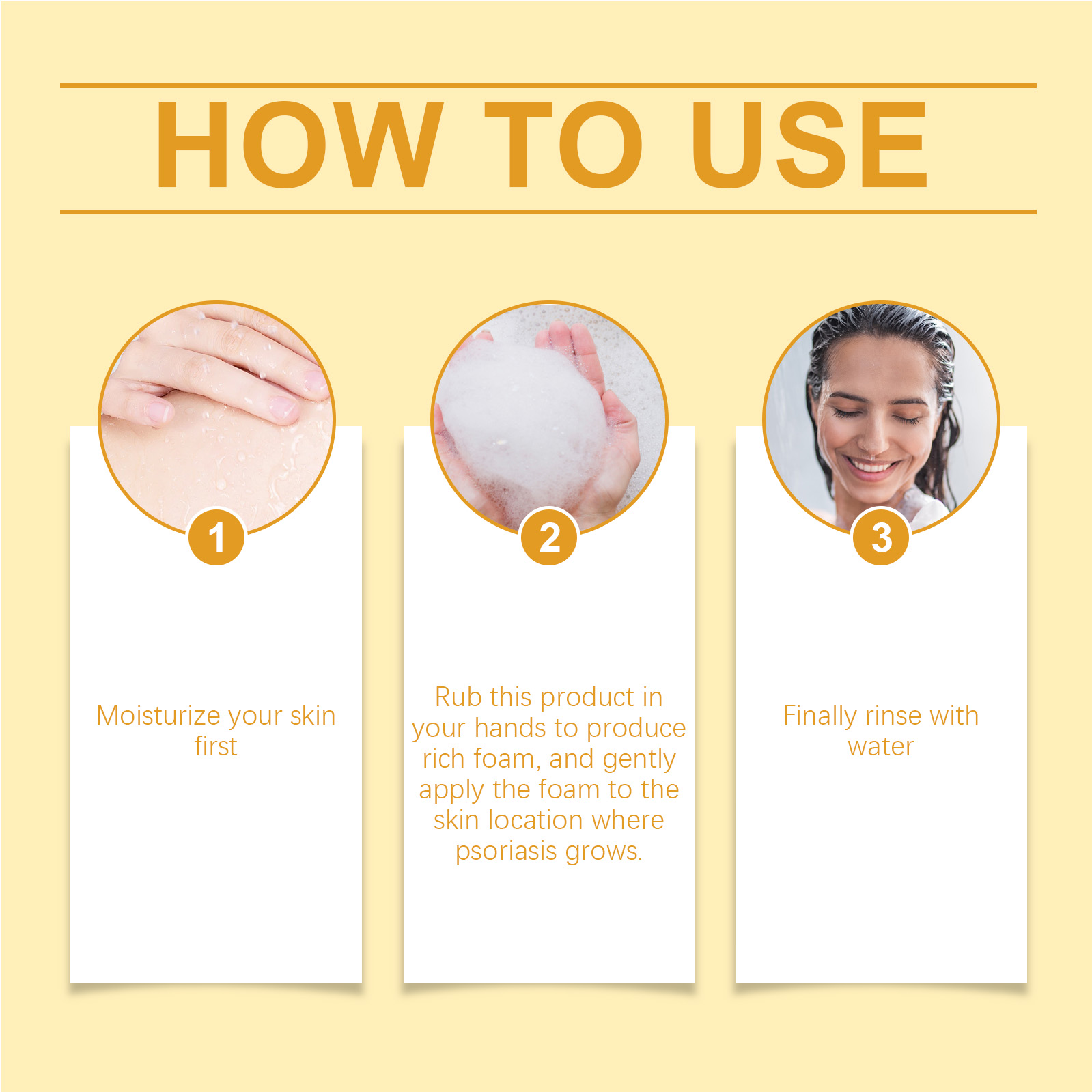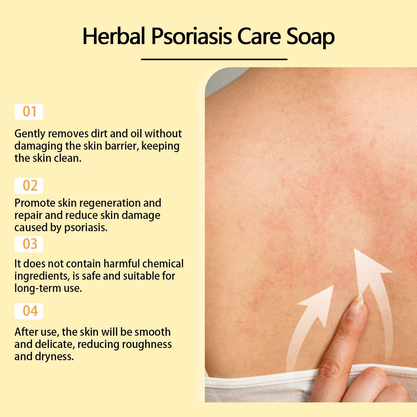 Our Herbal Psoriasis Care Soap contain Sapindus Mukorossi Fruit Extract, Ganoderma Lucidum(Mushroom) Extract, Cordyceps Sinensis Extract. It can gently remove dirt and oil, do not damage the skin barrier, keep the skin clean, promote skin regeneration and repair, reduce skin damage caused by psoriasis, after use, the skin will be smooth and delicate, reduce rough and dry. Its application method is very simple: first moisturize the skin, rub the product in the hand to produce a rich foam, and then gently apply the foam to the skin where the psoriasis is growing, and finally rinse off with water. It can effectively relieve skin itching and discomfort caused by psoriasis, and provide a comfortable use experience.