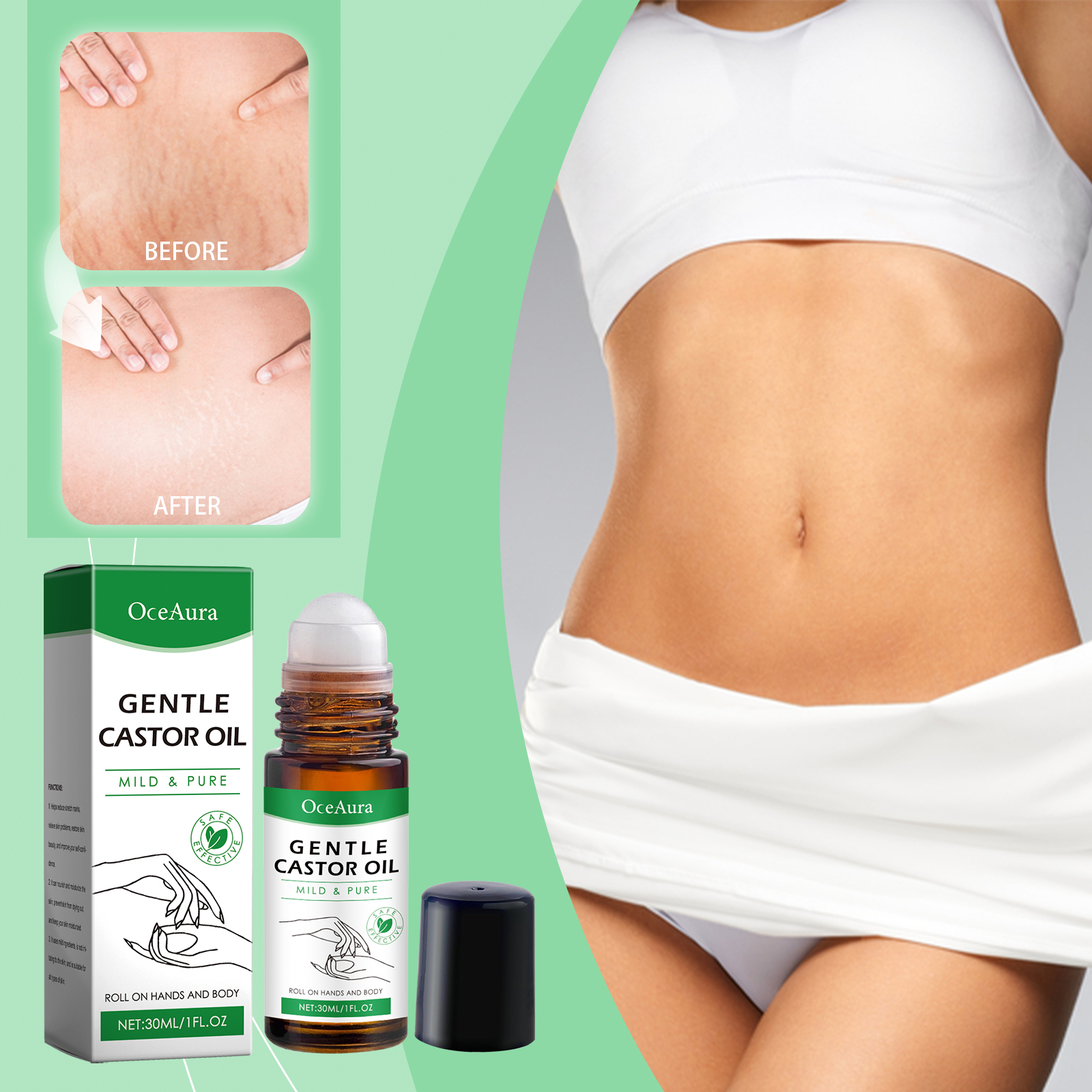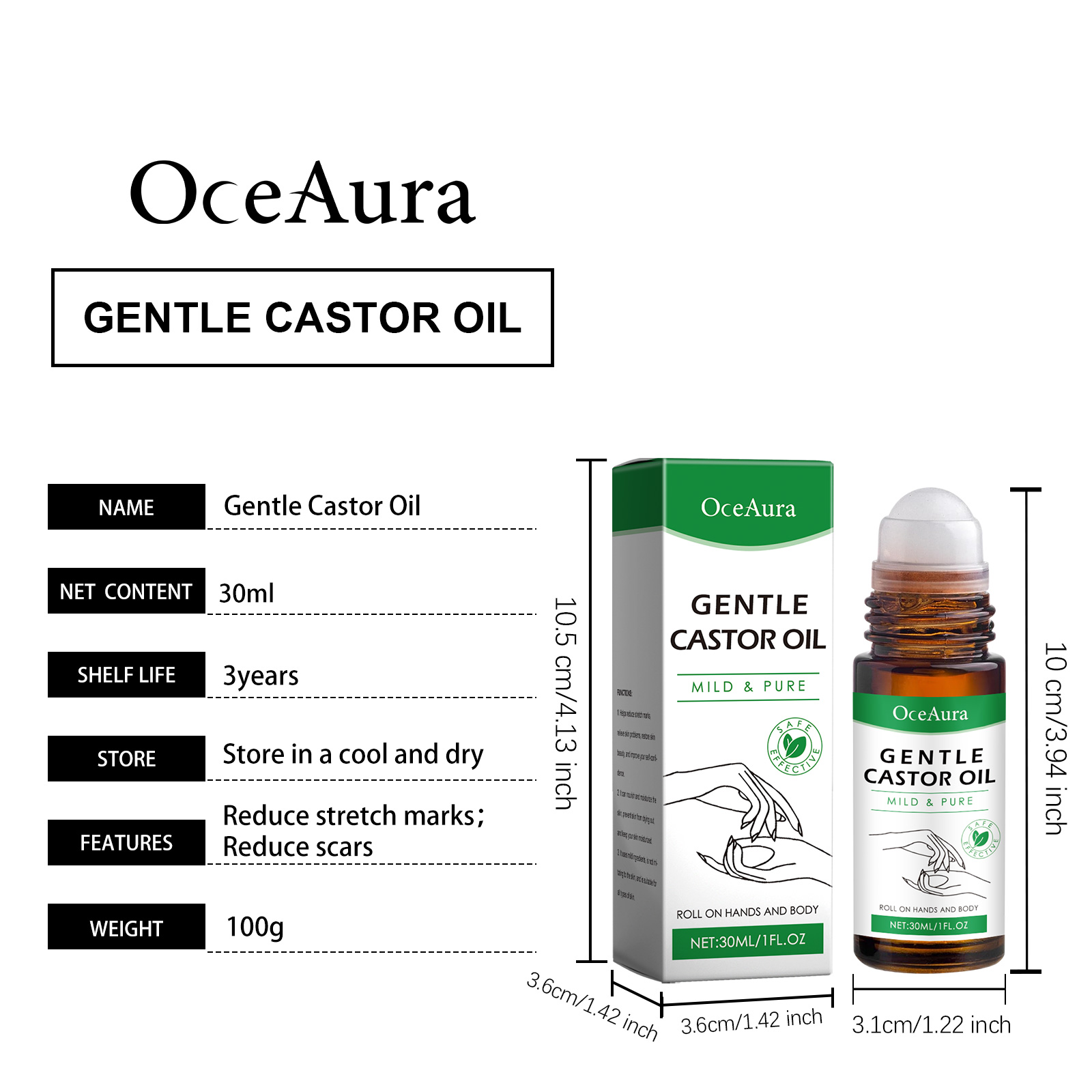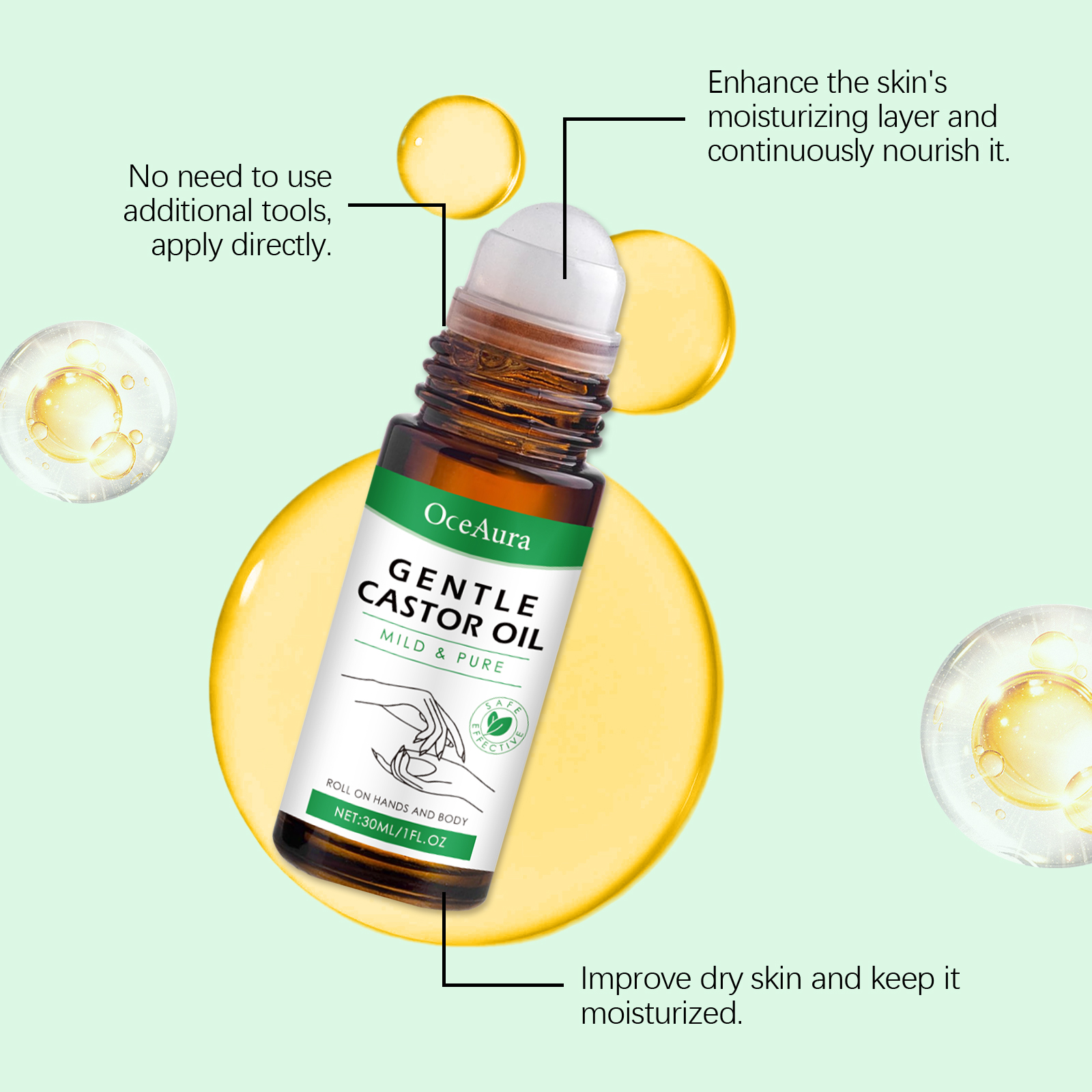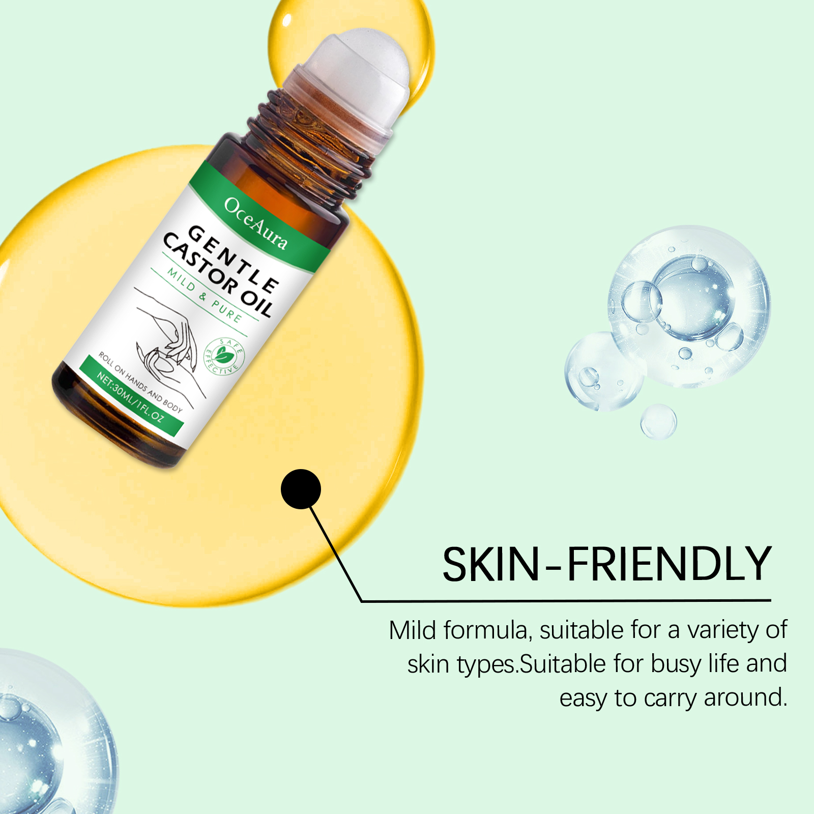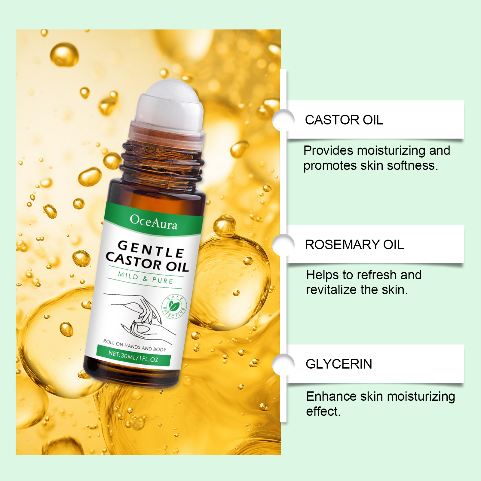 Our castor oil ball oil contains castor oil, rosemary oil, glycerin. It can provide moisture and promote soft skin. Helps rejuvenate the skin. Enhance skin moisturizing effect. Its use method is very simple: 1. Clean the skin of the body and hands, keep dry; 2. Apply proper amount of this product to the skin on hands and body using the built-in roller ball. 3. Gently massage until fully absorbed. Acts directly on the skin and moisturizes quickly. Moisturize skin and feel comfortable.