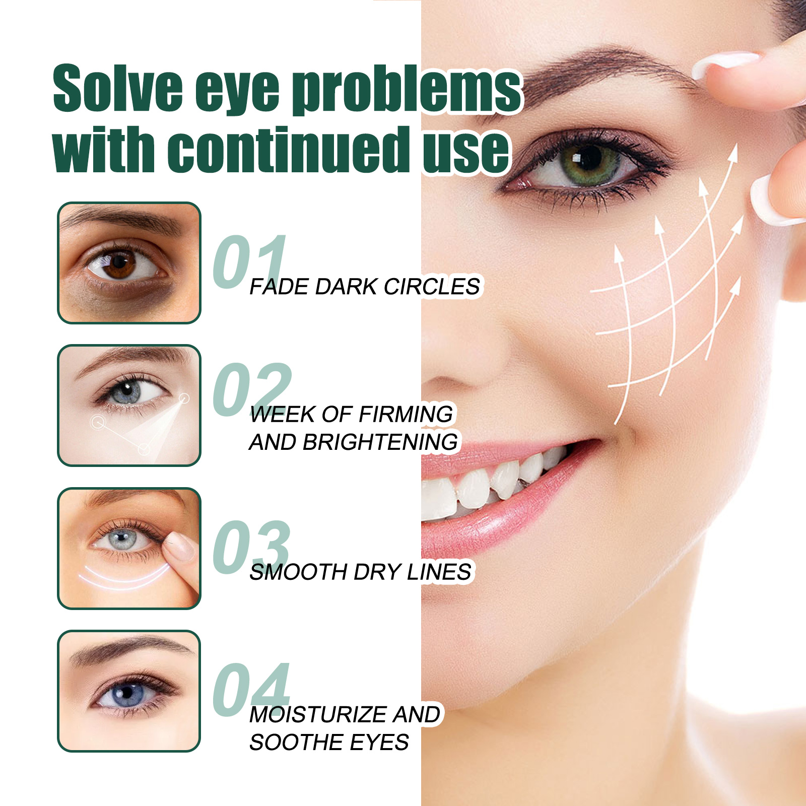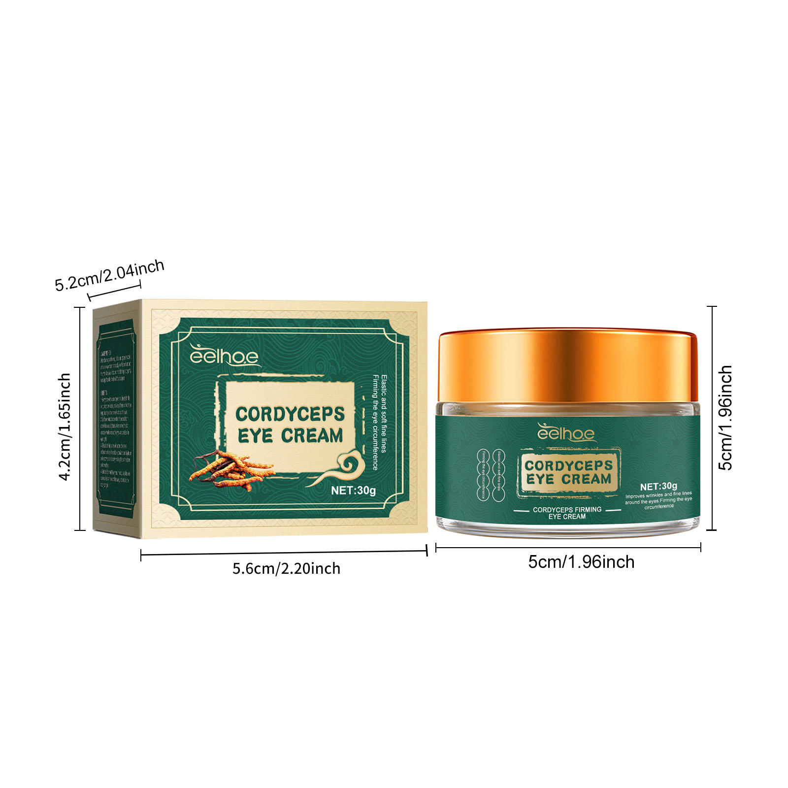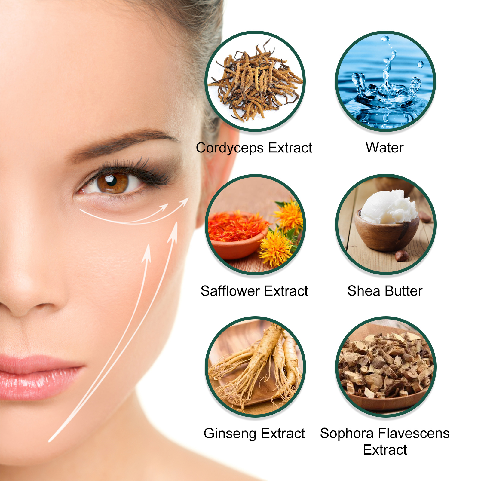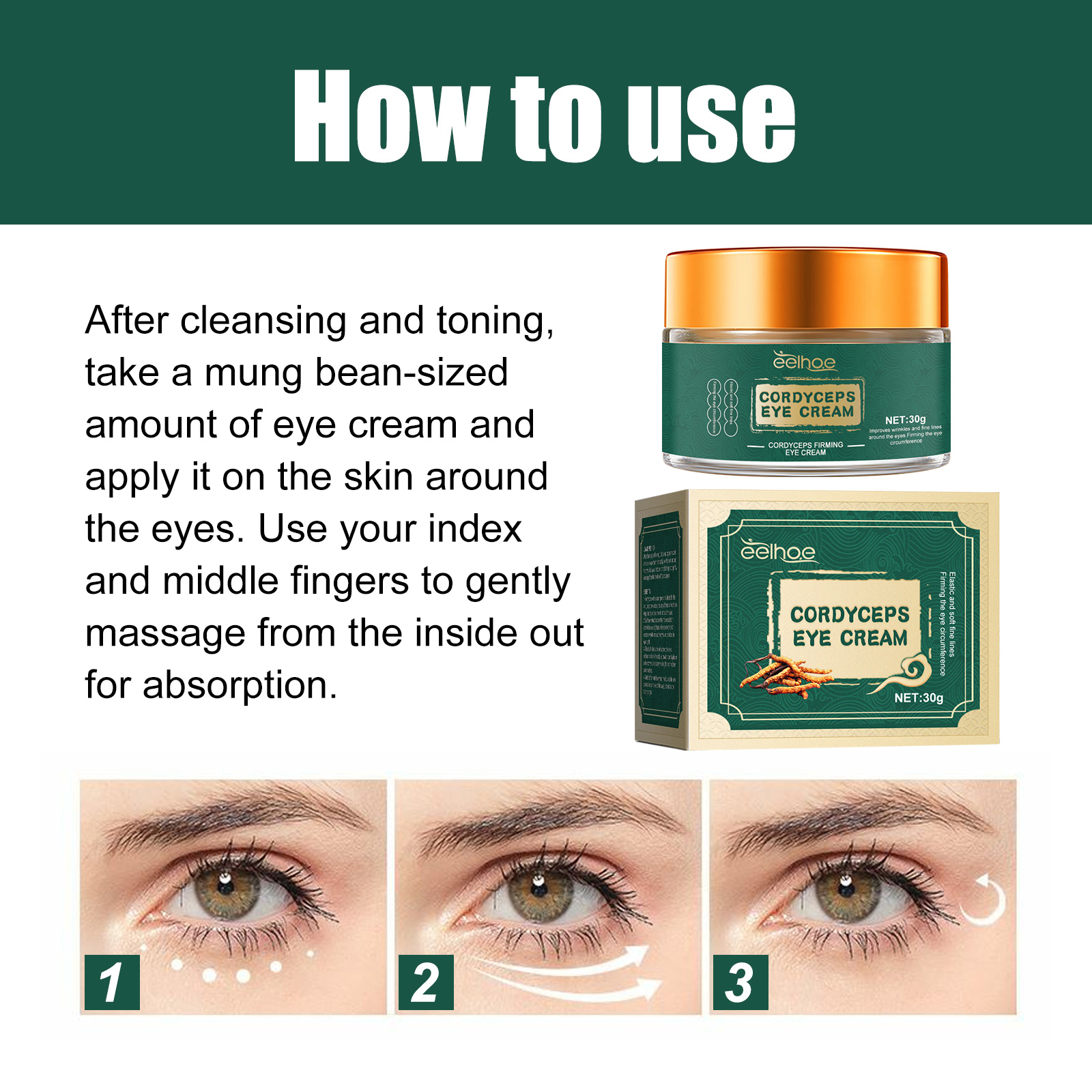 Our Cordyceps Eye Cream contains cordyceps extract, sophora flavescens extract, ginseng extract. It can fade dark circles, week of frming and brightening, smooth dry lines, moisturize and soothe eyes. Its application method is very simple: After cleansing and toning, take a mung bean-sized amount of eye cream and apply it on the skin around the eyes. Use your index and middle fingers to gently massage from the inside out for absorption. Pull up the eyelids, firming the eye circumference, improve eye circumference.