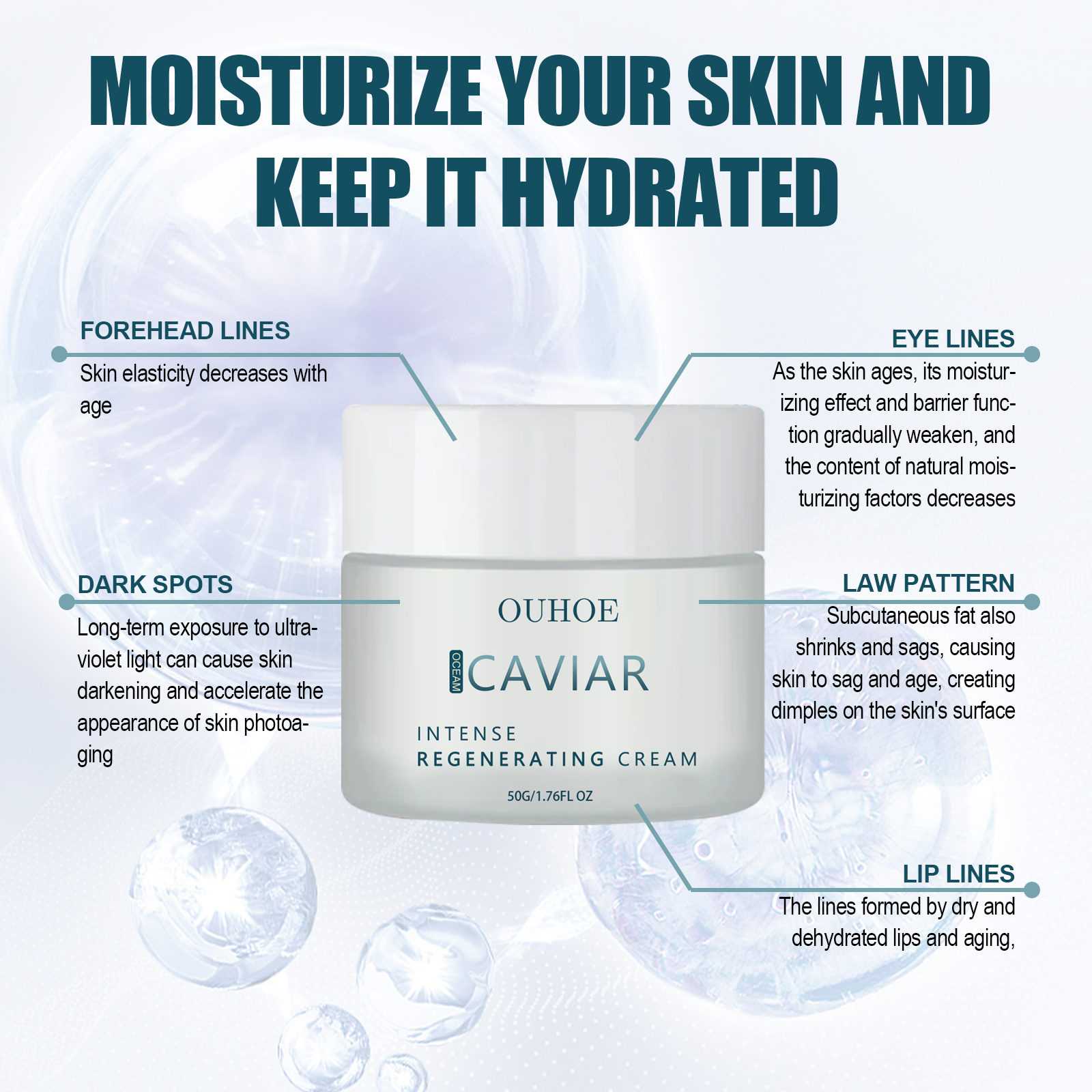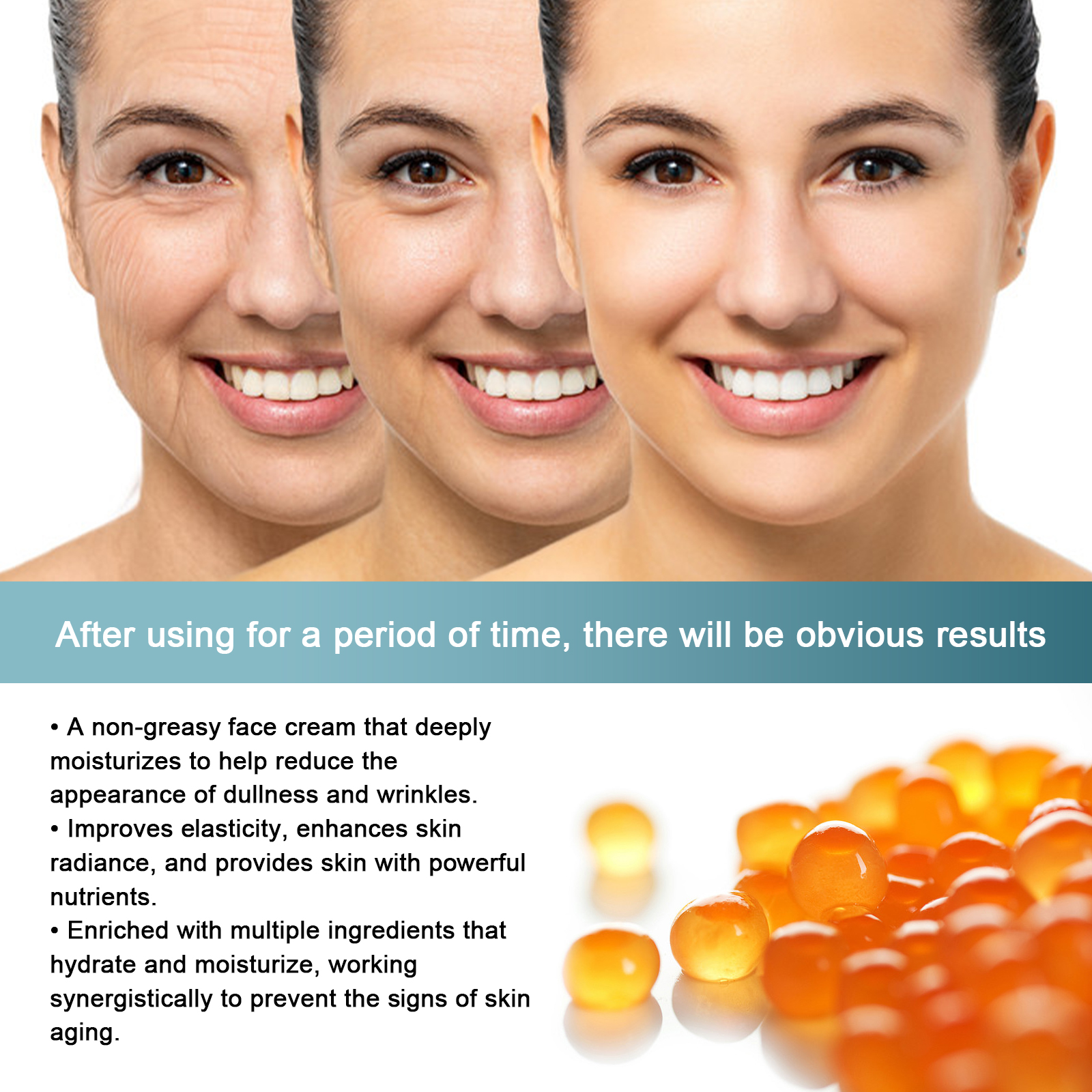 Our caviar Essence Revitalizing cream contains fatty acids, vitamin C, collagen. It deeply moisturizes, helps reduce the appearance of dullness and wrinkles, and provides powerful nutrients to the skin. Rich in hydrating ingredients that work together to prevent signs of skin aging. Its use method is very simple: first clean the face, wipe off the excess water stains on the face, then apply appropriate amount of this product evenly on the face skin, massage along the cheeks, and then massage the neck together to assist absorption until it is completely absorbed. After use, it helps to improve skin elasticity, deeply nourish skin, lighten skin tone, tighten skin and enhance skin luster.