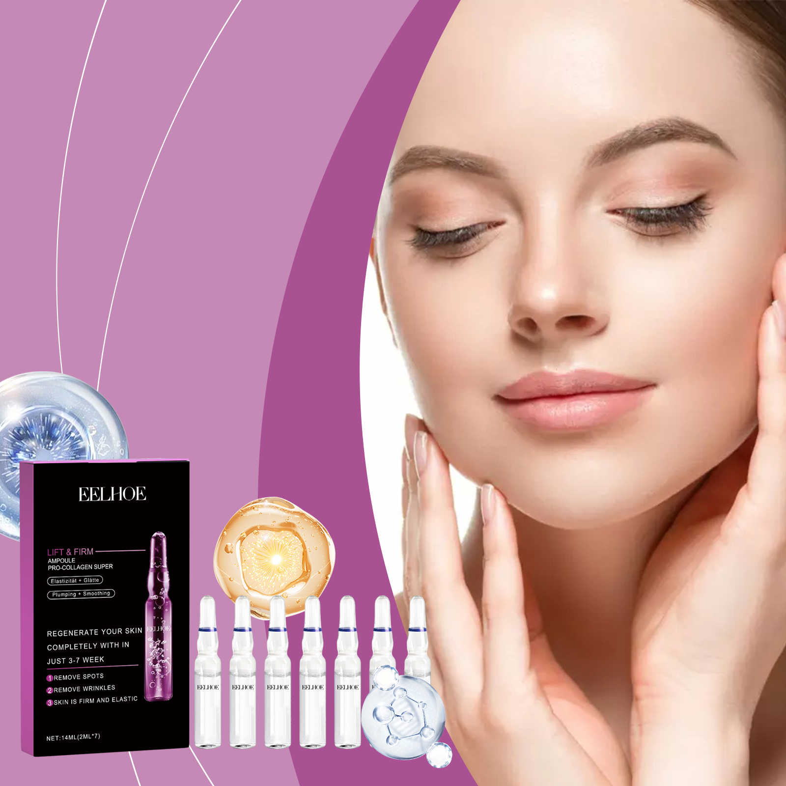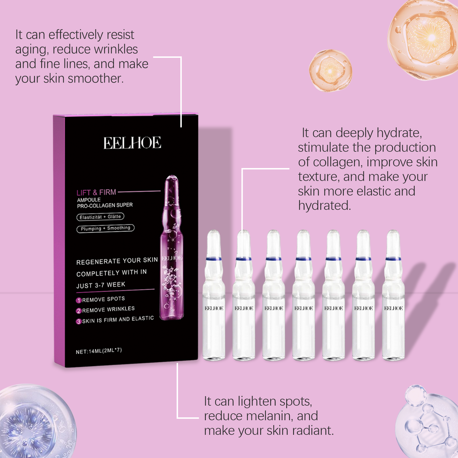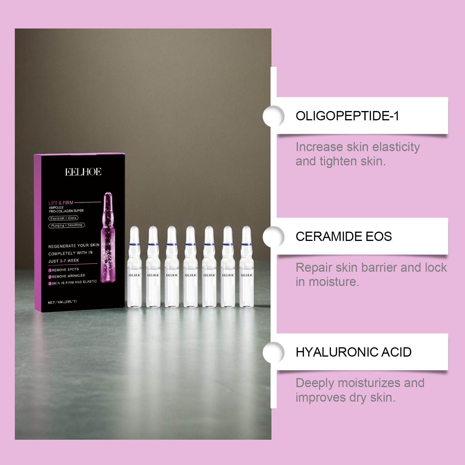 Our ceramide ampoule essence contains glycerin and hydroxyethyl cellulose. It can significantly improve wrinkles and fine lines; Provides deep and long-lasting moisturizing effect. Its use is simple: 1. Completely clean and dry skin. 2. Evenly apply the essence in ampoules to face, neck and shoulder skin. 3. Massage gently to promote better absorption. Use mild ingredients, safe and non-irritating. Use regularly to reduce the appearance of wrinkles and fine lines.