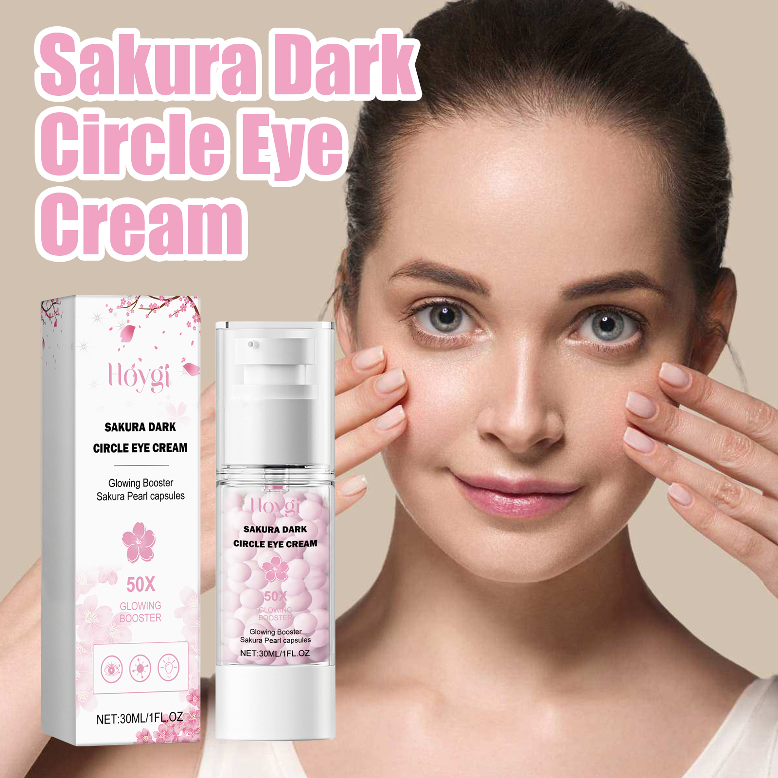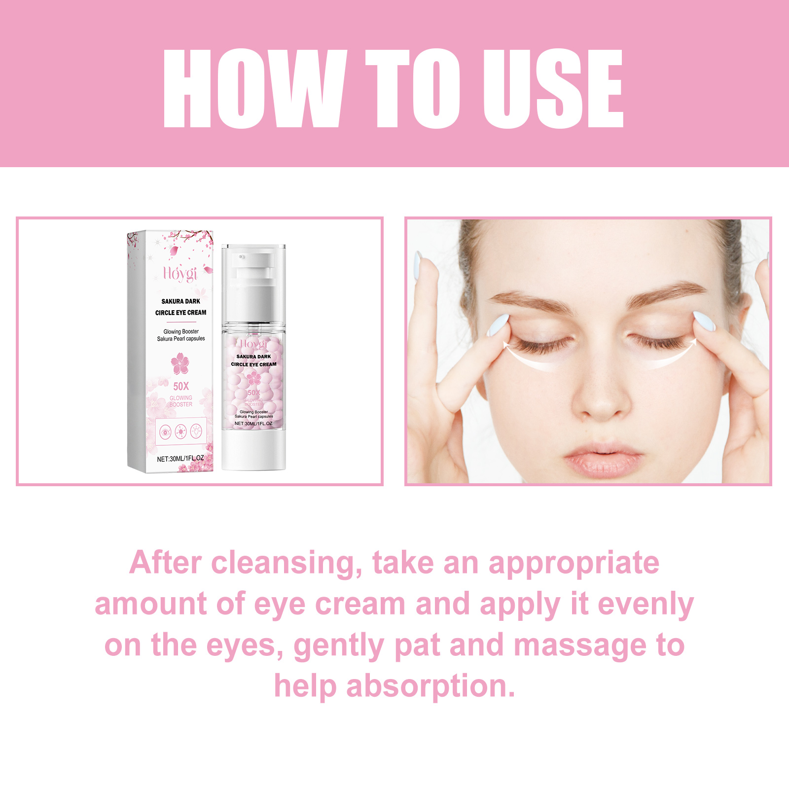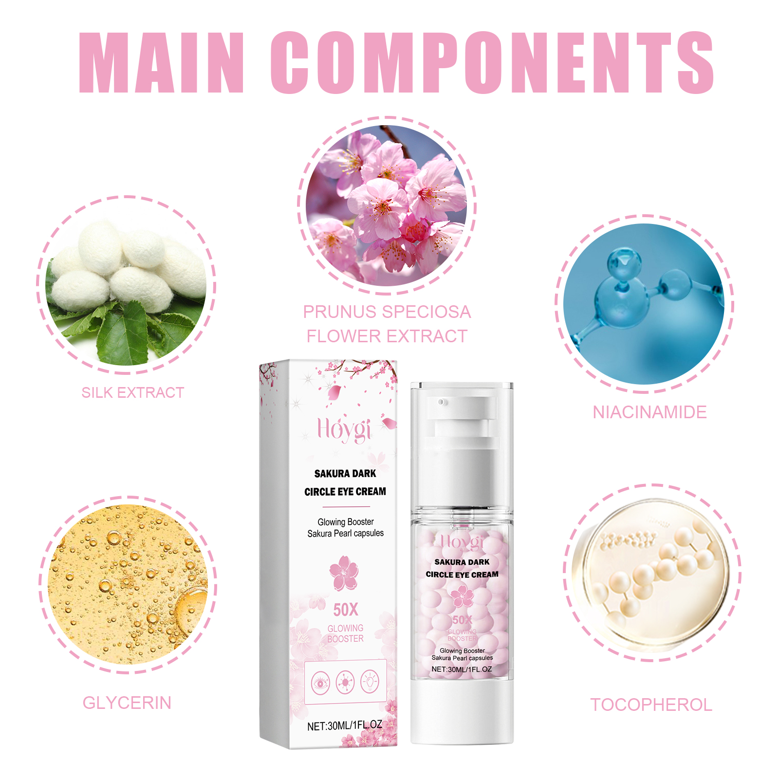 Our Sakura Dark Circle Eye Cream contains Silk Extract, Glycerin, Prunus Speciosa Flower Extract. It can effectively remove dark circles around the eyes, reduce dark and dull around the eyes, brighten the eyes, moisturize, moisturize and protect the skin around the eyes, help moisturize the dry and dehydrated eye skin, and make the skin around the eyes moist, firm and elastic. Its application method is very simple: after cleansing, take appropriate amount of eye cream evenly apply to the eye skin, gently pat and massage to help absorption. It can replenish the moisture needed by the skin, leaving the skin hydrated, delicate and smooth.