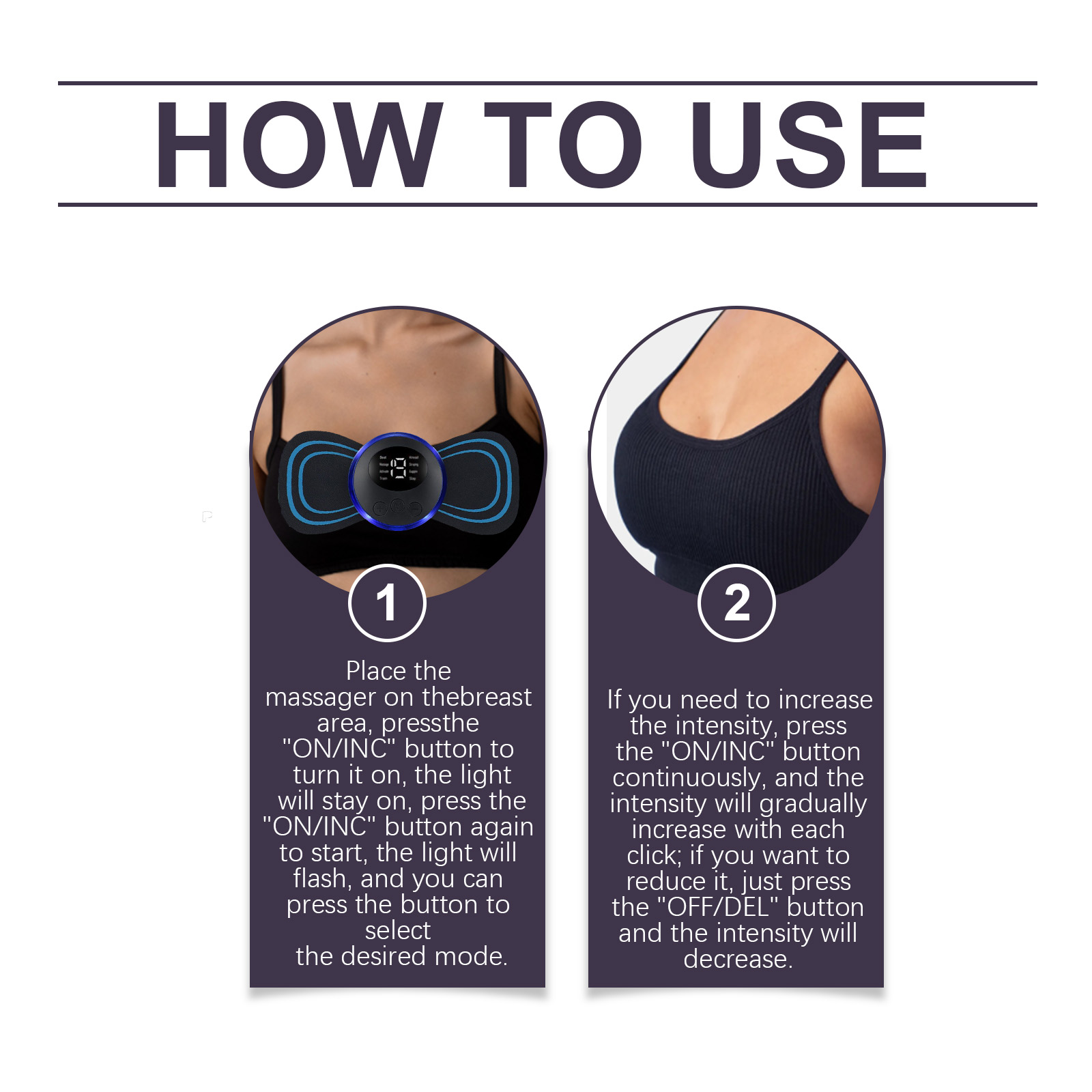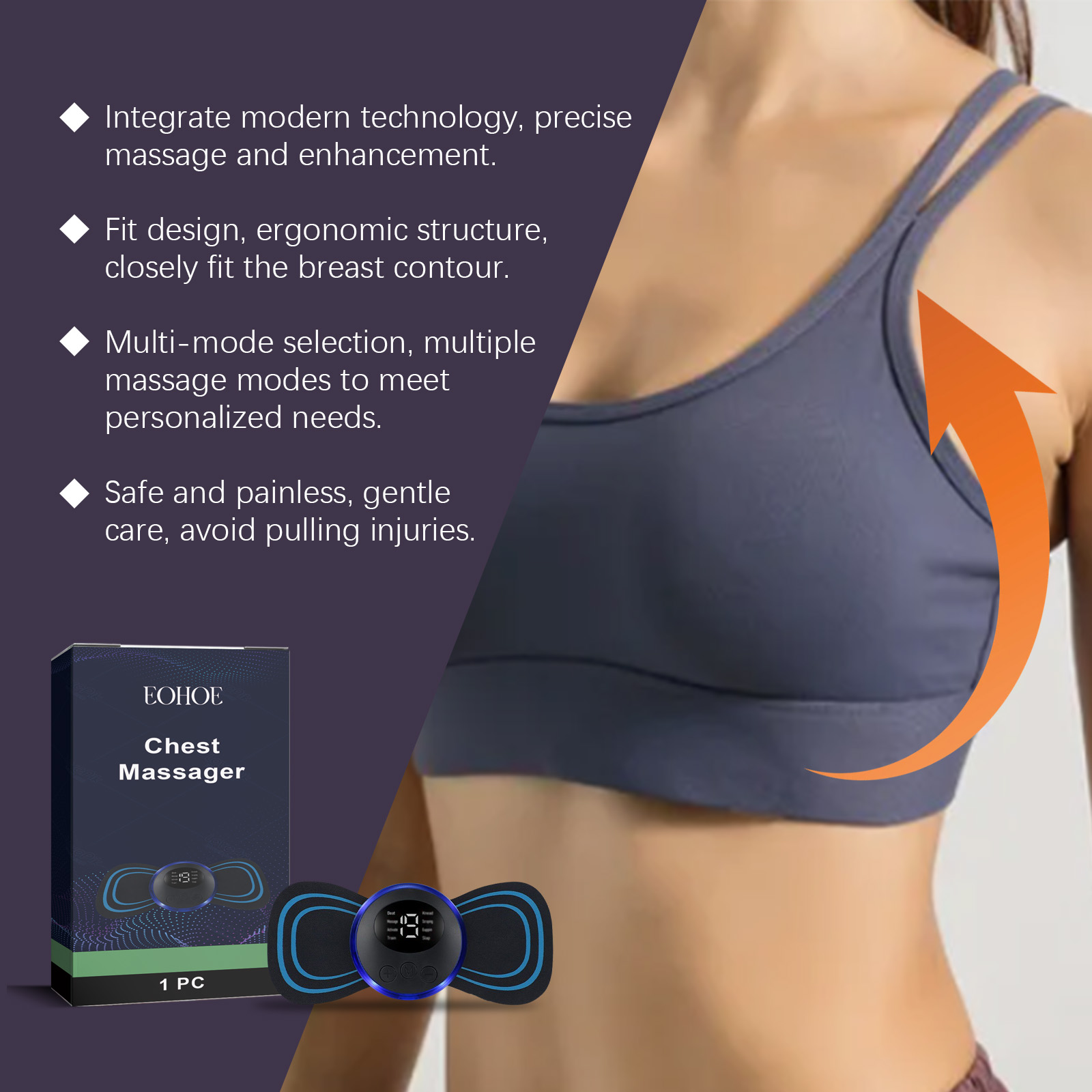 Our anti-sagging chest massagers contain ABS, leather. It incorporates modern technology for precise massage enhancement. Fit design, ergonomic construction, tight to the chest profile. Choice of multiple modes. A variety of massage methods to meet individual needs; Safe and painless, gentle care to avoid strain. Its use method is very simple: 1. Put the massager on the chest, press the "on /INC" key to start, the light is on, press the "theON/INC" key to start, the light is on, press the button to select the required mode. 2. If you need to increase the strength, you can continue to press the "on/off" key, each time, the strength will gradually increase; If you want to lower it, just press the "off/Delete" key and the intensity will be reduced. Breast anti-sag massager progressive lifting technology to reshape breast lines. Accelerate blood flow and enhance skin vitality.