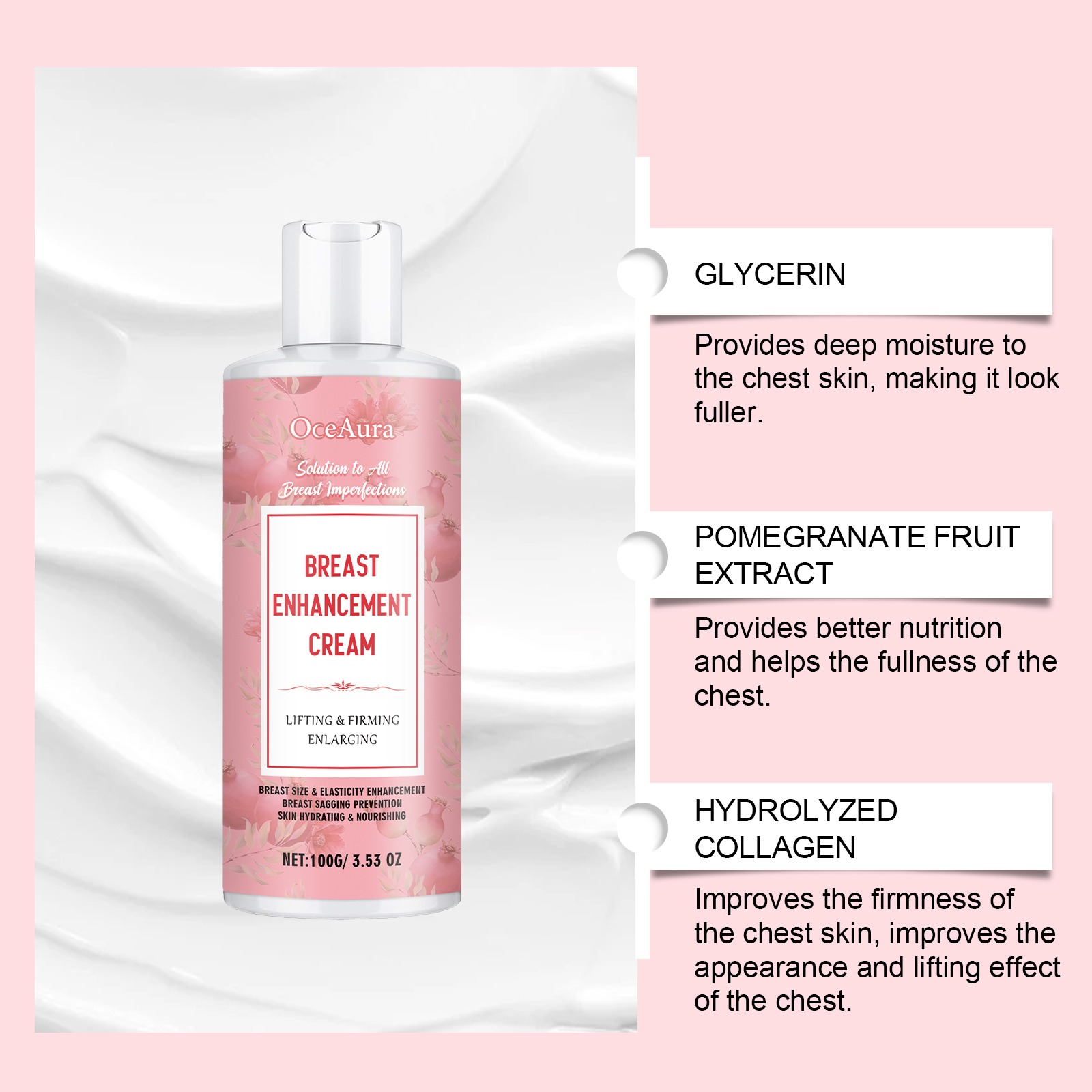 Our chest nourishing cream contains mineral oil, glycerin stearate, carbomer. It deeply moisturizes the skin and stays moisturized for a long time. Lighten the skin evenly and make the skin more even and bright. The way to use it is simple: 1. Clean the chest skin and keep it dry. 2. Apply appropriate amount of the product evenly on the chest skin, gently massage until absorbed. Light texture, soft touch.