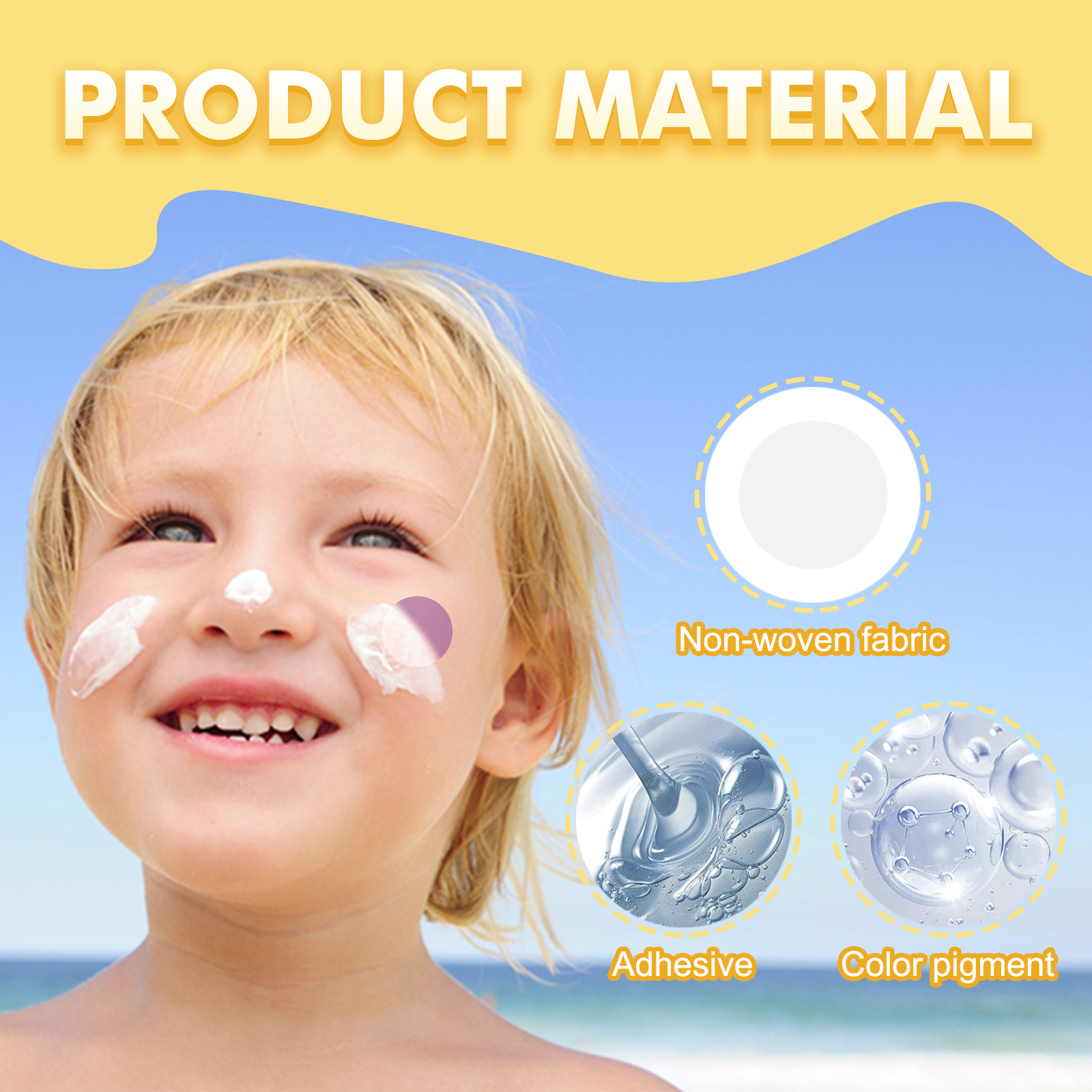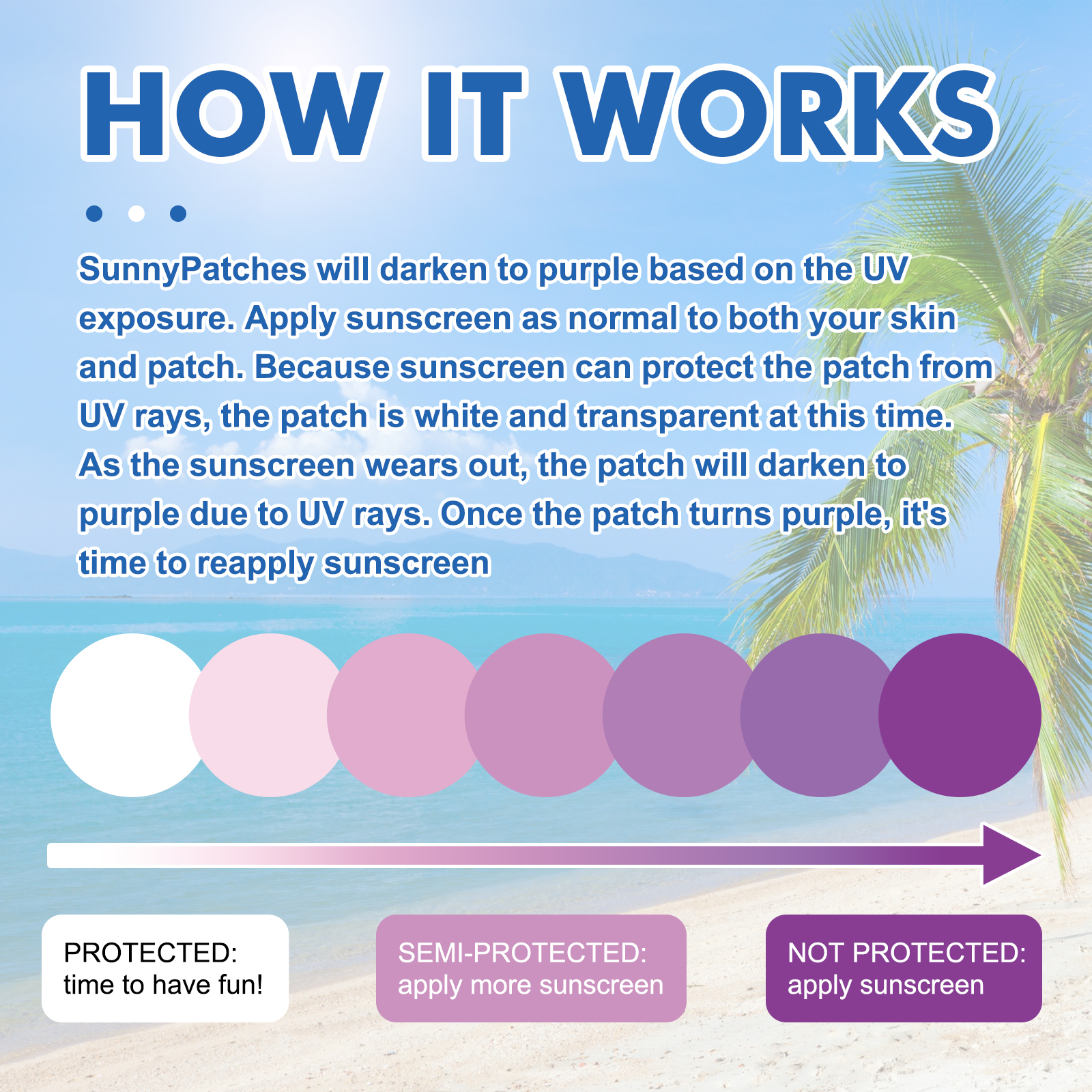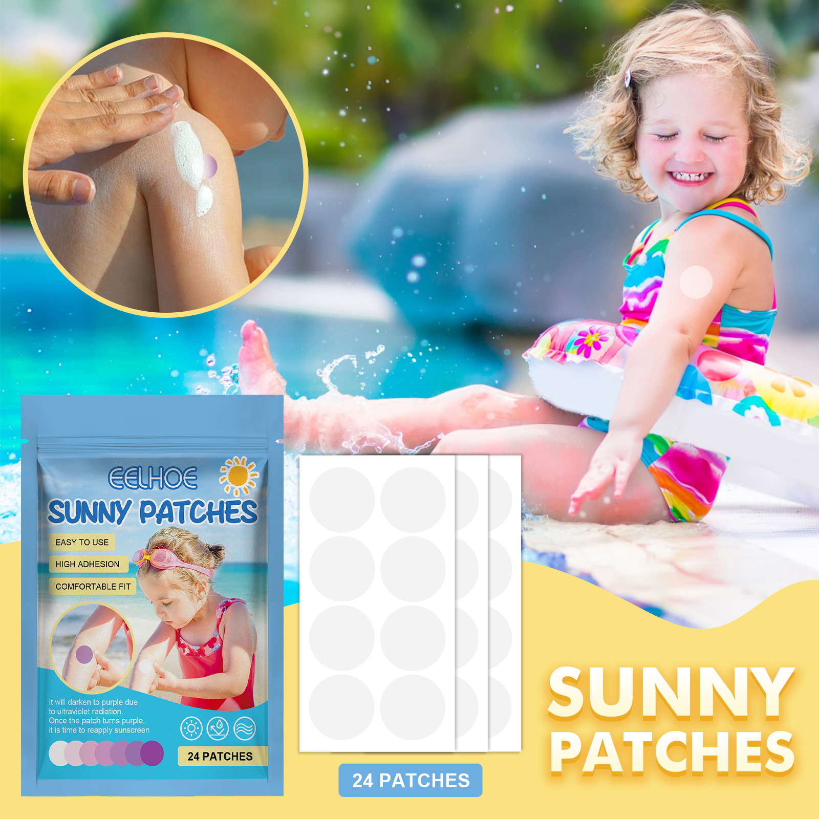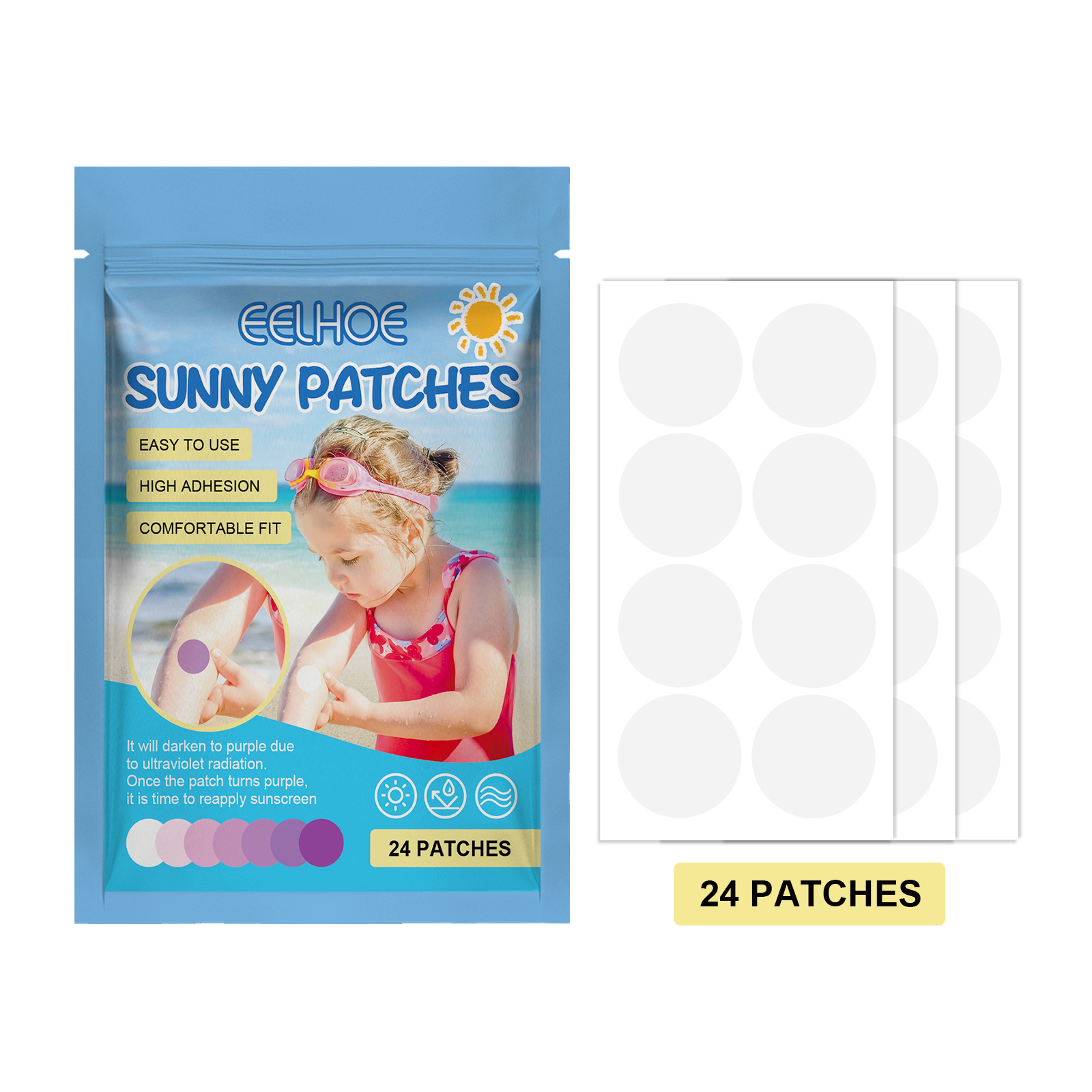 Our UV patches for children and adults contain an adhesive, color-changing pigment, which prevents suntanning. Its application is simple: 1. Apply the patch to your child's skin, 2. Apply the appropriate amount of sunscreen to fully cover the patch and skin, 3. Once the patch turns purple, it's time to reapply sunscreen. And you can put it on. It's cool.、