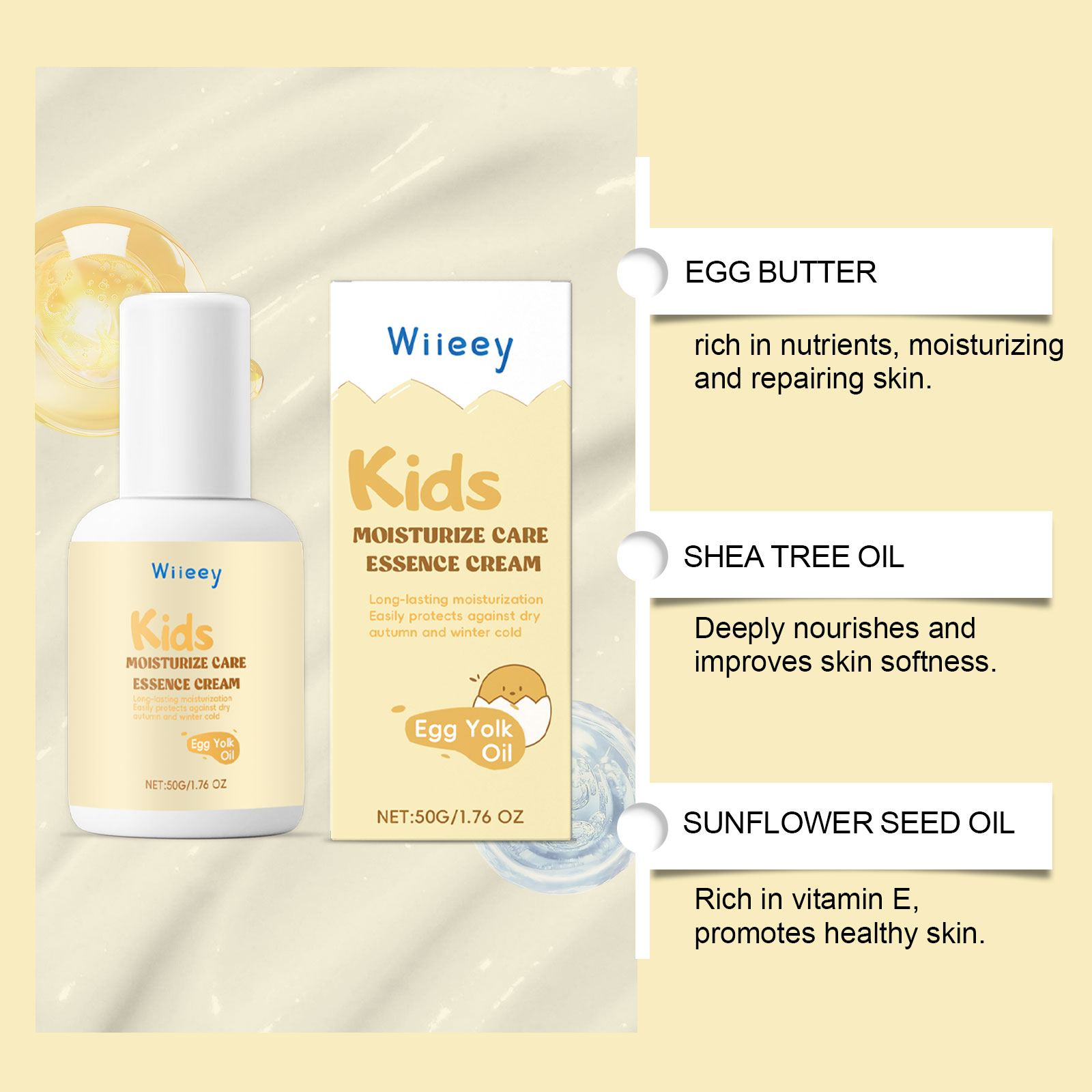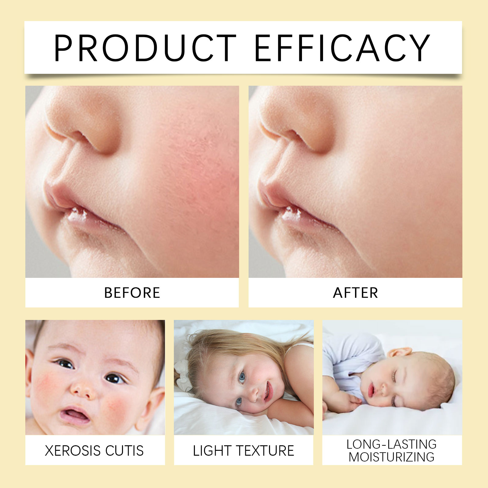 Our children's moisturizing cream contains wheat germ oil, sodium hyaluronate. It can be designed for children's skin gentle, non-irritating, safe and reliable. Its use method is very simple: take appropriate amount of this product, evenly apply to the child's face and body skin, and gently massage until absorbed. It can effectively nourish the face and moisturize the skin.