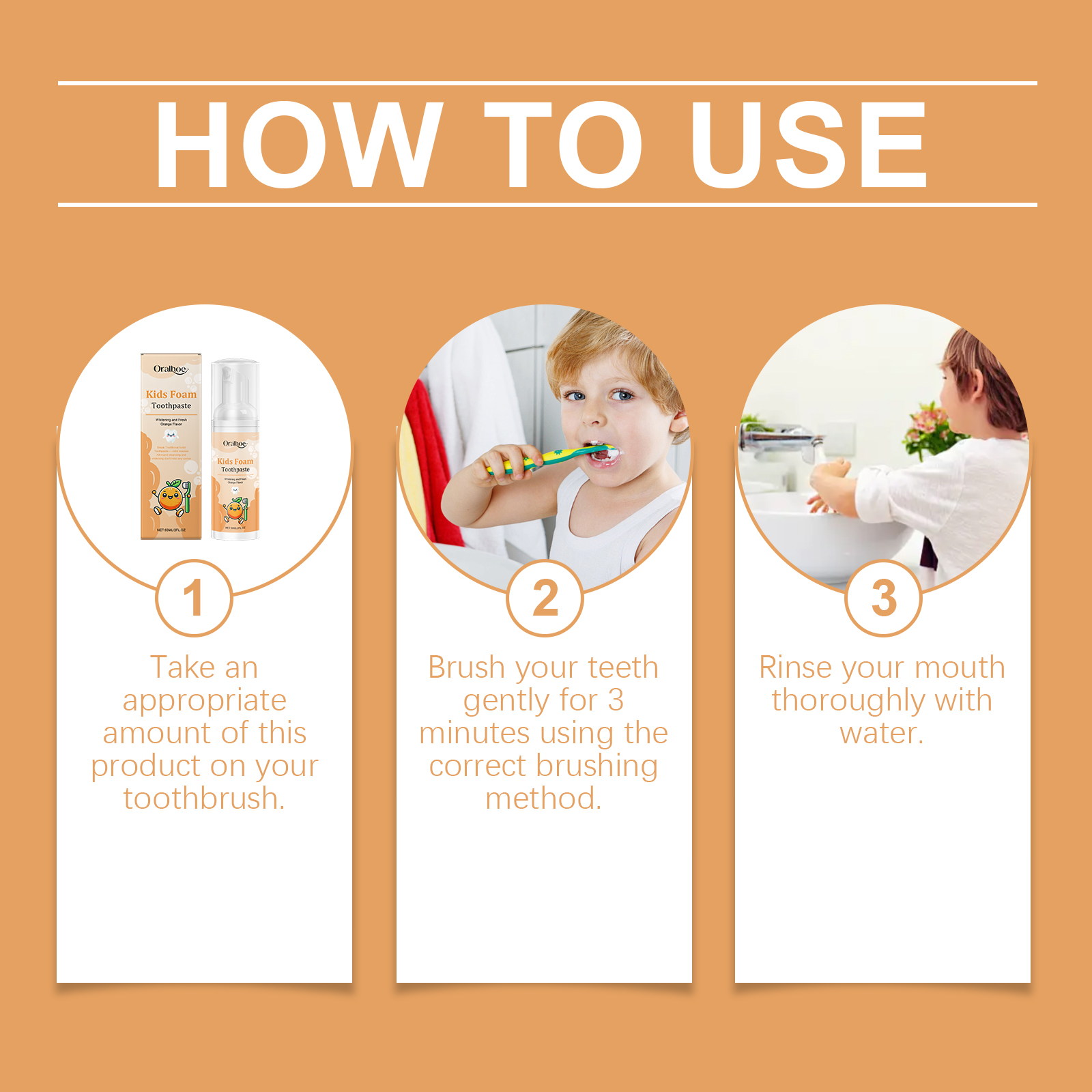 Our children's dental mousse contains glycerin, peppermint extract. It can help keep the mouth clean and improve overall oral hygiene. Full coverage of teeth, effective cleaning of tooth surfaces and crevices. The way to use it is very simple: take a proper amount of this product and apply it to the toothbrush. Brush your teeth gently with proper brushing methods for 3 minutes and rinse your mouth thoroughly with water. And can children love to use it more, improve the cleaning effect. Lightweight and portable design to keep children's mouths clean anytime, anywhere.