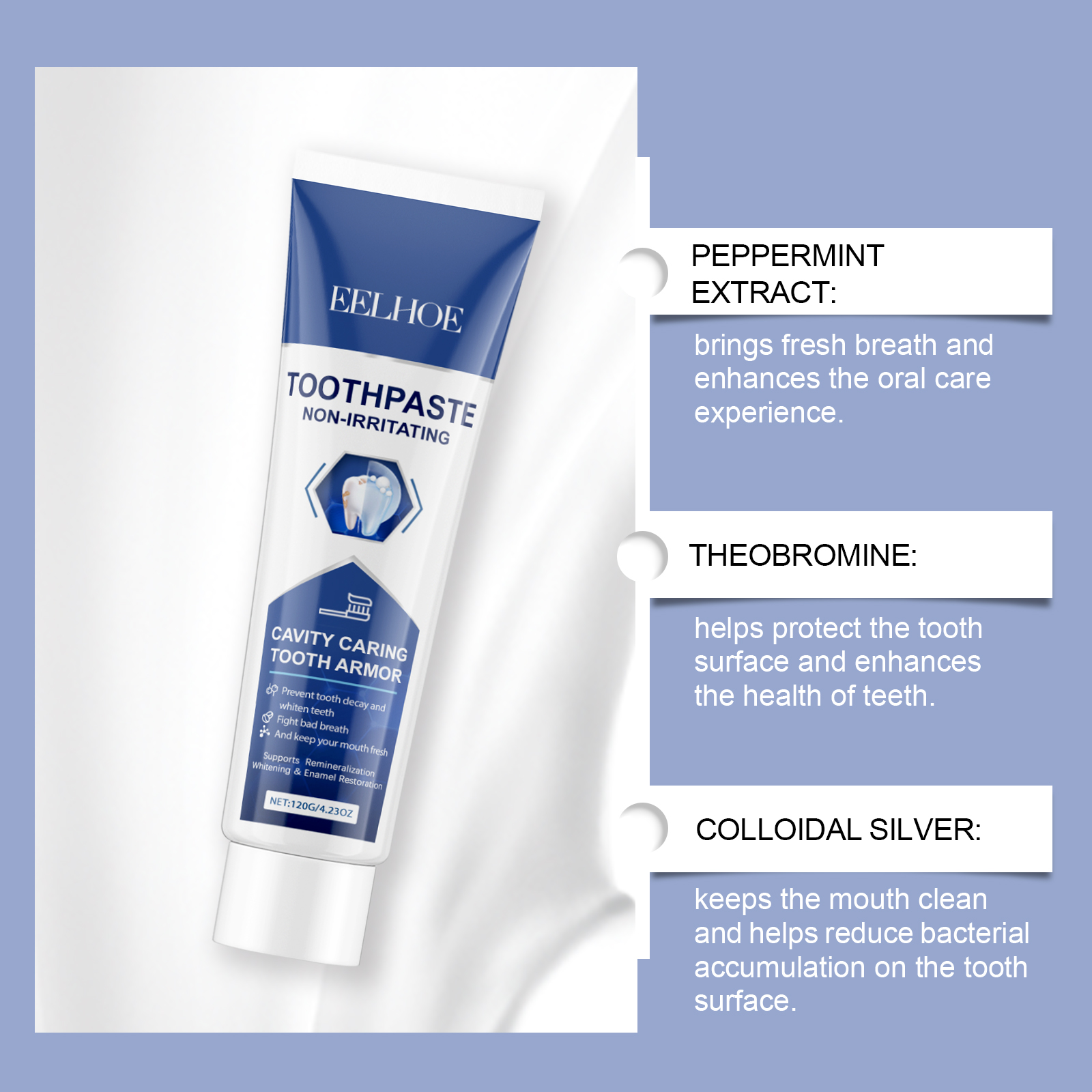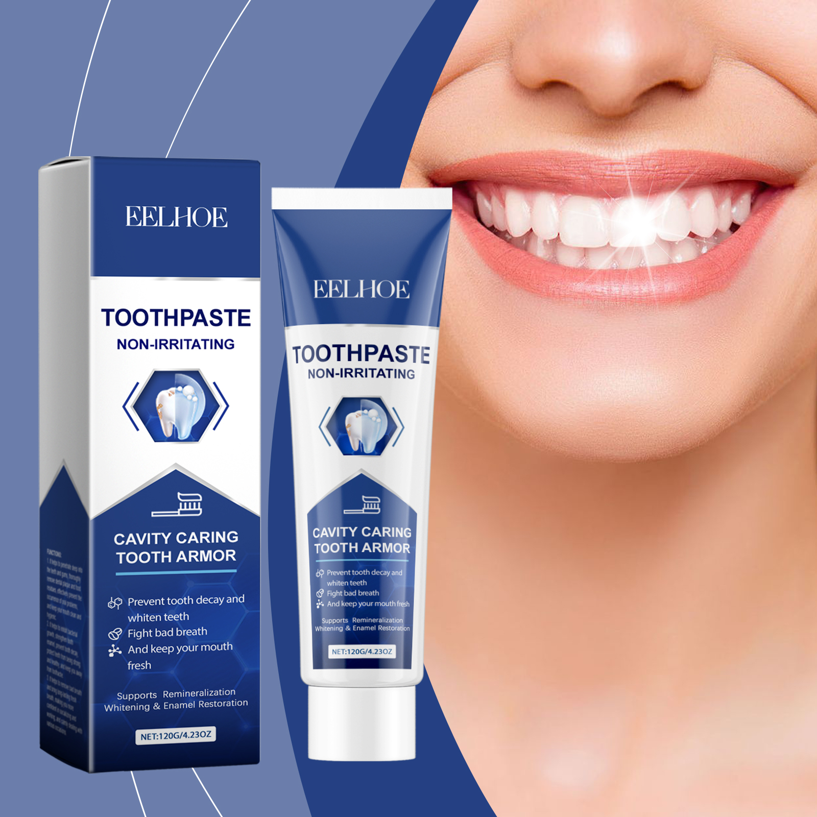 Our cleaning toothpaste contains peppermint extract, lemon fruit extract. It can prevent the formation of tooth decay, maintain tooth health, suitable for daily use. Its use is very simple: rinse your mouth with water to moisten your teeth, put an appropriate amount of toothpaste on a wet toothbrush, brush your teeth for 2-3 minutes, and rinse your mouth with water until your mouth is clean. And the back teeth are brighter and smoother, bringing a confident smile and improving the overall image.
