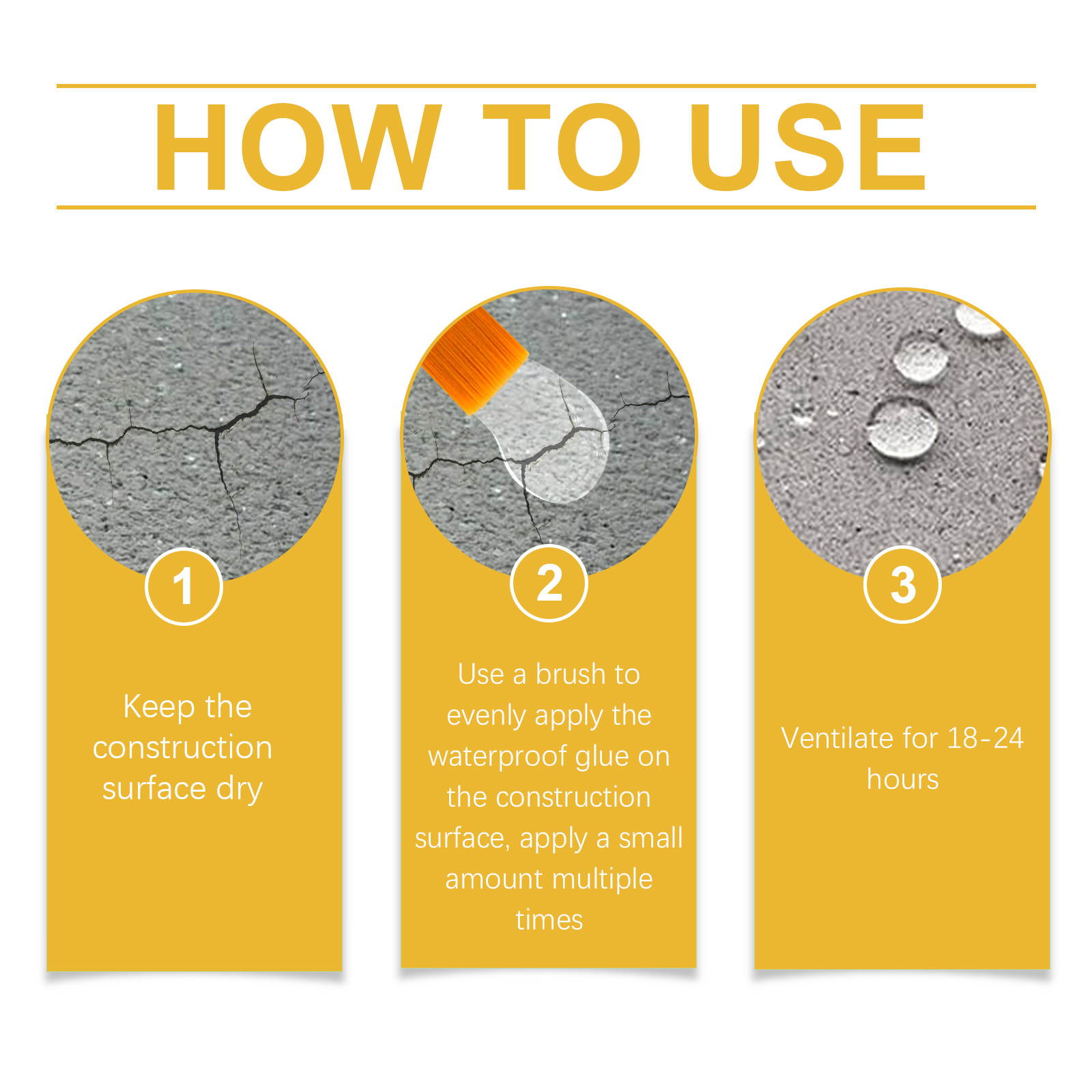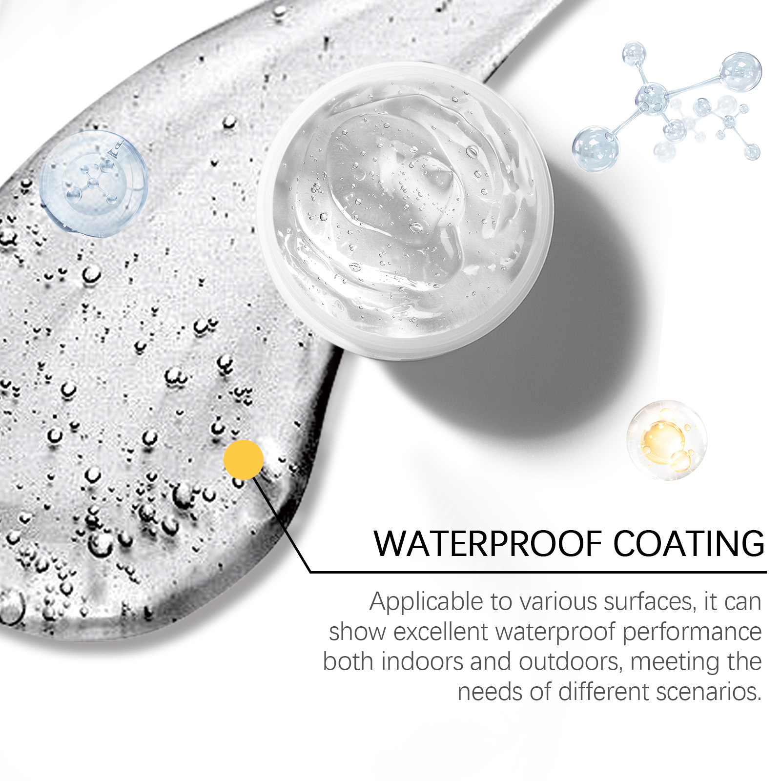 Our transparent waterproof adhesive contains polyurethane, silicone rubber, acrylic acid. It can quickly repair leaks, form a strong waterproof layer, and effectively isolate water erosion. Make sure the gel is tightly bonded to the surface without gaps. Its use method is very simple: 1. Keep the construction surface dry; 2. Apply waterproof glue evenly on the construction surface with a brush, and apply a small amount multiple times; 3. Ventilate 18-24 hours. Transparent waterproof adhesive can quickly fill the gap, form a firm sealing layer, effectively prevent water penetration, to achieve long-term waterproof.