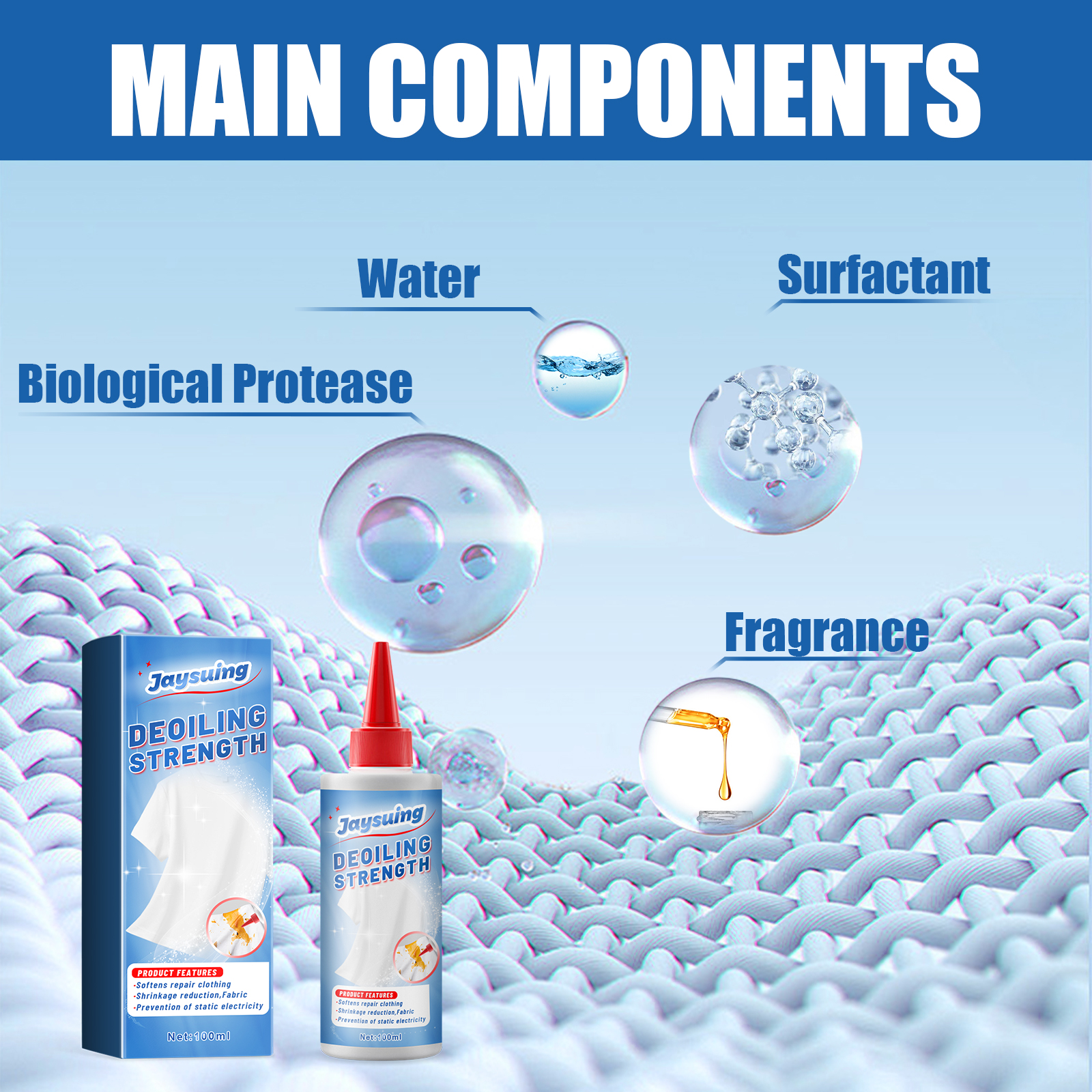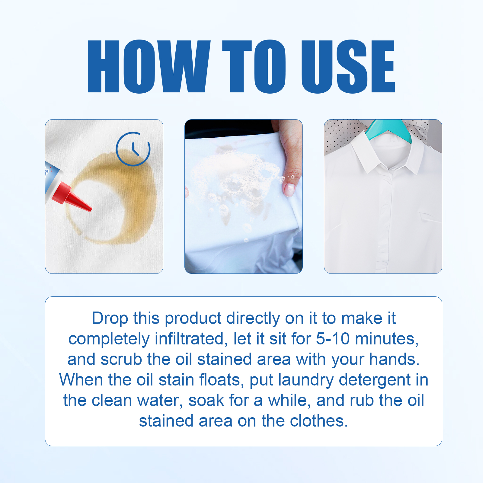Our laundry cleaners contain bioproteases and surfactants. It can effectively break down hard-to-clean sweat, blood and other protein stains on cuffs and necklines without damaging the fabric. Its use method is very simple: drop the product directly on the stain, let it fully penetrate for 5-10 minutes, and then rub the oil spot with both hands. When the oil stains float, put the washing powder into the clean water, soak for a period of time, and then rub the oil stains on the clothes. And do not hurt clothes, do not hurt hands, skin friendly, not irritating, more care for clothes.