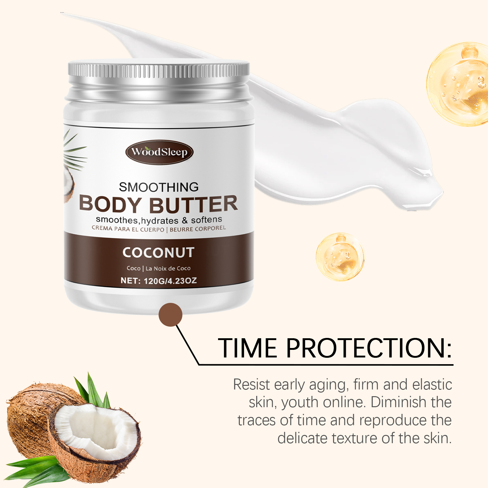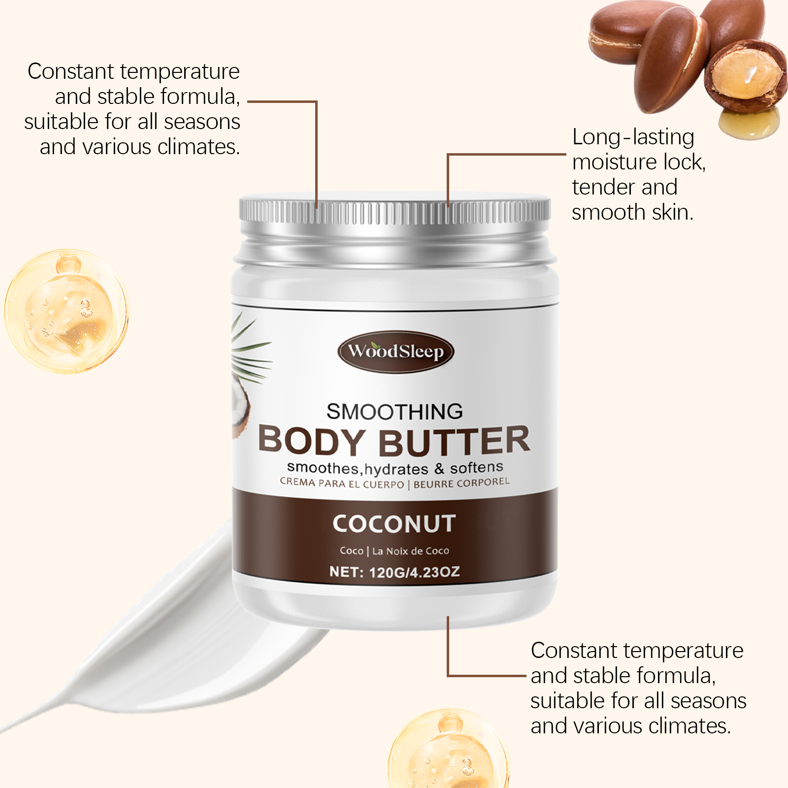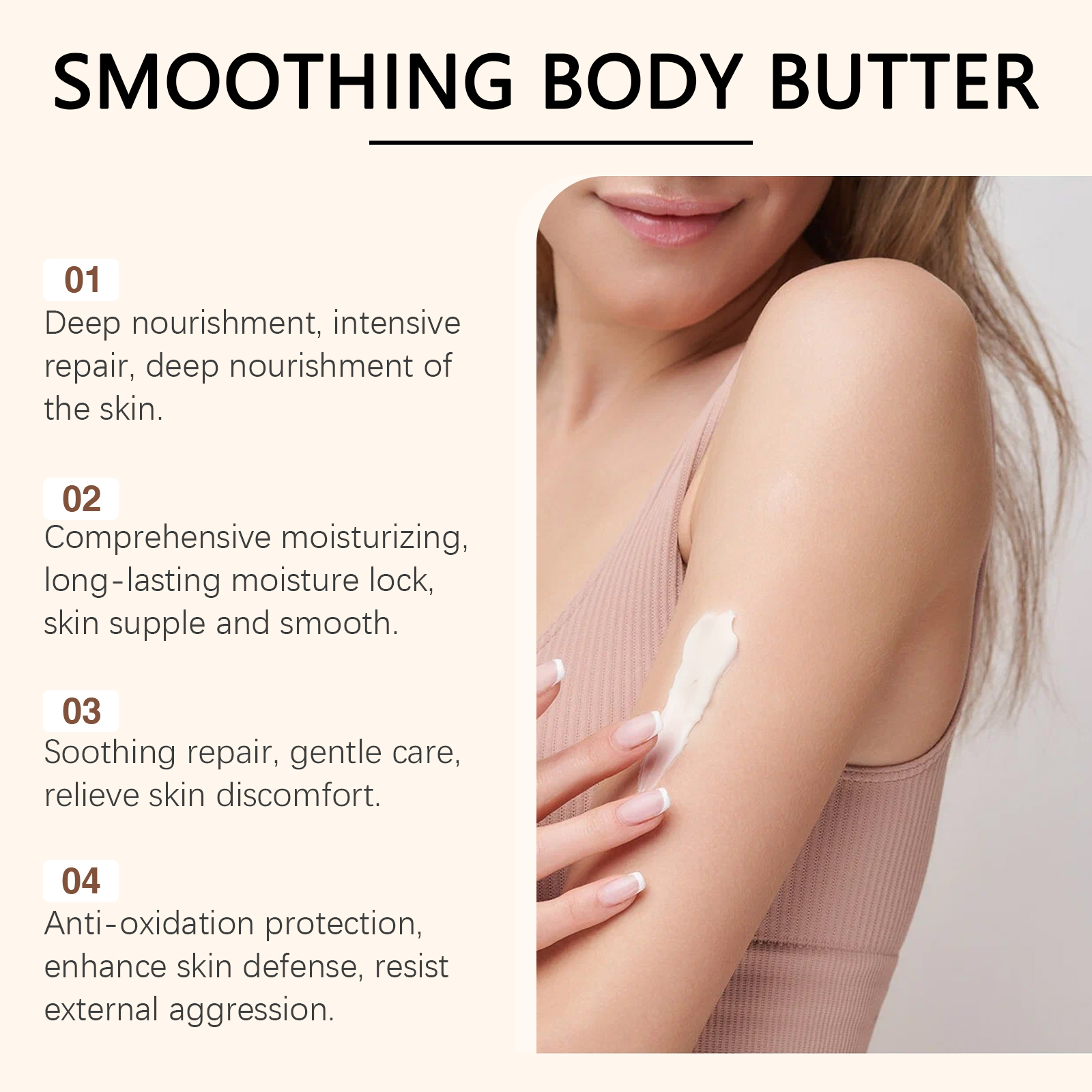 Our Coconut Cocoa Moisturizing Butter Moisturizer contains coconut oil and cocoa extract. It moisturizes all day long and your skin feels full of moisture. Strengthening the barrier strengthens the skin's own resistance. Gentle formula, soothes sensitive skin, restores skin to calm and rejuvenates skin, witnessing changes day by day. The way to use it is simple: clean the skin and keep it dry. Apply an appropriate amount of the cream evenly to the skin. Massage gently in circular motions to fully absorb. And can bring rich nutrition to the skin, glow healthy luster, skin touch is delicate, melt at a touch, fast absorption, no burden.