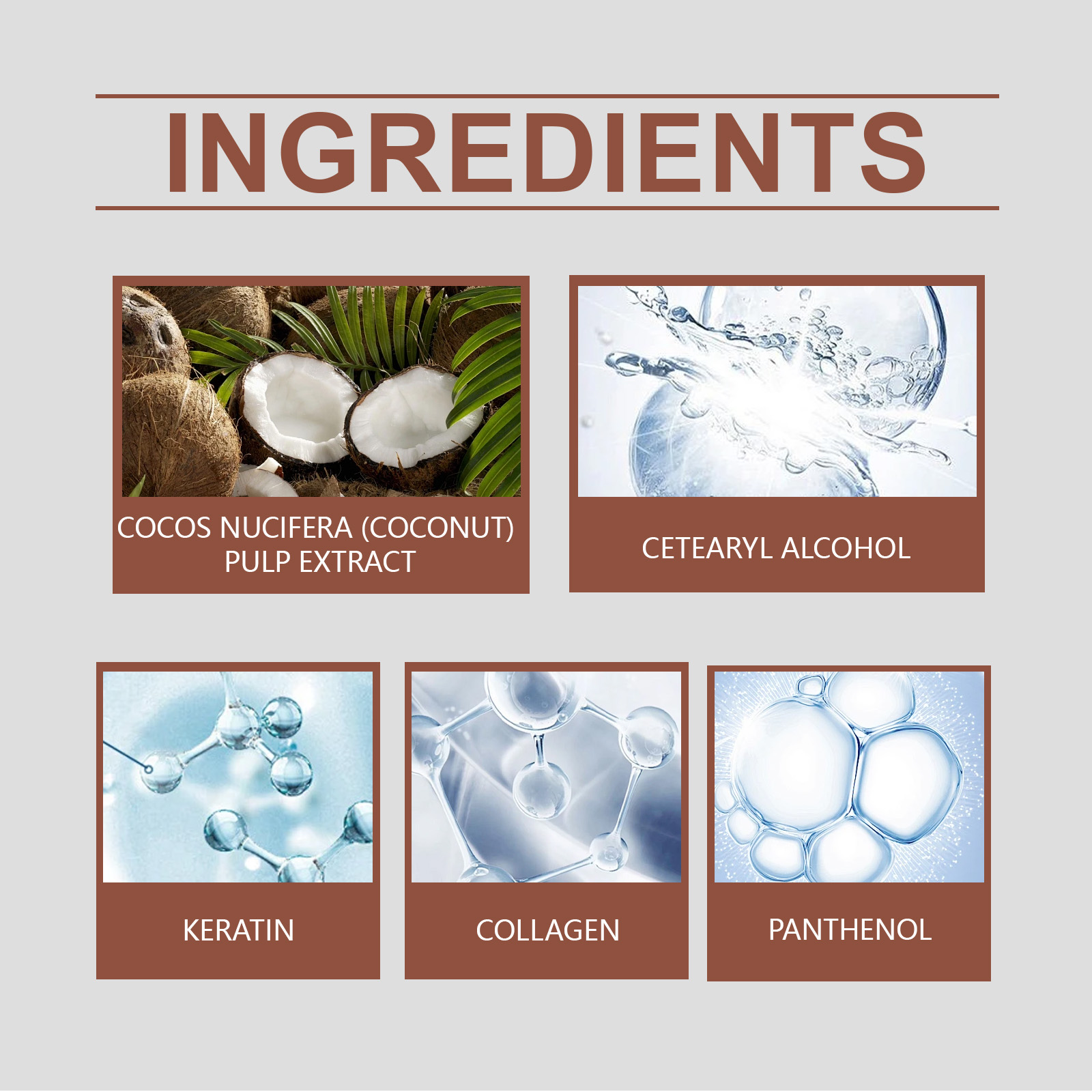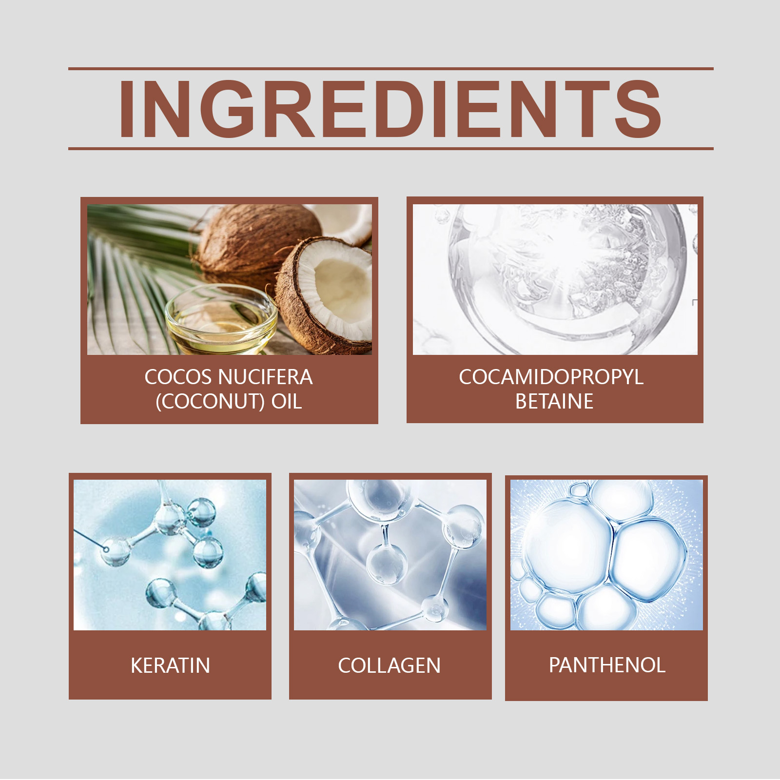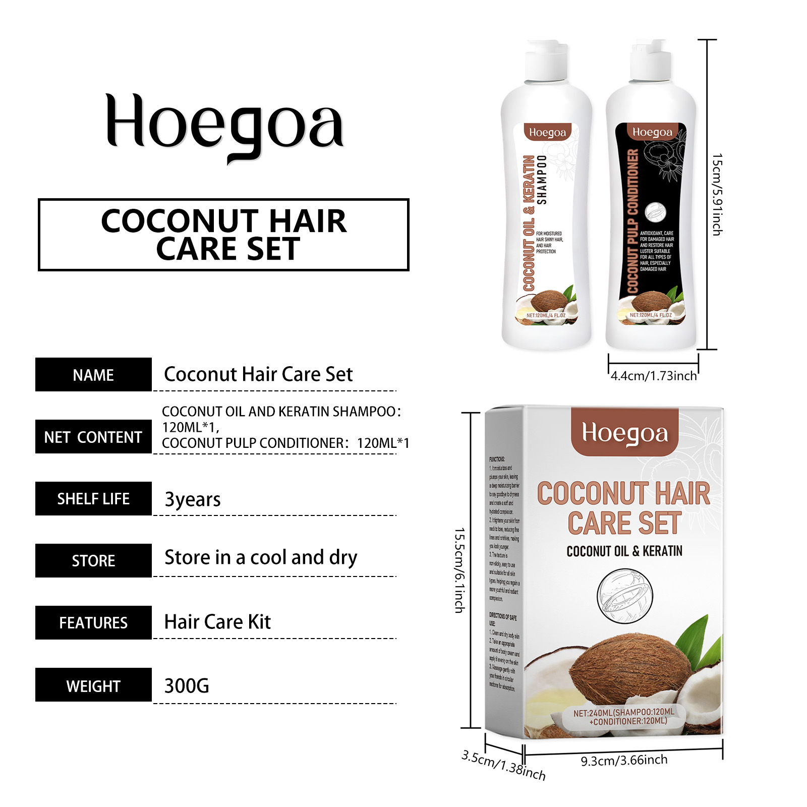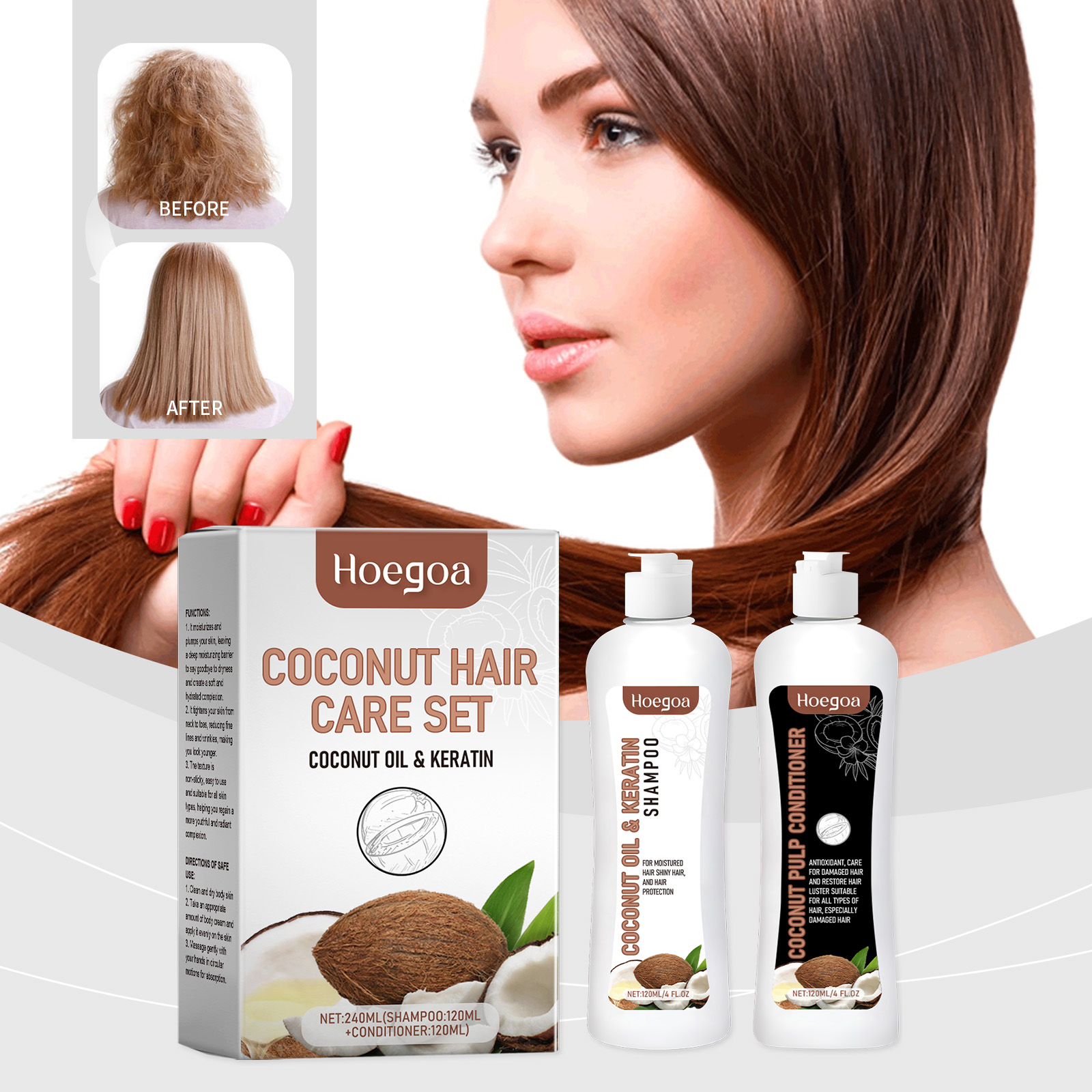 Our Coconut Pulp Repair wash kit contains coconut oil, keratin and collagen. It can make hair soft and shiny, improve the overall hair quality. Replenish the protein needed by hair, enhance the strength of hair, and reduce hair breaks and split ends. Its application method is simple: Conditioner: 1. After using shampoo and rinsing, wet your hair with warm water. 2. Apply an appropriate amount of conditioner evenly from the middle to the ends of your hair, avoiding scalp as much as possible. 3. Let the conditioner sit in your hair for 1-3 minutes, then rinse thoroughly with water. Shampoo: 1. Wet your hair completely with warm water. 2. Take an appropriate amount of shampoo, lather it in the palm, evenly smear it on the hair, massage it gently with the fingertips to clean the scalp and hair. 3. Rinse thoroughly with water. Coconut oil deeply moisturizes and repairs, strengthens hair and reduces hair breakage. Keratin and collagen are rich in nutrients that nourish the scalp and promote health.