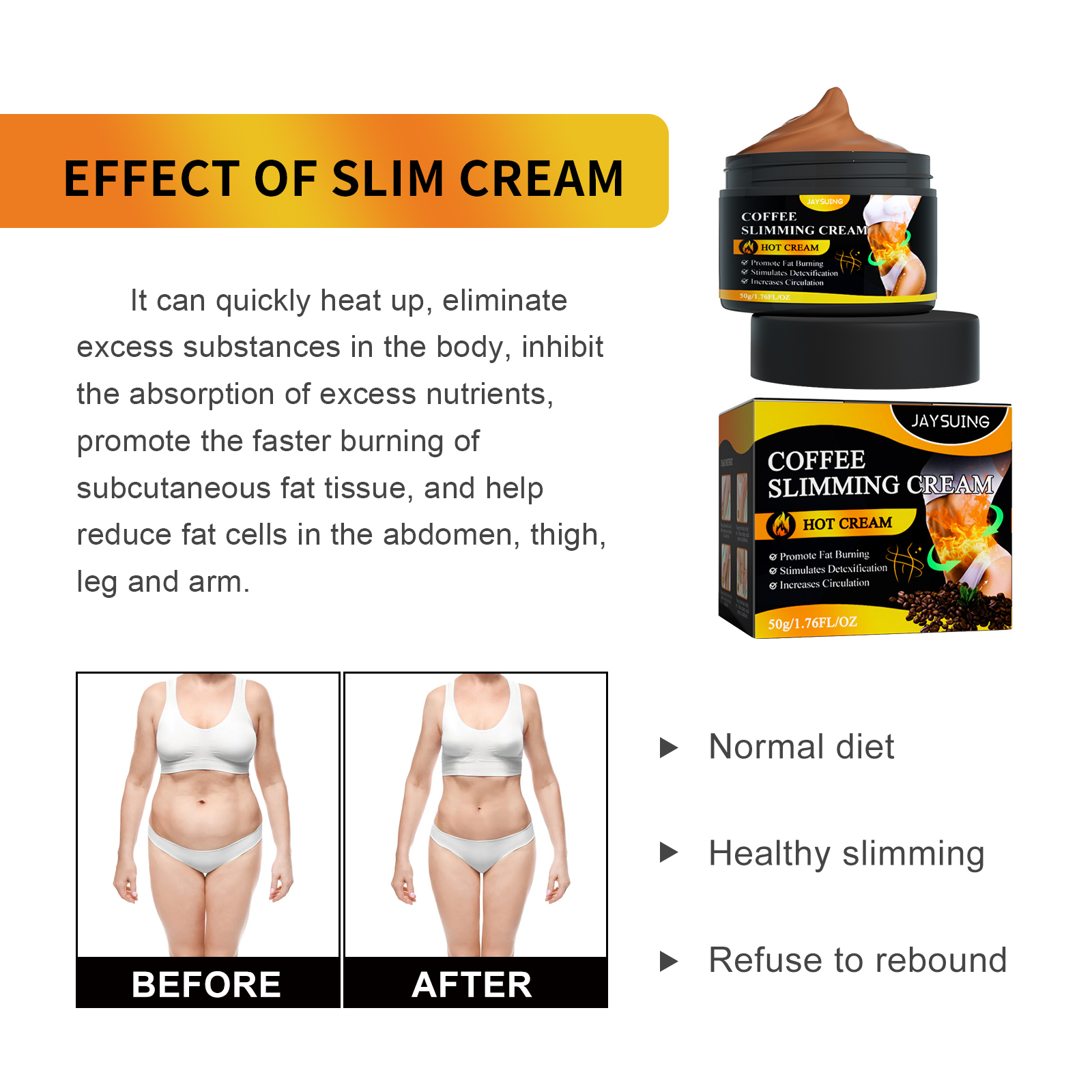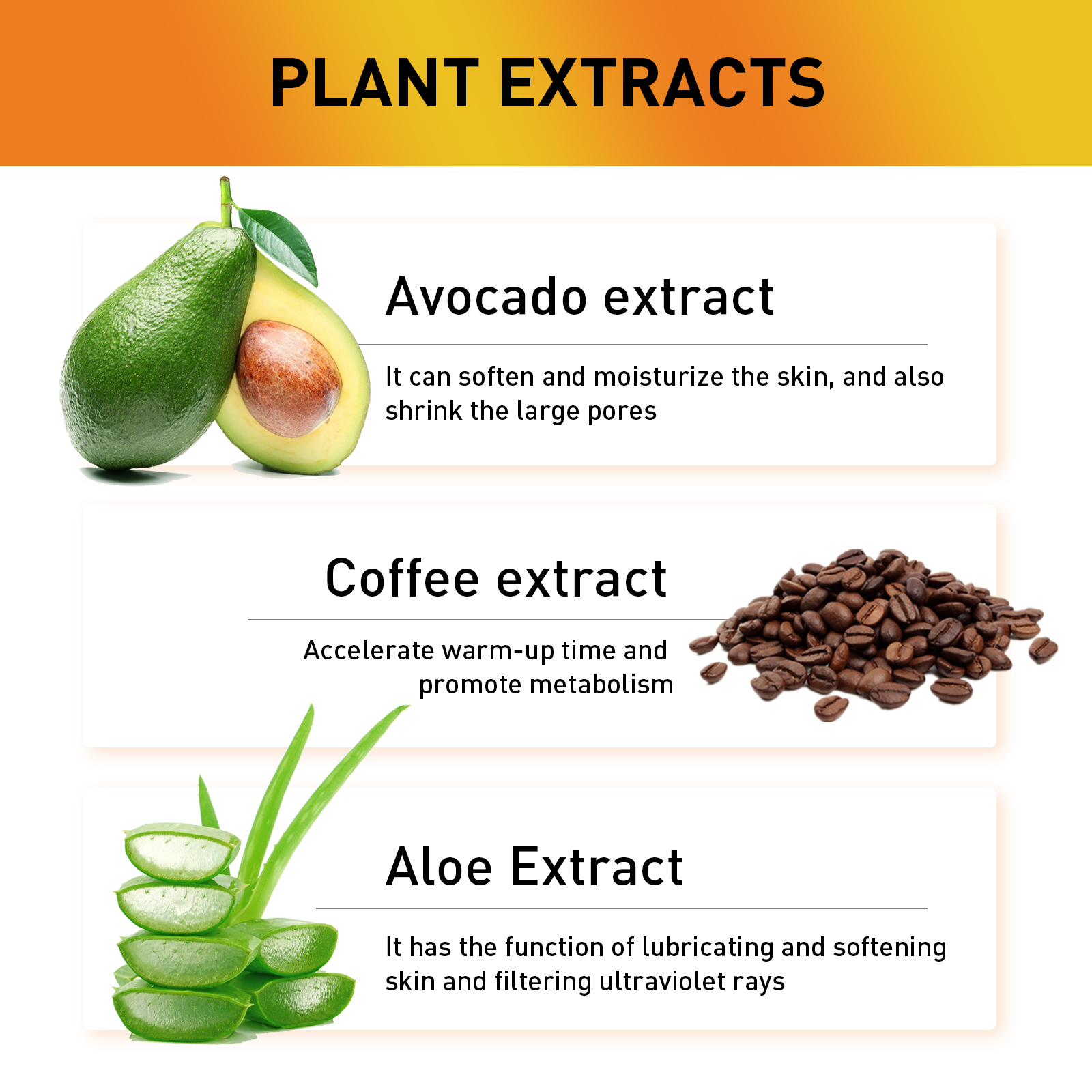 Our coffee slimming cream contains avocado extract, coffee extract and aloe vera extract. It can quickly heat up, eliminate excess matter in the body, inhibit the absorption of excess nutrients, promote faster burning of subcutaneous fat tissue, and help reduce fat cells in the abdomen, thighs, legs and arms. Its use is very simple: from the ankle to the knee massage 3 times in a group, several groups in a certain time massage; Massage from the knee to the root of the thigh, 3 times per group, several groups in a certain time massage; Massage your hands evenly from elbow to armpit; Massage from the knee to the root of the thigh, 3 times per group, several groups in a certain time massage. Breaking traditional lipolysis - burning fat, defeating stubborn obesity and significantly reducing swelling, orange peel tissue smooths and tightens skin; Getting rid of excess water helps you lose weight and build a slimmer body.