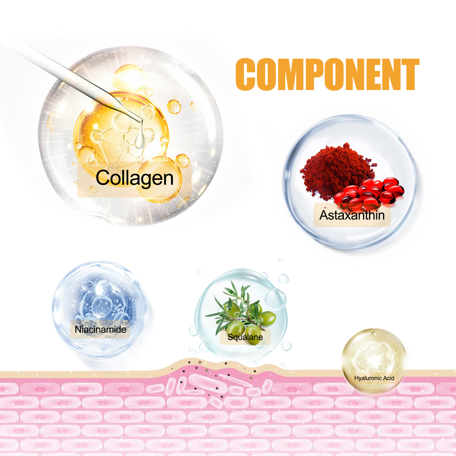 Our collagen astaxanthin Tilaan bottle contains collagen, astaxanthin, and niacinamide. It can nourish the skin evenly, reduce stain precipitation, fade stains, promote cell renewal, and make the skin smoother and more beautiful. Its use method is very simple: first open the lid, insert the dose tube into the bottle, lift the bottle up and down, remove the serum as required, then place the bottle on the table, pull out the dose tube, apply the serum to the face, and then insert the dosing tube into the bottle and lay it flat. After use, it brightens skin, strengthens skin, improves texture, activates cell absorption, gently nourishes, moisturizes and brightens your skin.