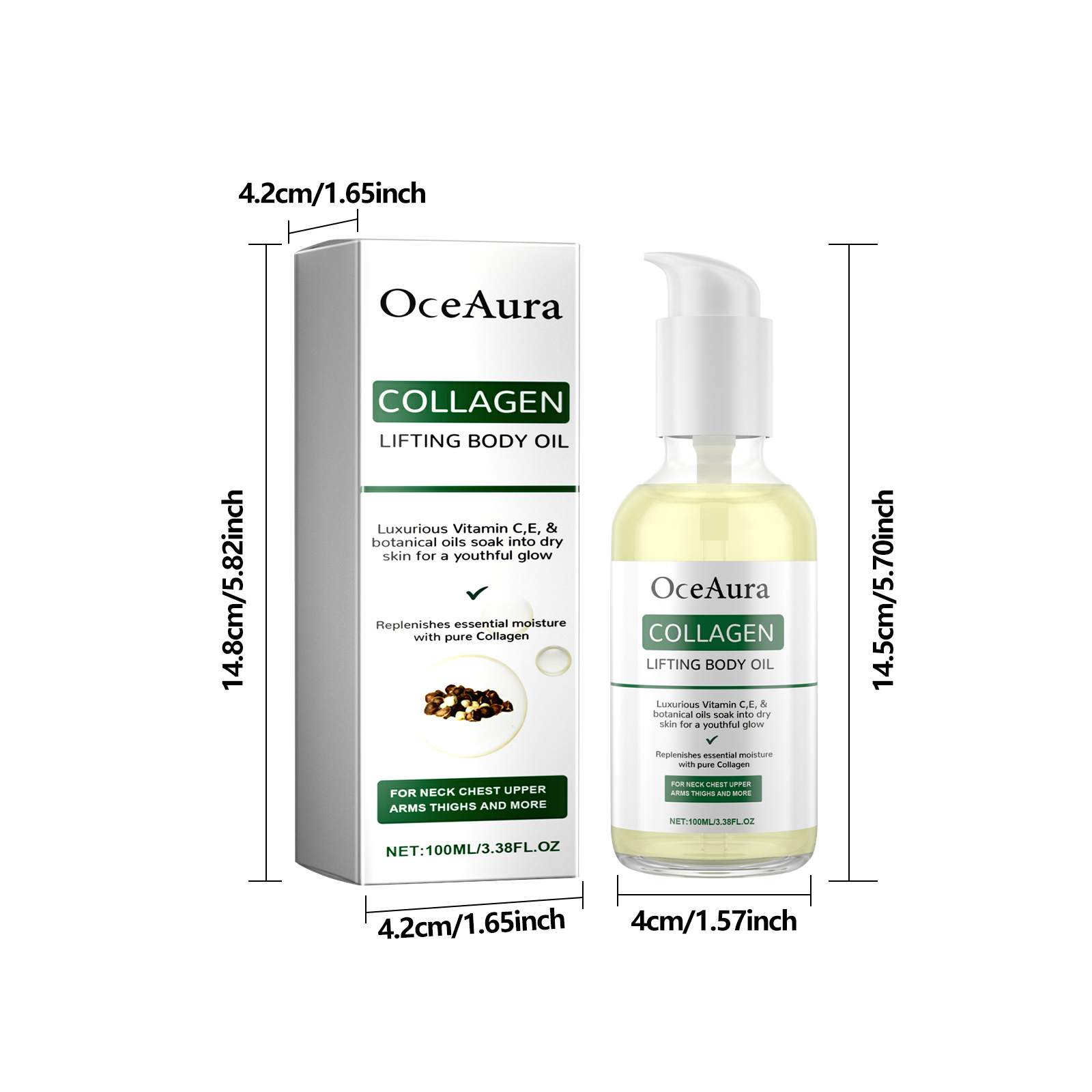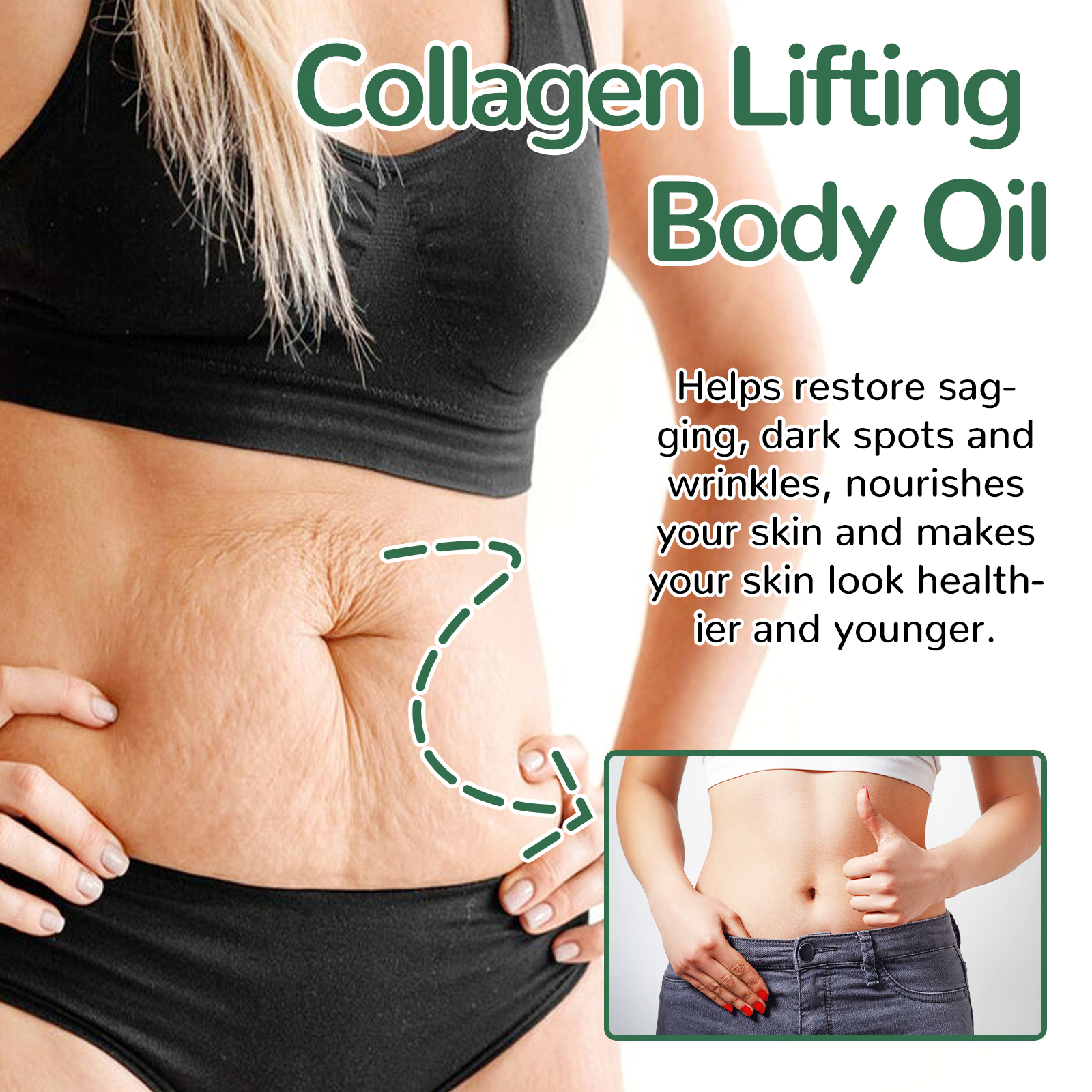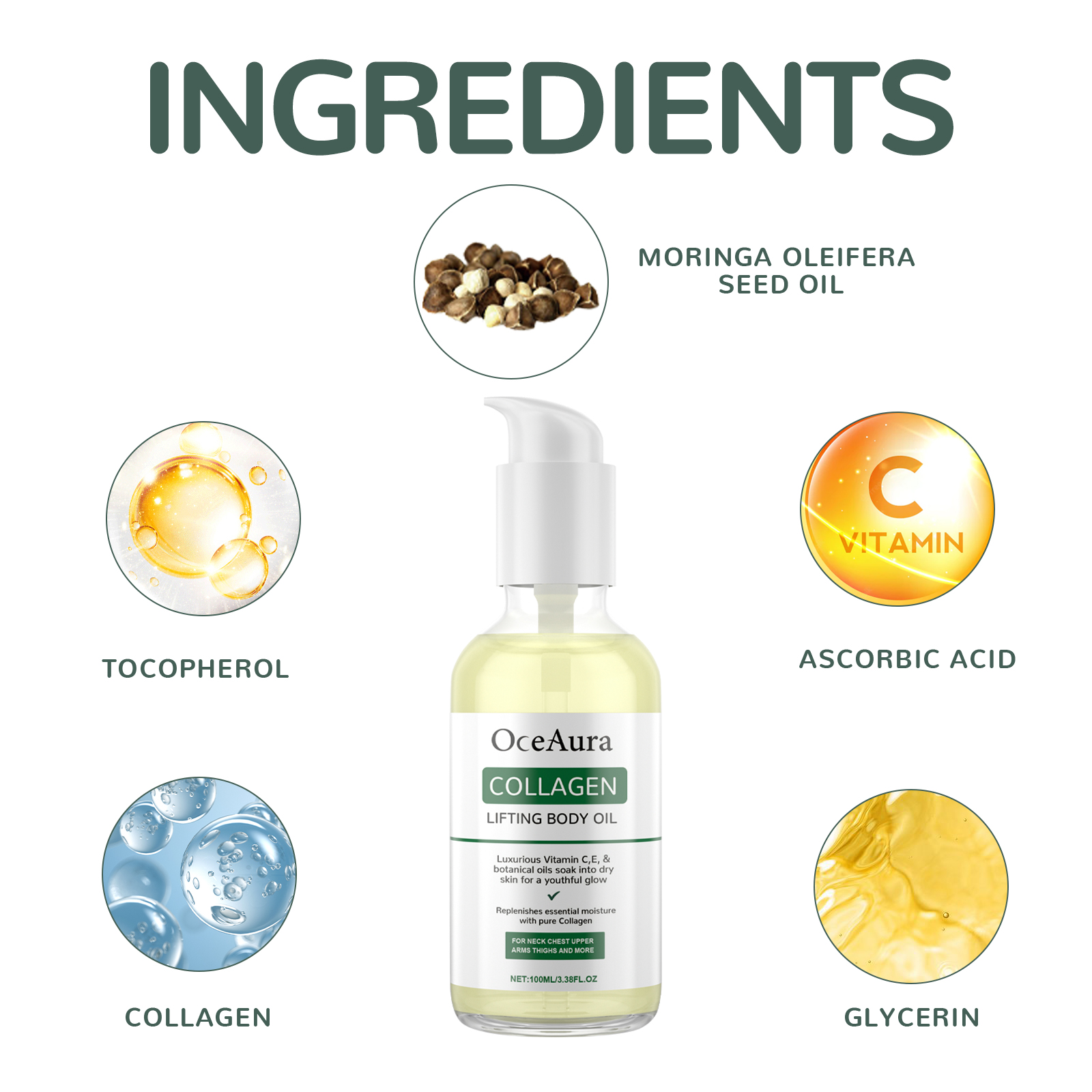 Our Collagen Lifting Body Oil contains Collagen, Ascorbic Acid, Tocopherol. It can replenish the moisture needed by the skin, keep the skin moisturized, help increase the elasticity of the skin, restore the collagen in the skin, and reduce the production of wrinkles and fine lines. Its use method is very simple: clean the body skin, keep dry, take appropriate amount of this product on the palm, evenly apply to the body, gently massage in circles until completely absorbed. It can help restore sagging, dark spots and wrinkles, nourish your skin, and make your skin look healthier and younger.