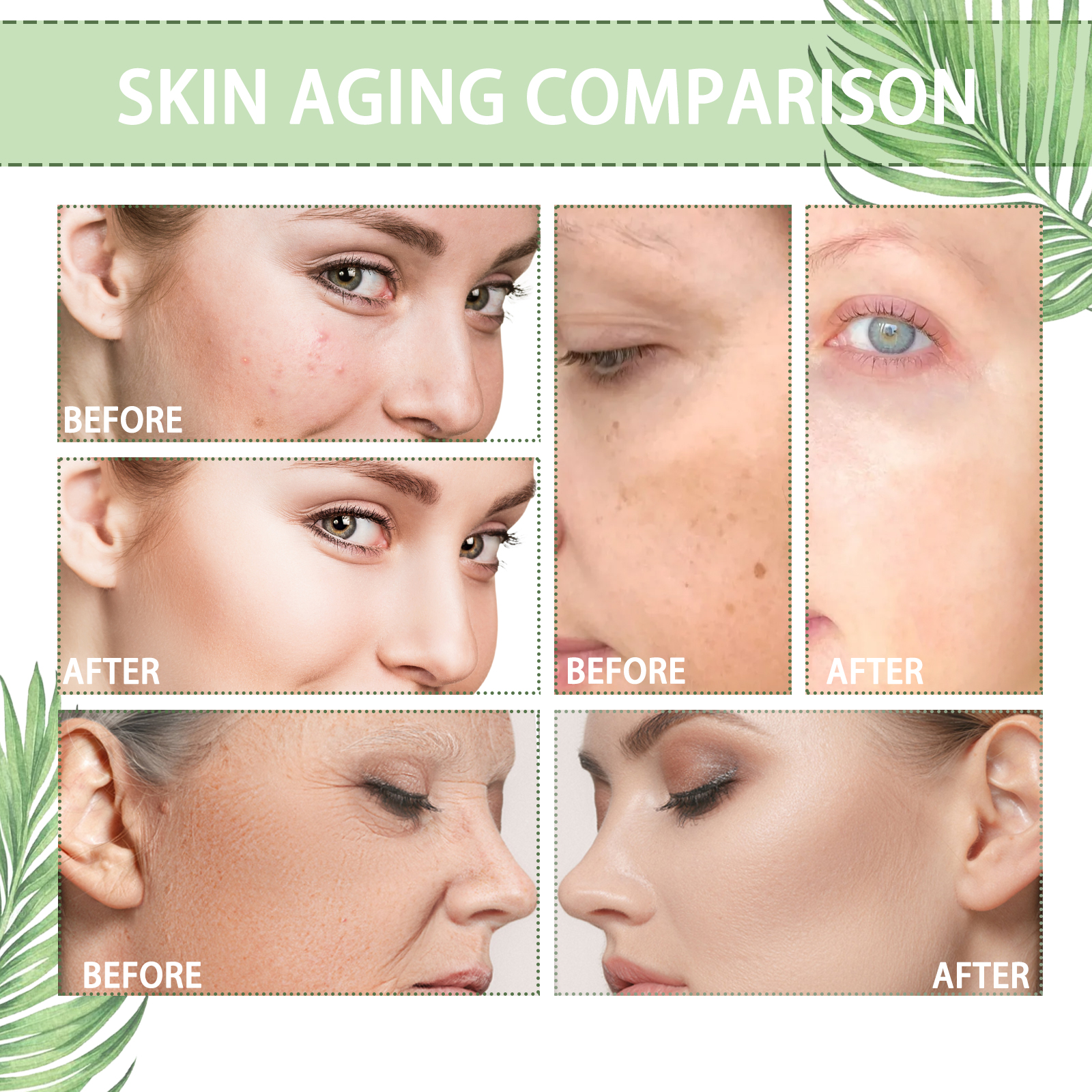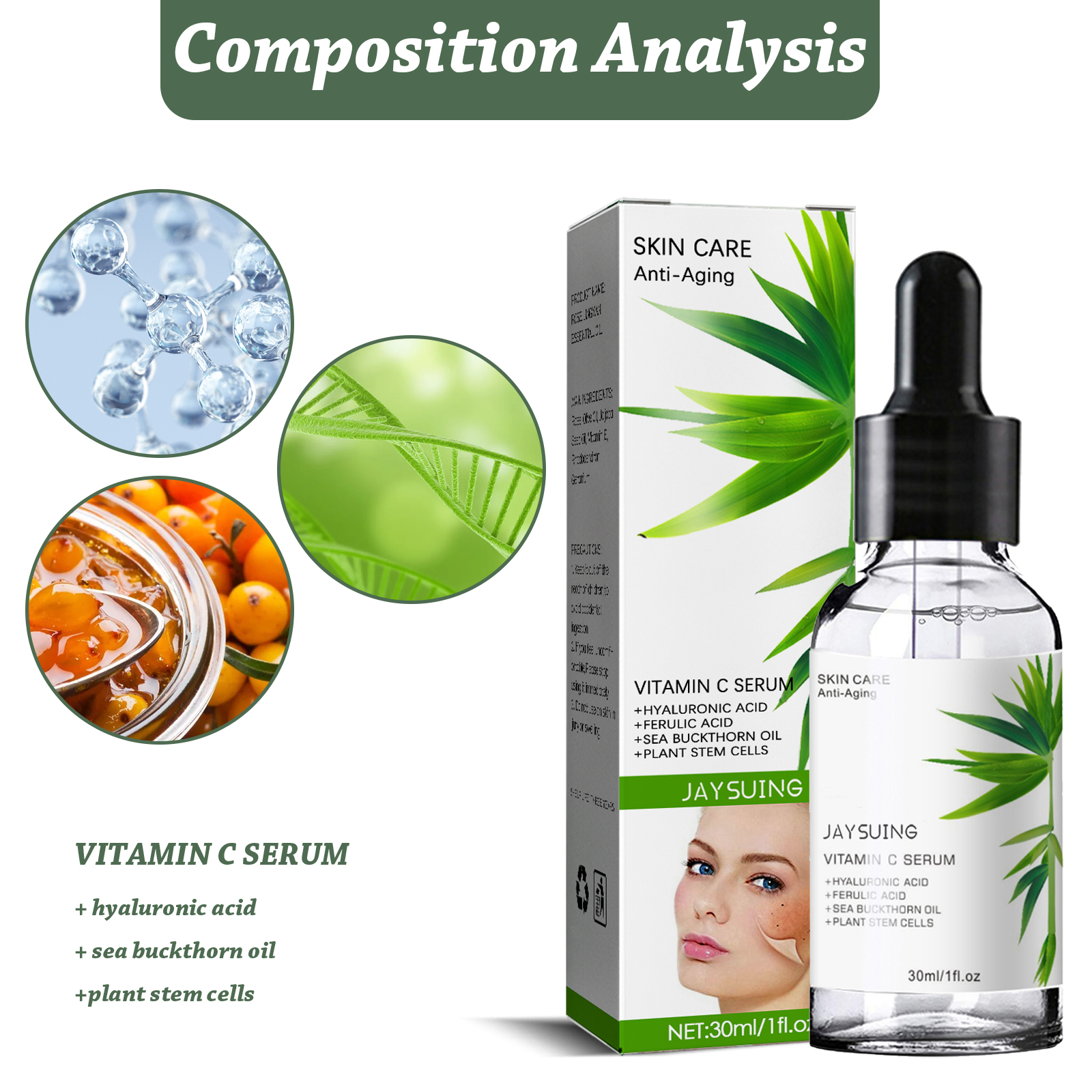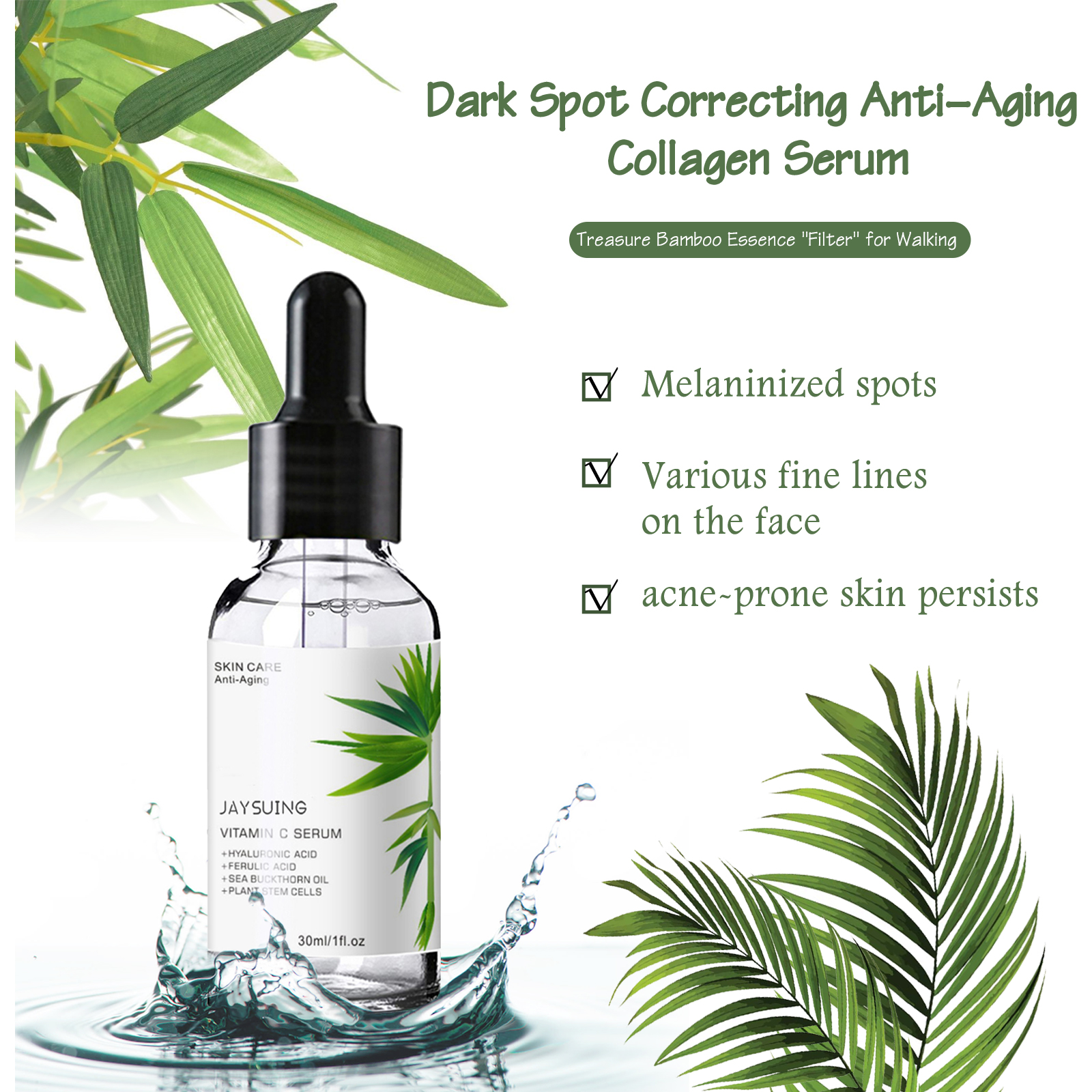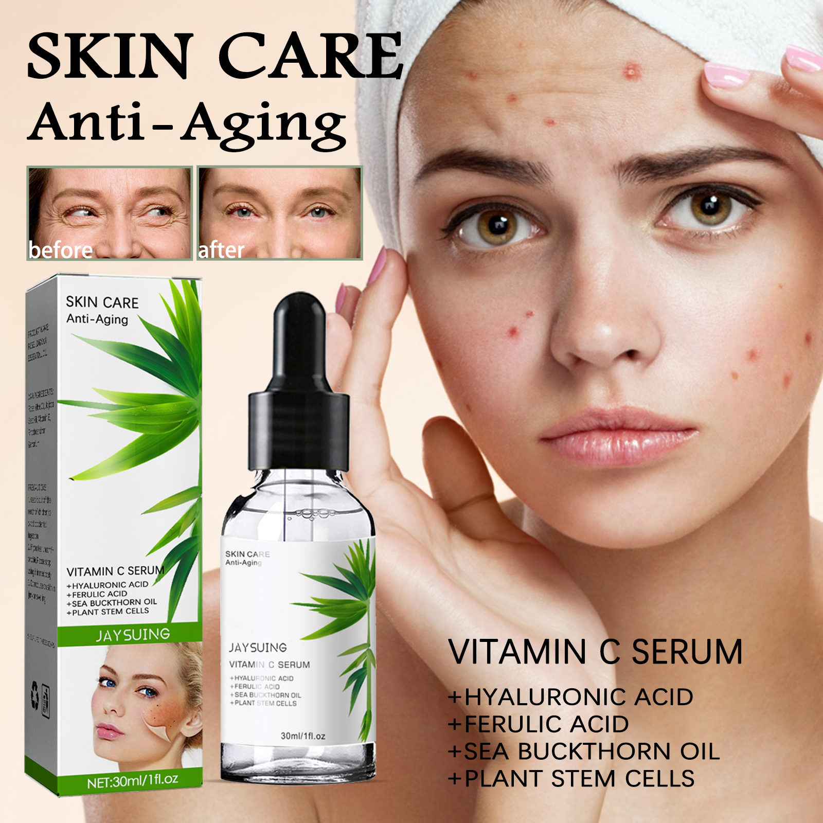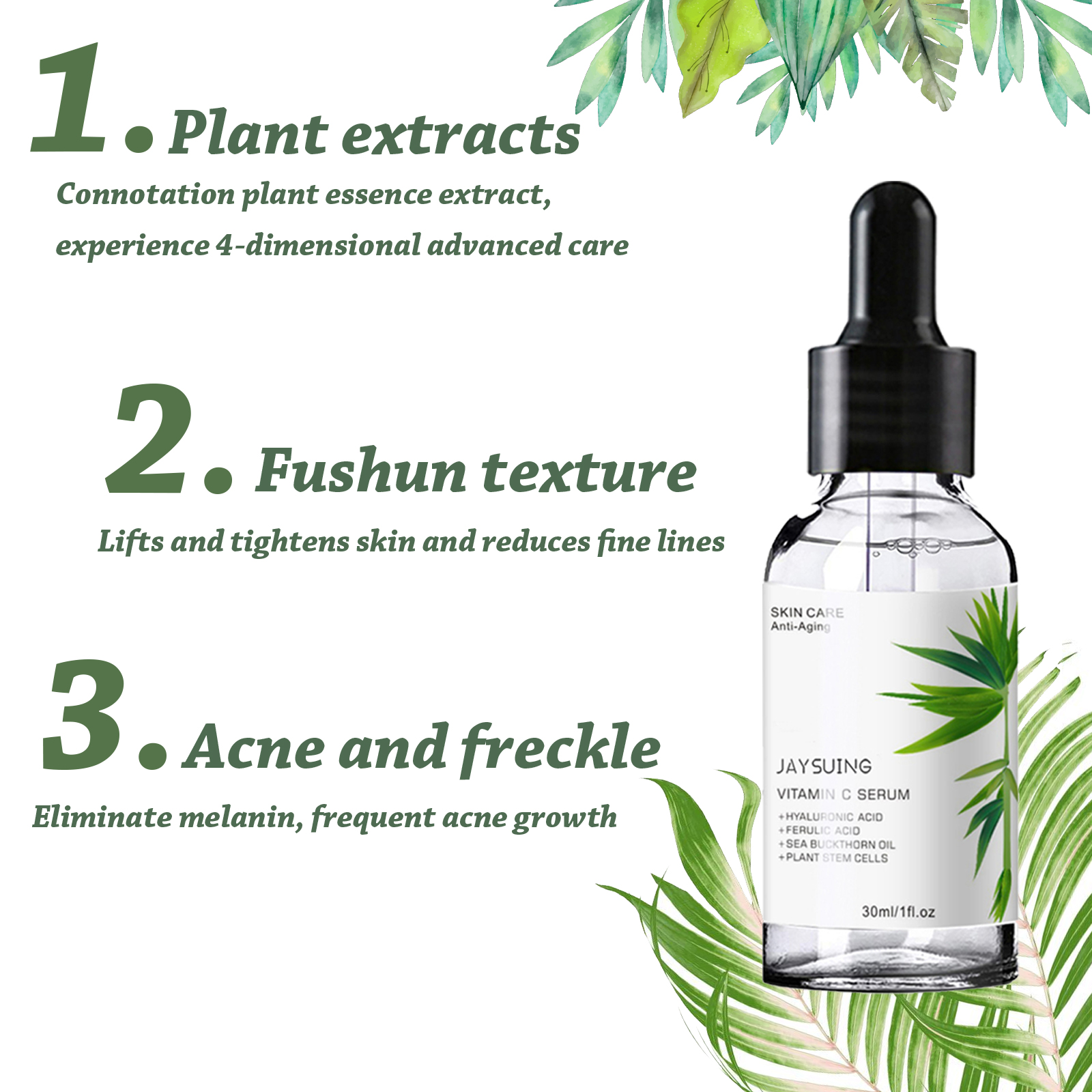 Our collagen serum contains vitamin c serum, hyaluronic acid, sea buckthorn oil. It smoothes the texture, tightens the skin, reduces fine lines, fades spots, hydrates and brightens the skin. Its use method is very simple: first wash your face, wipe it off; Apply an appropriate amount of essence drops to the face, gently massage from the middle of the face to the side until absorbed; Apply consistently morning and evening to see results over time. Collagen essence removes acne and spots, eliminates melanin, moisturizes and soothes the skin, quickly penetrates and moisturizes the skin after use.