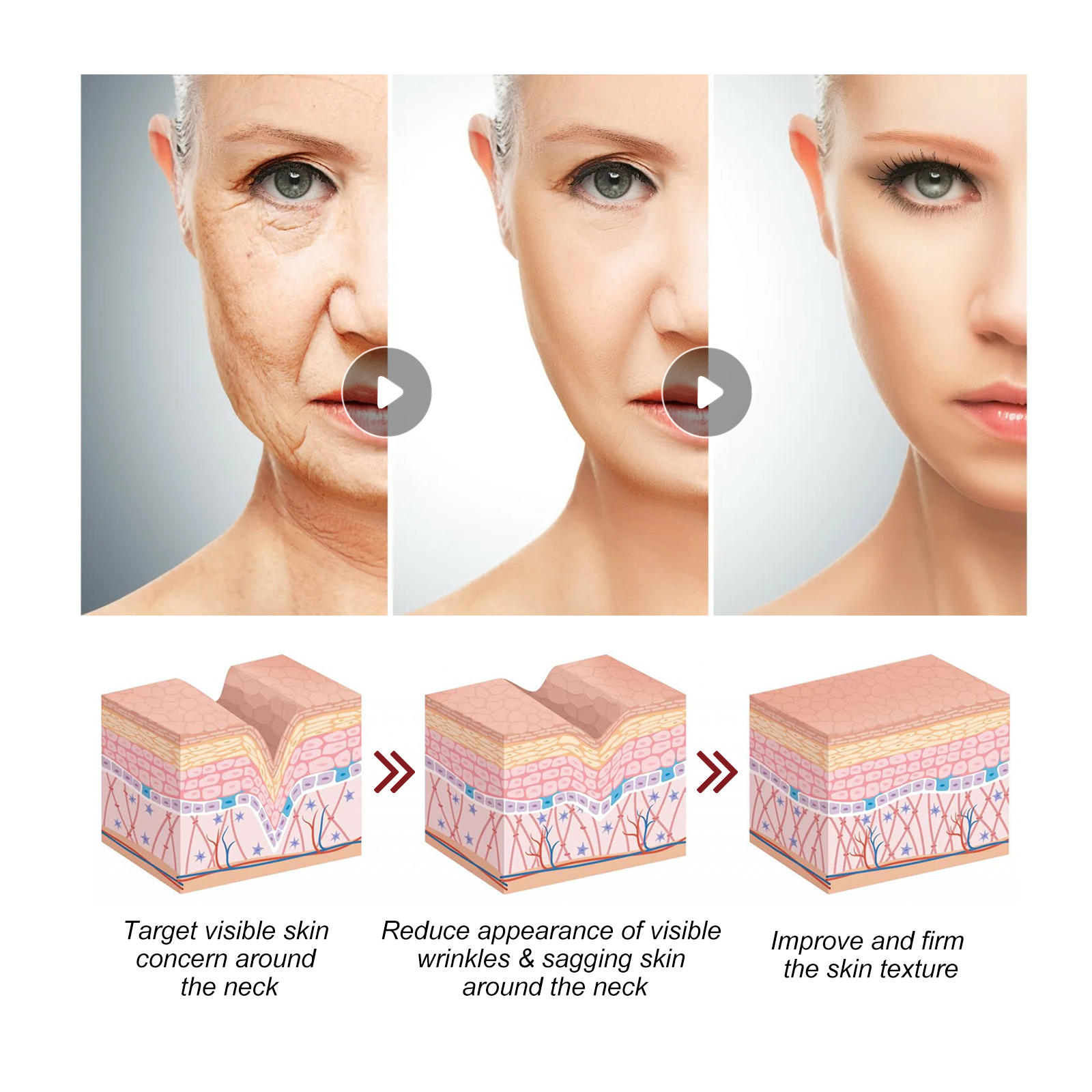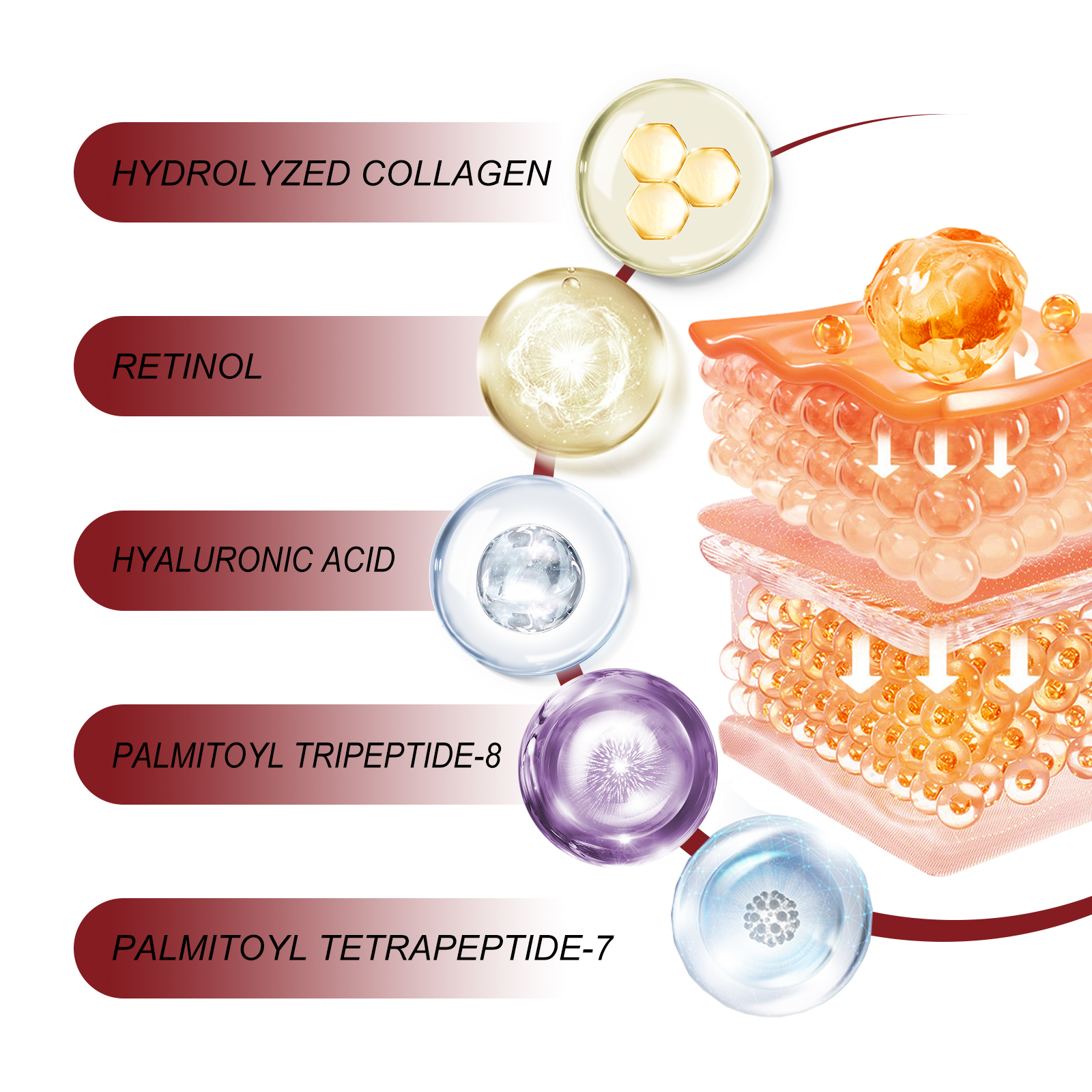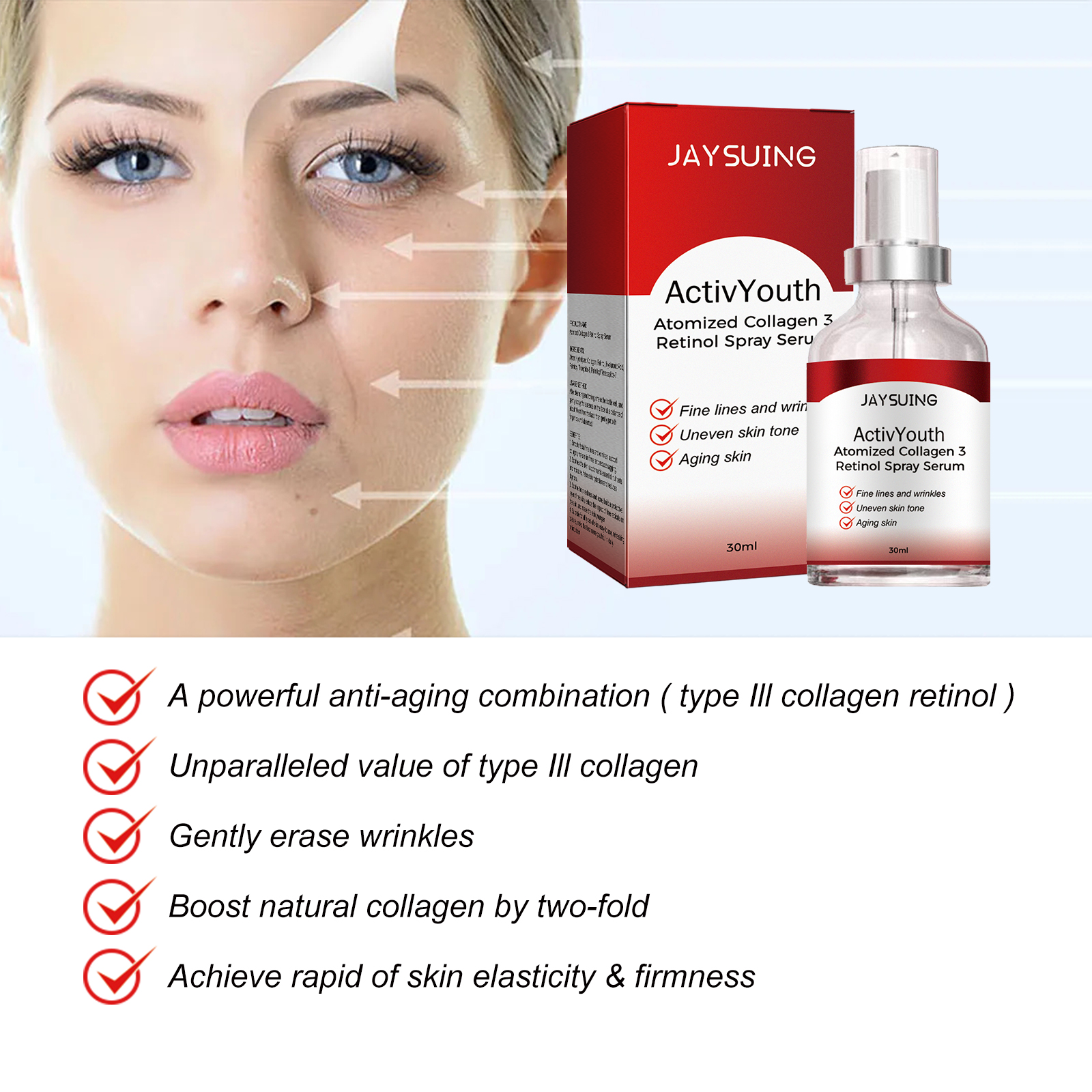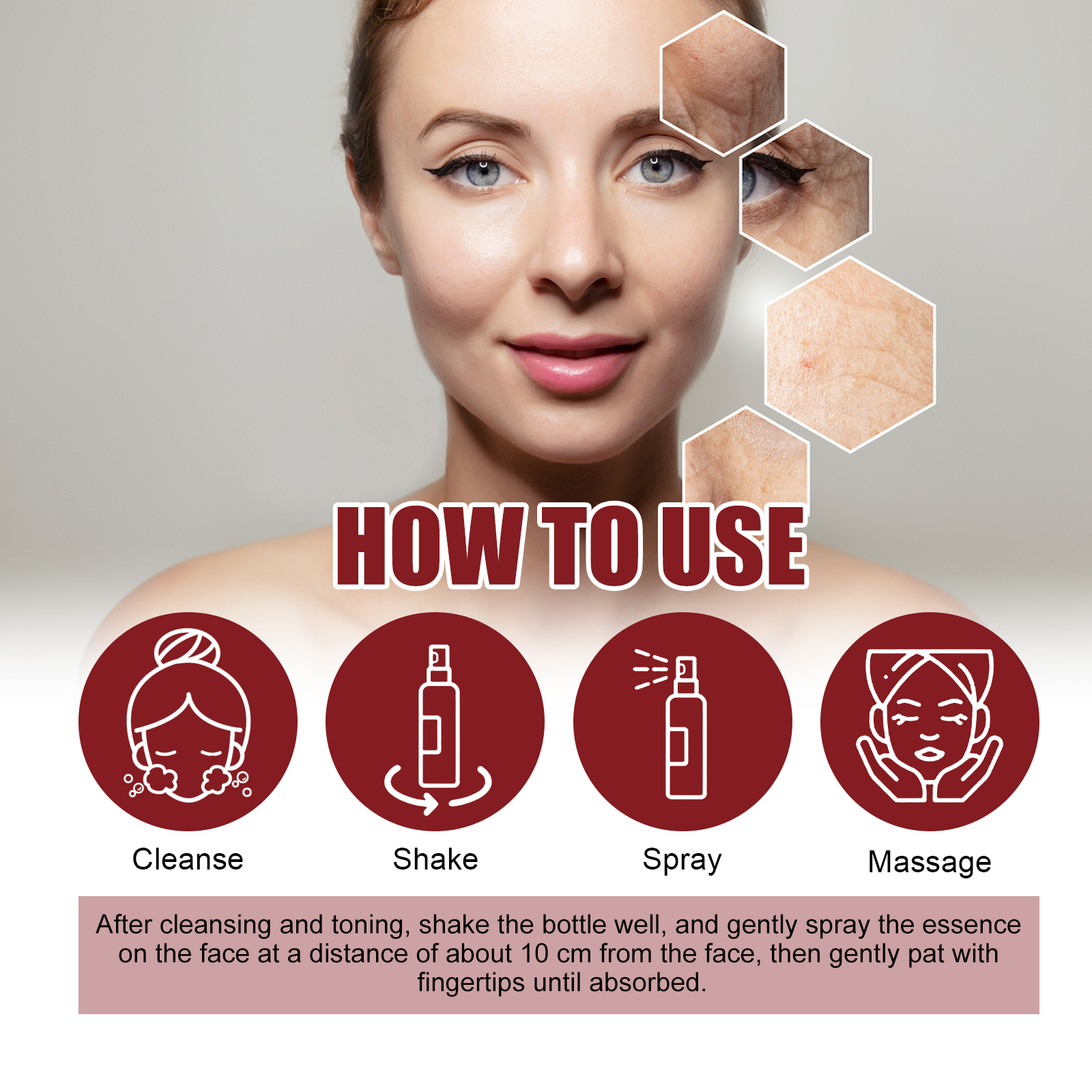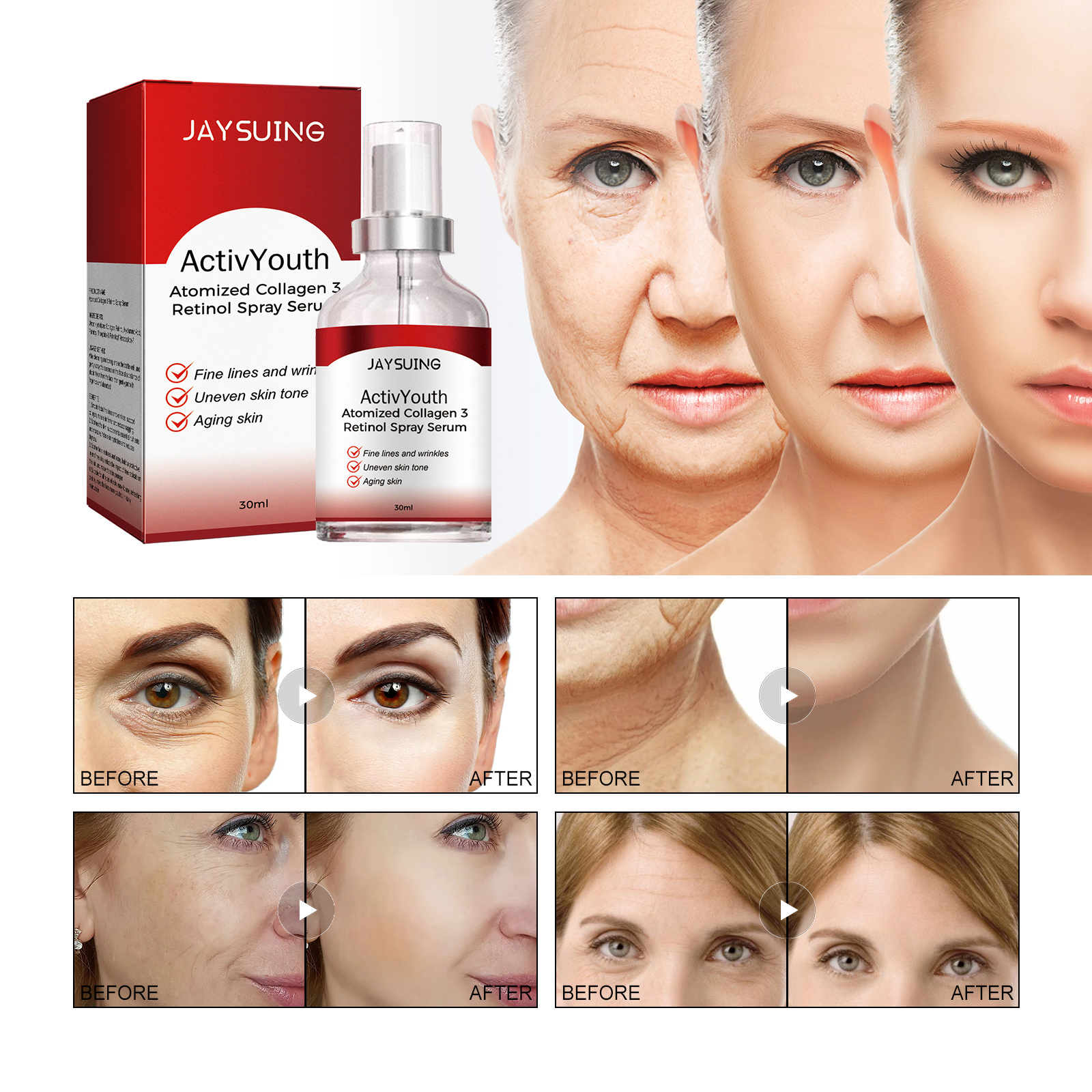 Our Collagen Retinol Essence Spray contains hydrolyzed collagen, retinol, and hyaluronic acid. It can reduce visible wrinkles and loose skin around the neck, improve and tighten the skin texture, deeply moisturize, eliminate wrinkles and build repair layer, relieve facial redness and acne, and build skin protection layer. Its application is simple: after cleansing and toning, shake the bottle well, gently spray the serum about 10cm from your face, and then pat it with your fingertips until it is absorbed. Powerful anti-aging combination (Type III collagen retinol) gently wipes away wrinkles, doubles natural collagen, quickly improves skin elasticity and firmness, reduces the impact of free radicals on skin, and makes skin look younger.