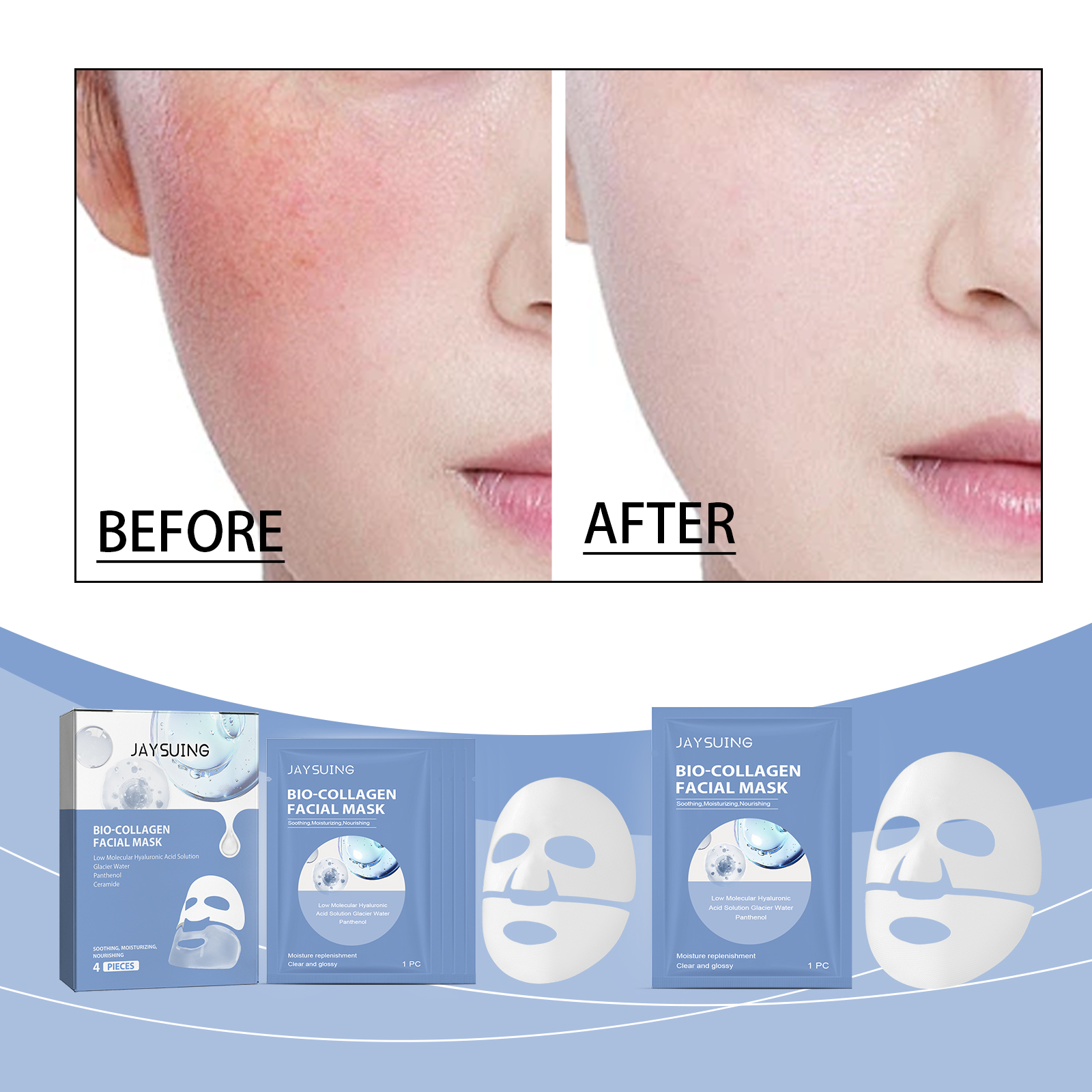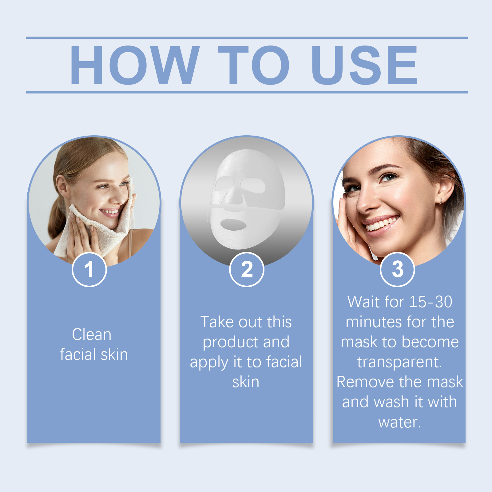 Our collagen soothing and moisturizing mask contains panthenol and glycerin. It can effectively lighten the complexion and make the skin even and bright. Its application method is very simple: clean the facial skin, take out the product, apply on the facial skin, wait 15-30 minutes after the mask becomes transparent, remove the mask with clean water. And can help the skin, deep nourishment and improve elasticity.