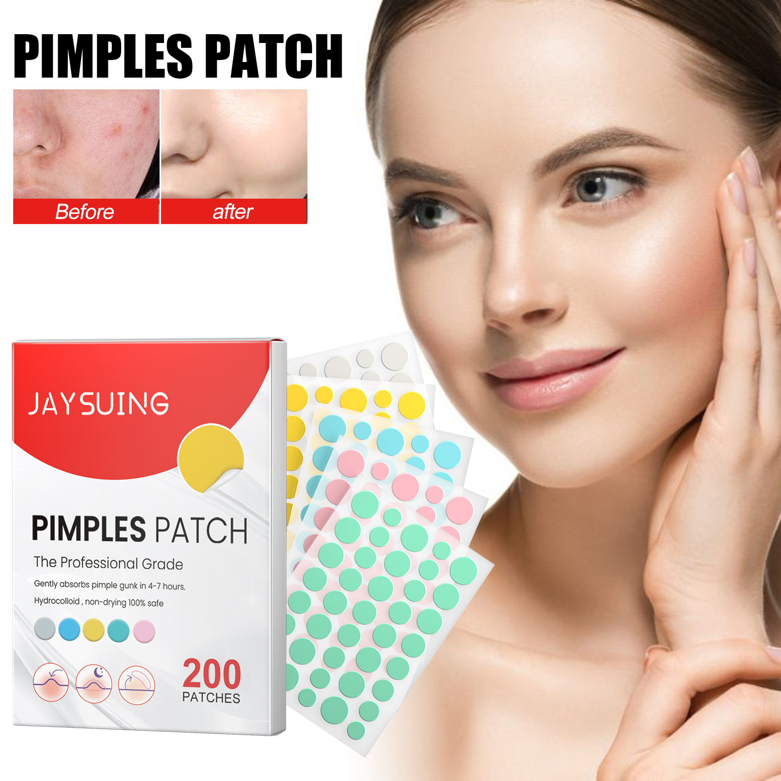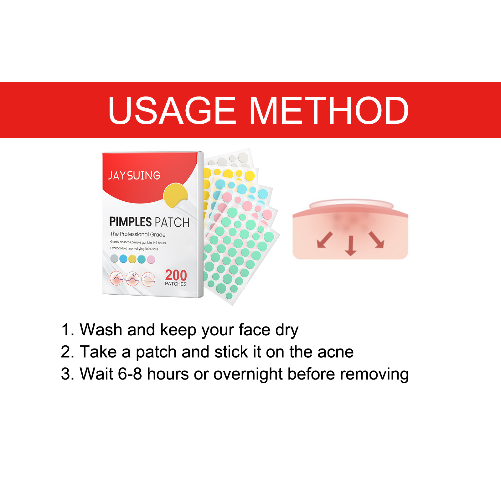 Our Pimples Patch contains hydrocolloid, tea tree oil, witch hazel extract. It can remove excess oil, clean pores, balance skin metabolism, remove the dead skin of the skin epidermis, remove acne and acne roots, adjust the balance of water and oil, reduce inflammation, disinfect and repair acne traces, fade red marks, reduce swelling, anti-sensitivity, restore girls' white and tender skin. The way to use it is very simple: dry your face, take a patch and apply it to the pimple, wait 6-8 hours or overnight before removing it. Protect damaged skin, promote acne, acne healing, help skin repair smooth.