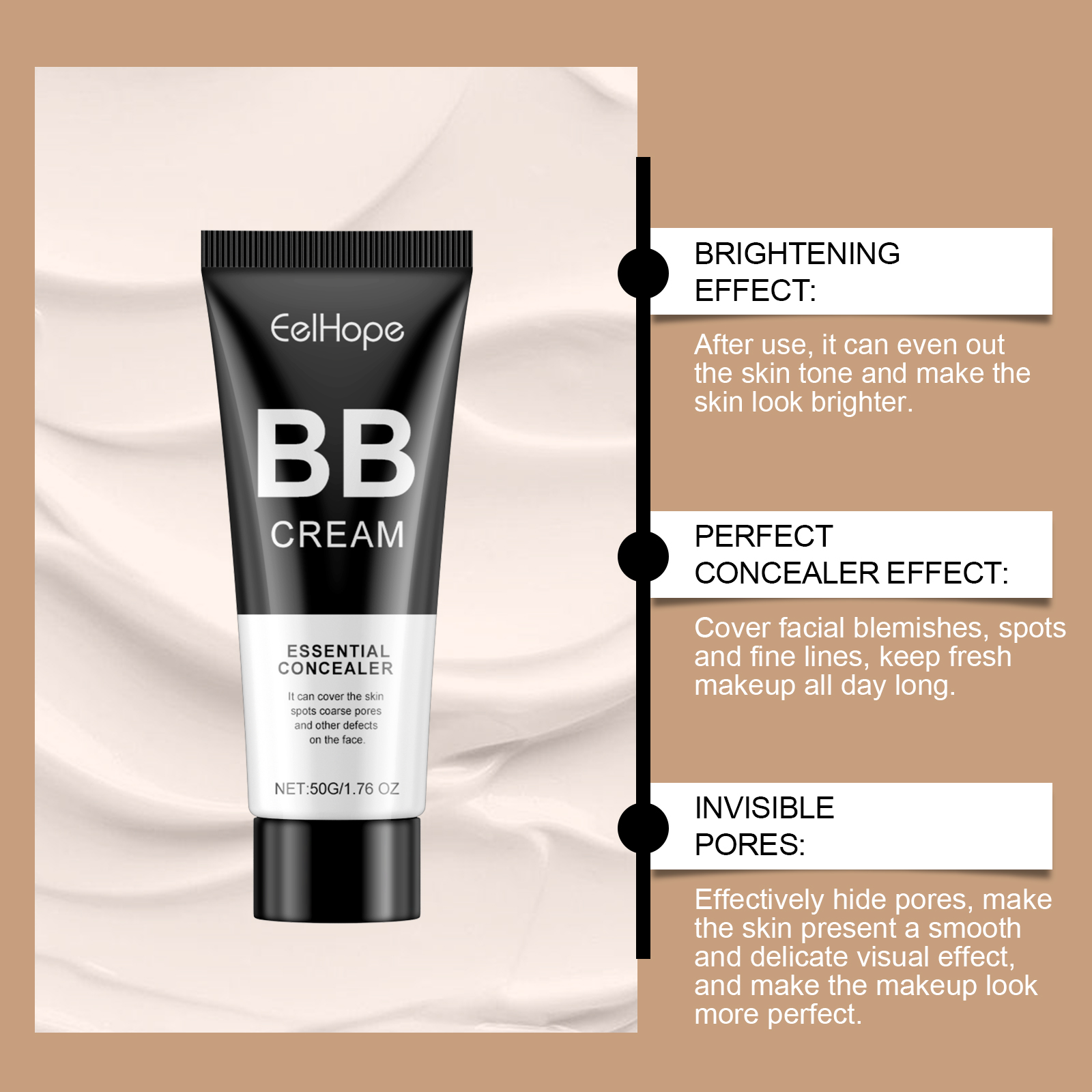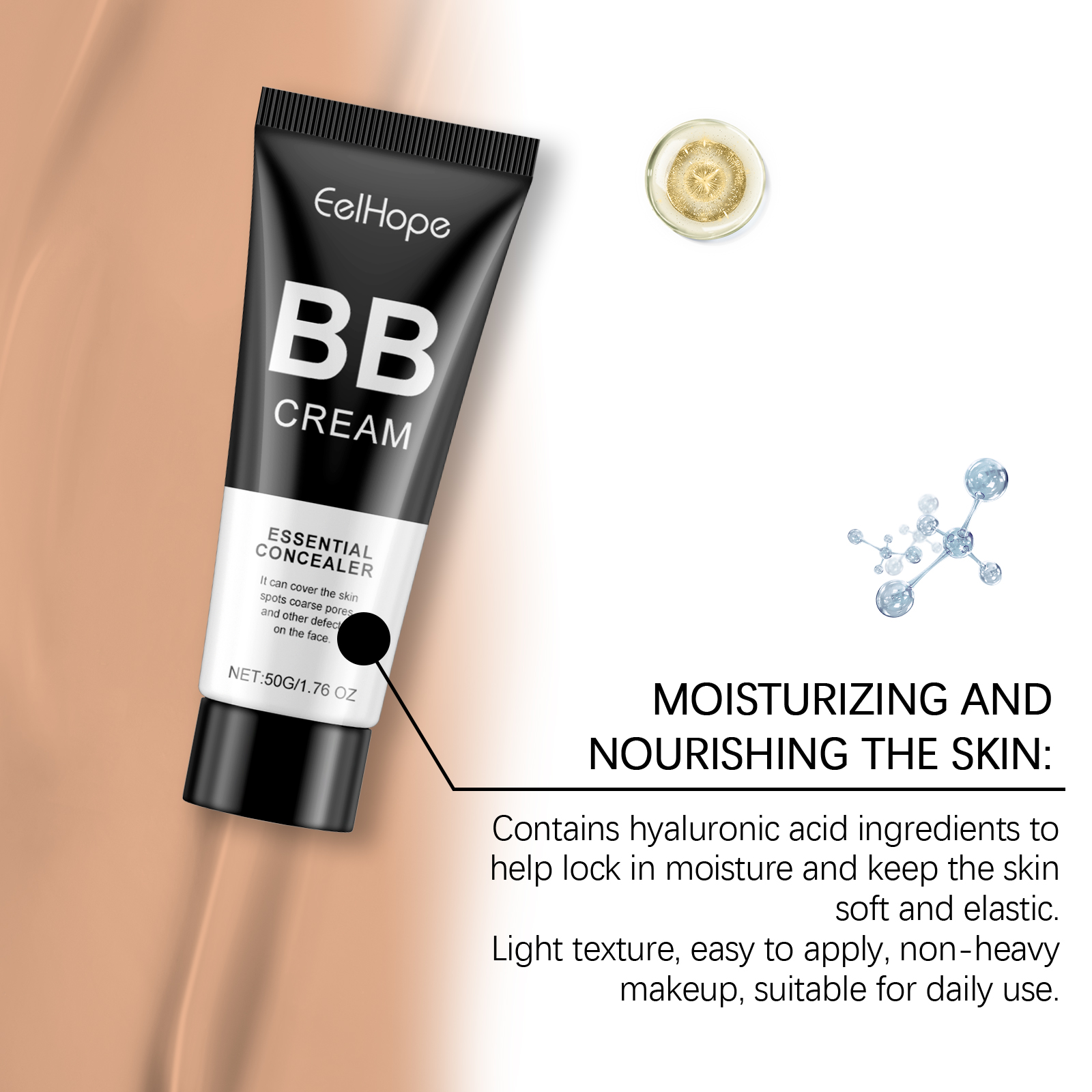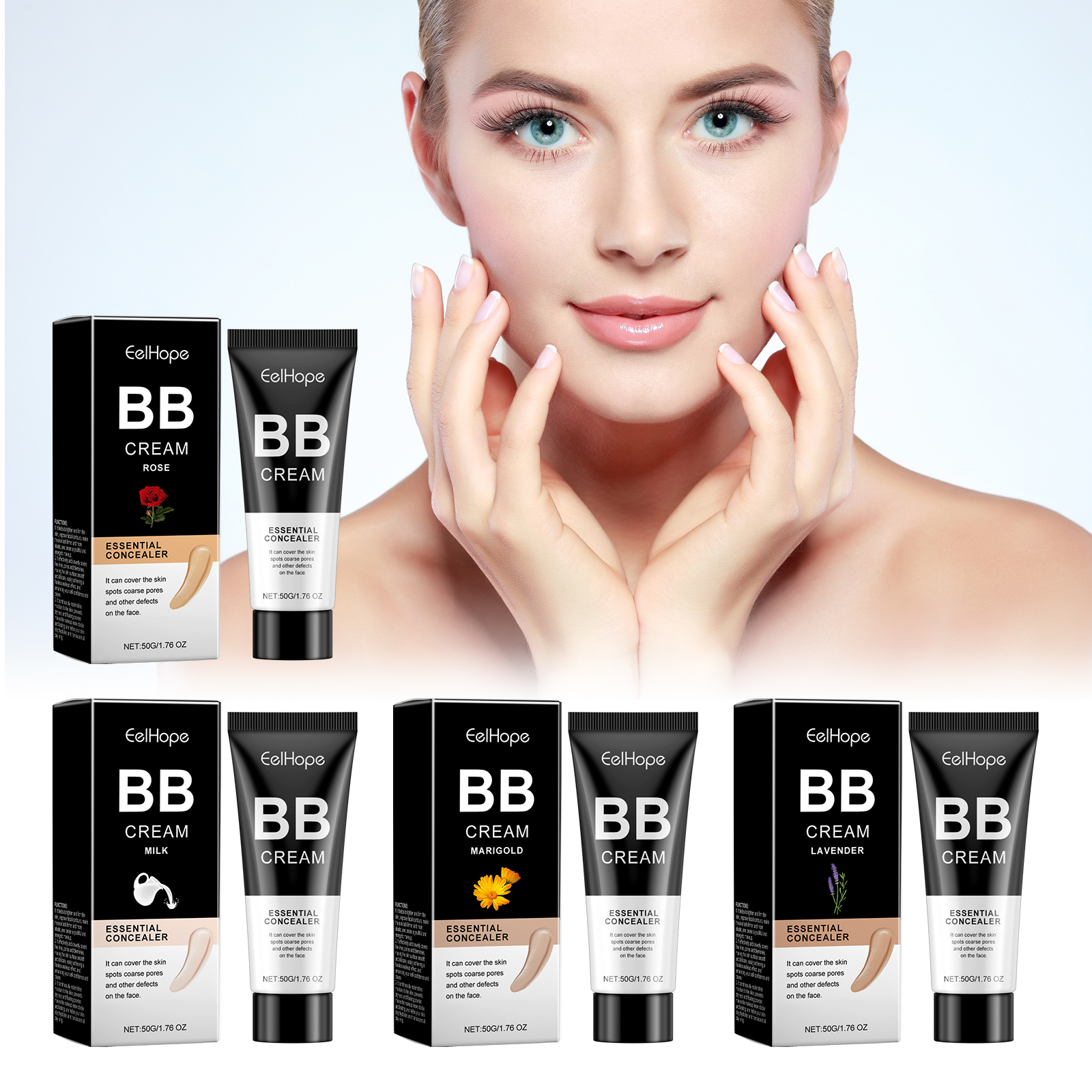 Our BB Cream range contains titanium dioxide, lavender extract and milk extract. It can provide light coverage, does not increase the burden on the skin, and maintains a fresh feeling. Easily create a bare face effect, showing flawless skin. Easy to carry, always maintain perfect makeup. Its use is simple: 1. Wash your face and keep it dry. 2. Take the appropriate amount of concealer on your hands and apply it to your face with your fingertips or a cotton pad, gently patting it until it covers your entire face evenly. Can be combined with a variety of makeup, enhance the overall skin, showing a healthy luster. Does not clog pores, smooth skin breathing after use, soft makeup.