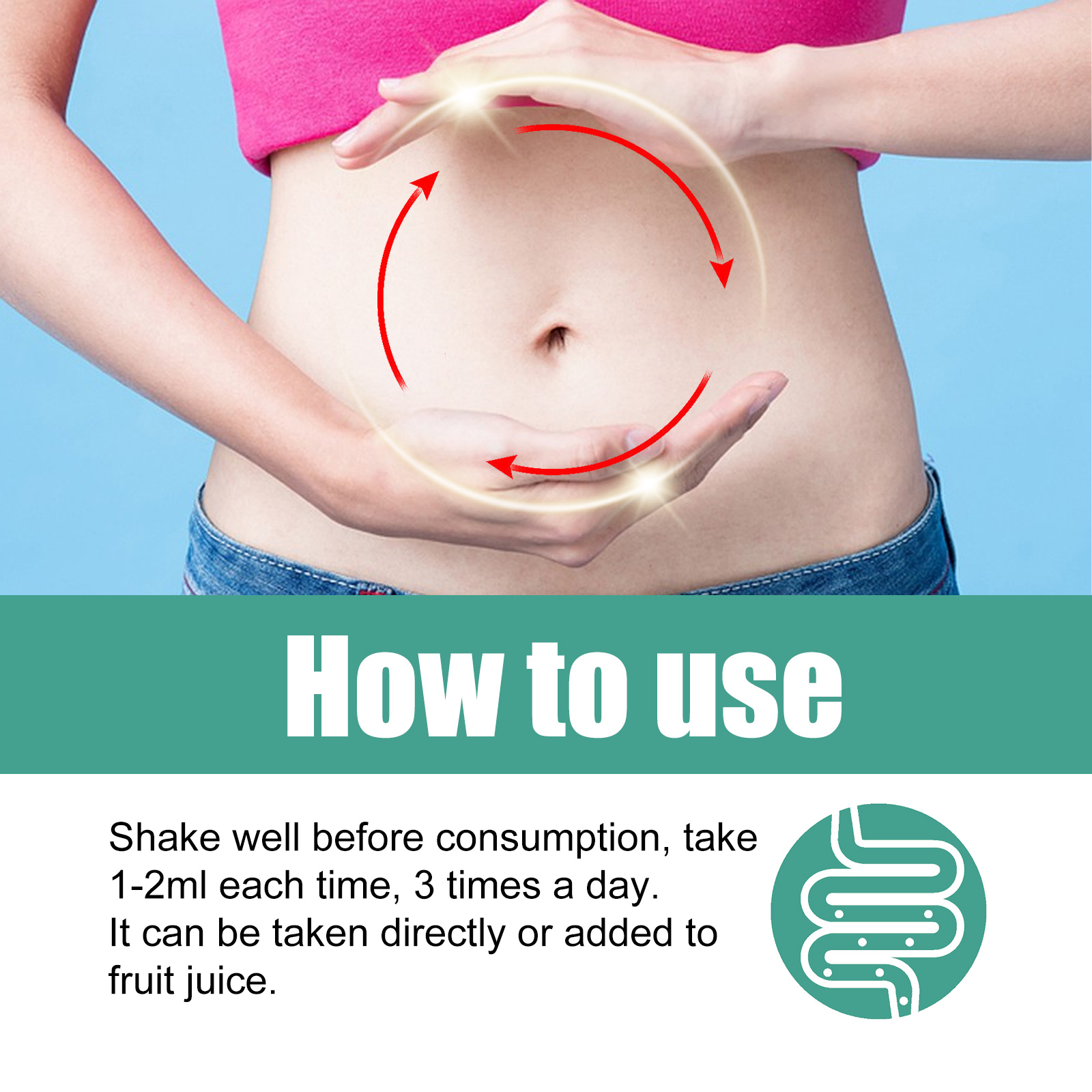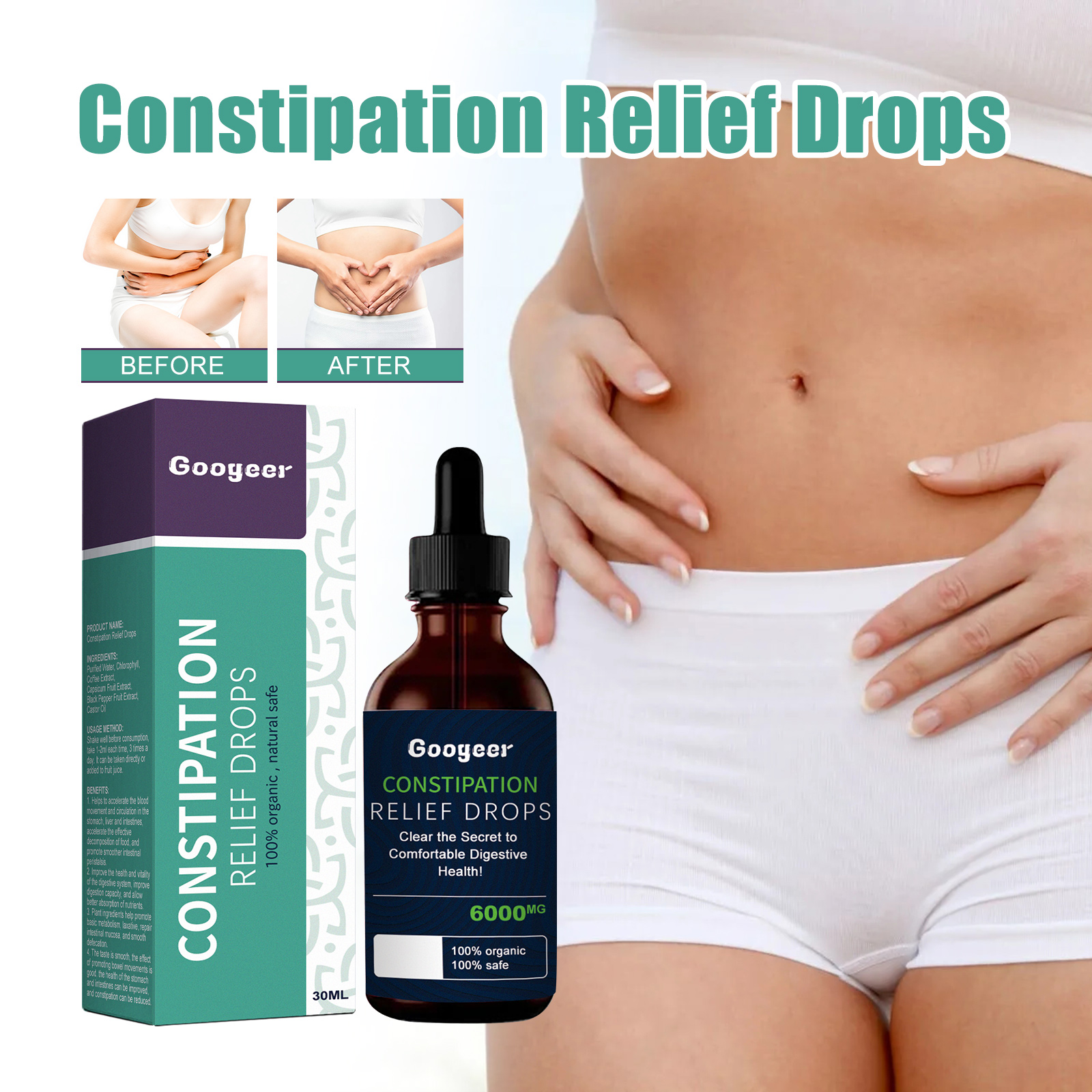 Our constipation relief drops contain chlorophyll, coffee extract, capsicum fruit extract. It softens stools by rehydrating them, making them less dense and easier to pass through the intestines. The way to use it is simple: shake well before taking, 1 to 2ml each time, 3 times a day. It can be taken directly or added to juice. It effectively relieves constipation, clears impurities from the digestive tract and promotes a faster and healthier metabolism.