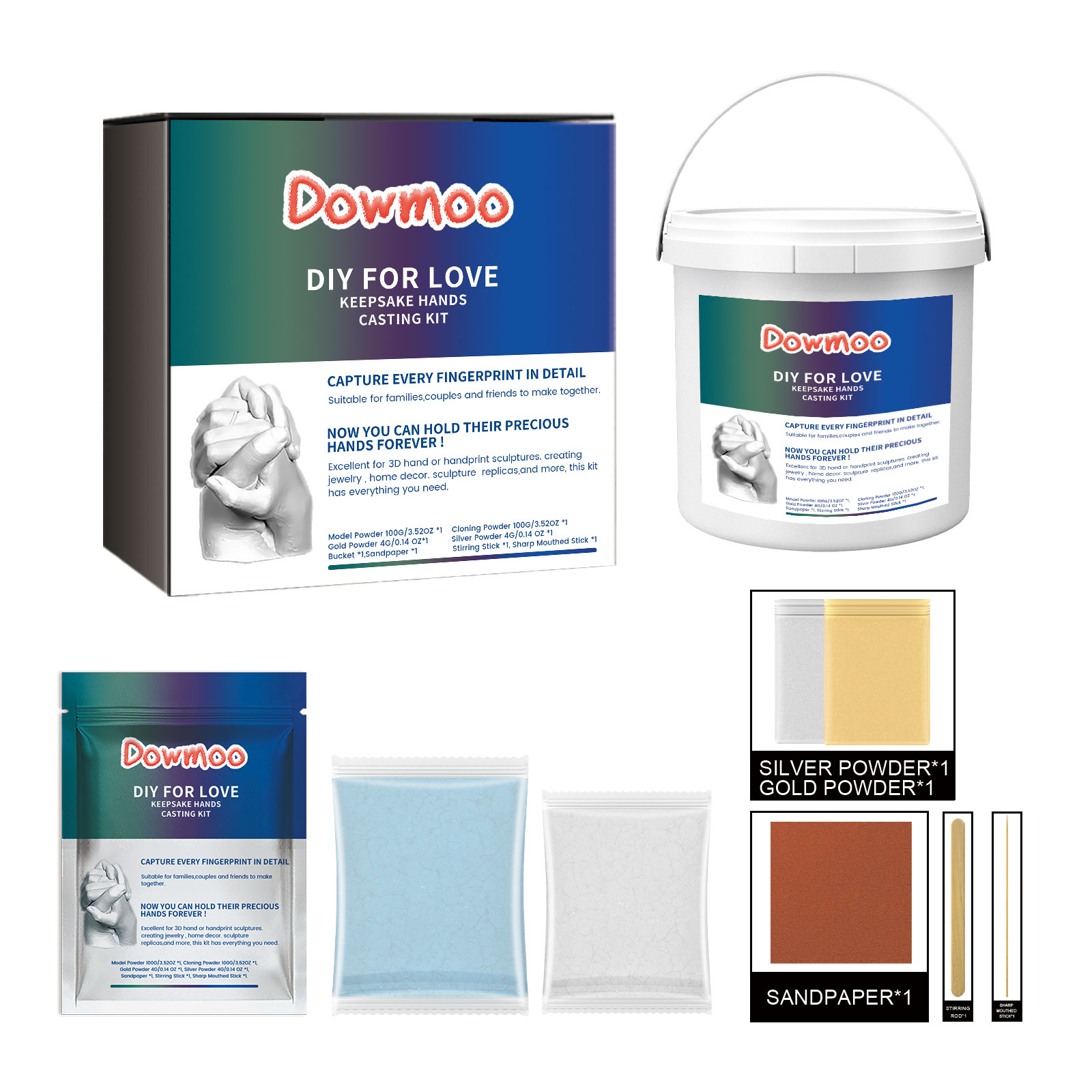 Our Diy For Love Keepsake Hands Casting Kit contain binder, retarder and filler. It can record the growth process, fine capture every fine line and fingerprint, so that you create a more perfect product, is a kind of love witness. It is simple to use: add the clone powder and water in a bucket with a mixing stick, stir it evenly, put your hand in the solution for 3-5 minutes, let it change color and set, then gently shake your hand and take it out. Add the molding powder and water to another bucket and mix well with a mixing stick. Pour the mixture into the mold and pat the edge of the bucket to reduce air bubbles. Wait for more than 30 minutes to cure before peeling off the clone layer. After peeling, process and color with sandpaper as needed. Perfect for teens, adults, couples and friends to create priceless memories together, it's a great choice for gift-giving.