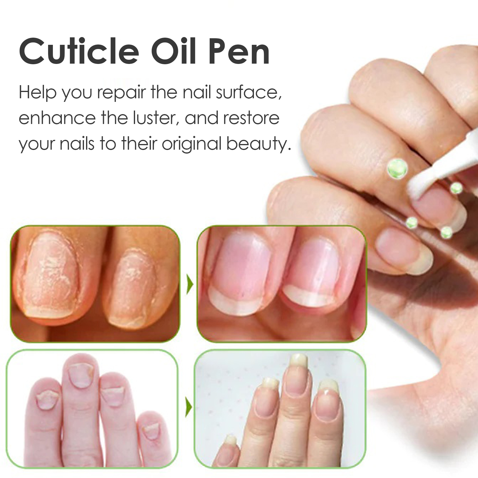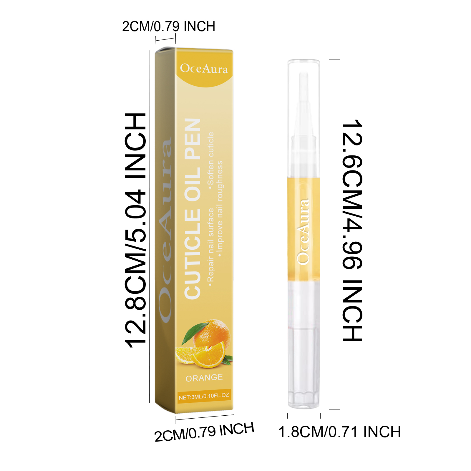 Our Cuticle Oil Pen contains Citrus Aurantium Dulcis(Orange) Fruit Extract, Olea Europaea(Olive) Fruit Extract, Vitis Vinifera(Grape)Seed Oil. It can deeply nourish nails, provide nutrients for nail growth, reduce weak and fragile nails, prevent peeling, repair damage, and protect nail beds. Its application is simple: clean your nails, remove excess dead skin, remove the lid of the product, turn the brush head clockwise until the nail polish comes out of the brush head, apply the oil to the nail and gently massage it with your fingertips for 1-3 minutes until it is completely absorbed. It can help repair the surface of your nails, improve the shine and restore your nails to their original beauty.