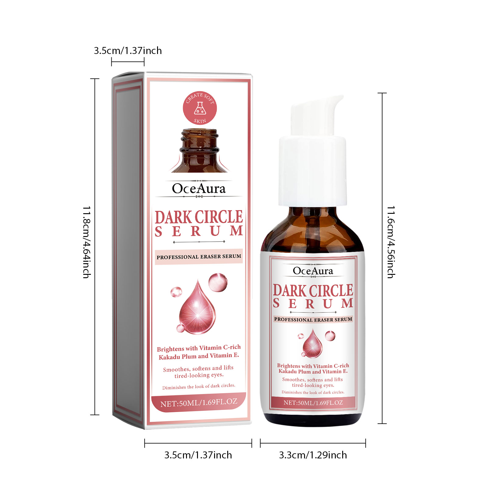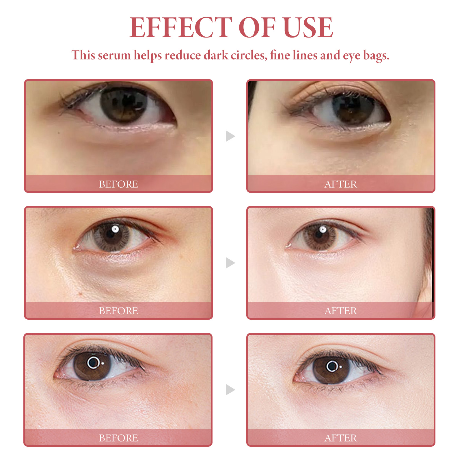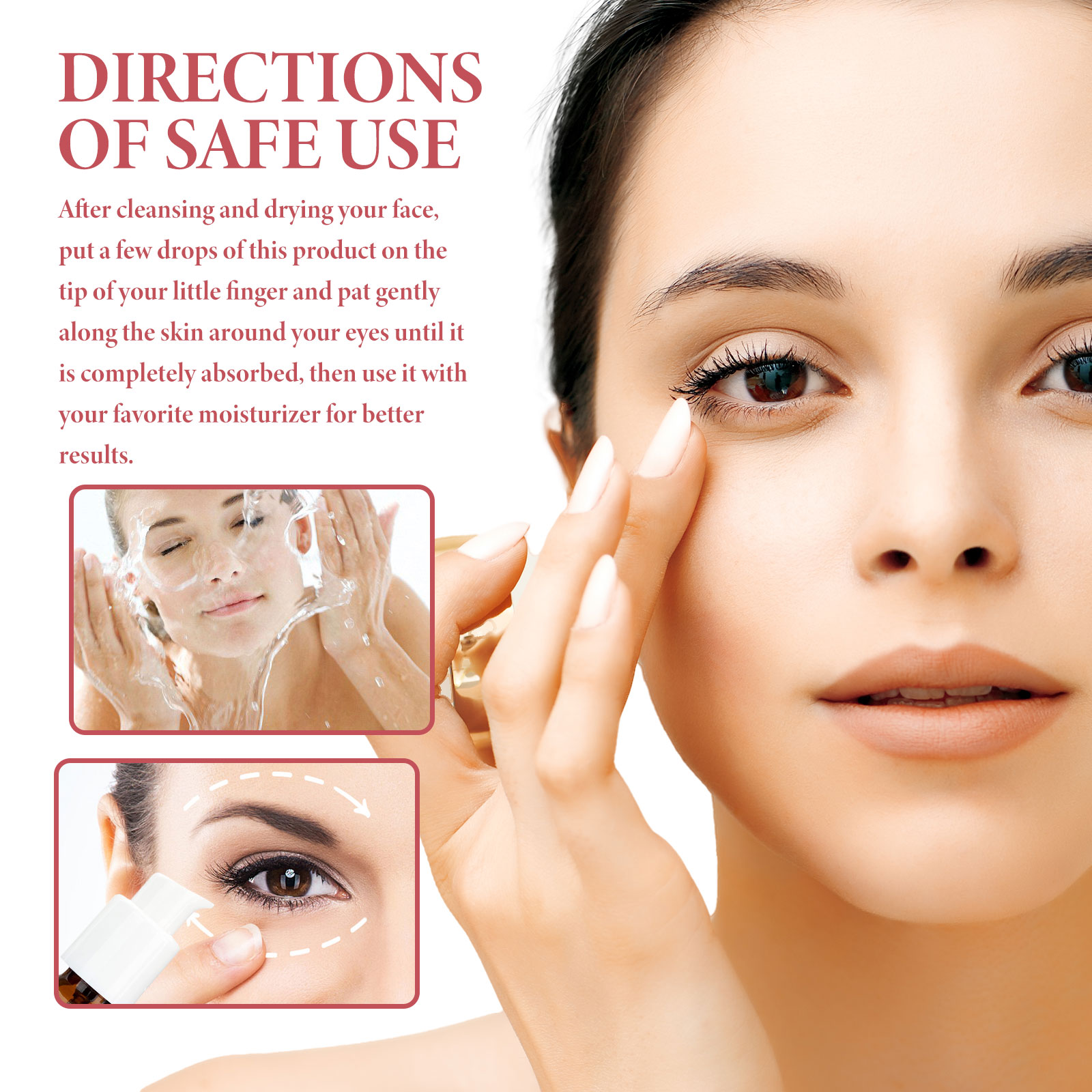 Our Dark Circle Serum contains Prunus Salicina Fruit Extract, Aloe Vera Leaf Extract, Hyaluronic Acid. It deeply moisturizes, locks in moisture, creates soft skin, reduces puffiness around the eyes, and makes the skin around the eyes look firmer. Its use method is very simple: after cleaning and drying the face, put a few drops of this product on the finger tip of the little finger, gently pat along the skin around the eye until completely absorbed, and then use with your favorite moisturizer, the effect is better. It can reduce bags and dark circles under the eyes, significantly reduce fine lines and crow's feet, improve skin firmness and elasticity, and solve the signs of aging around the delicate eyes.