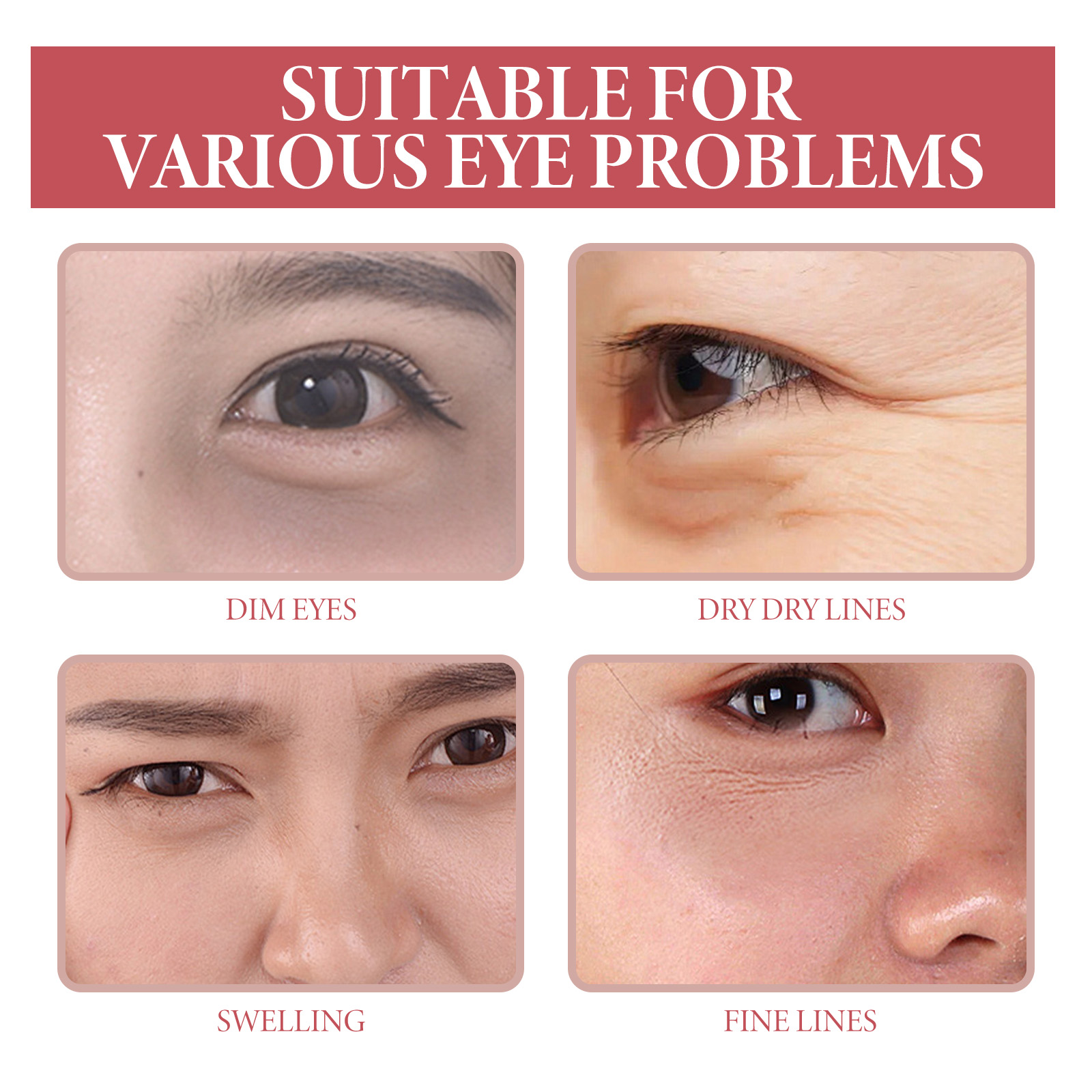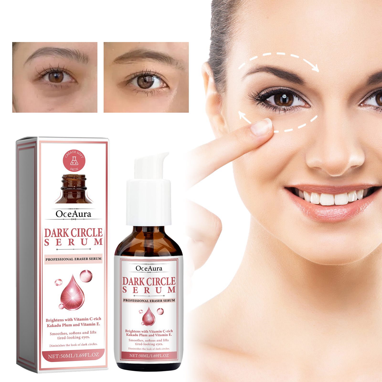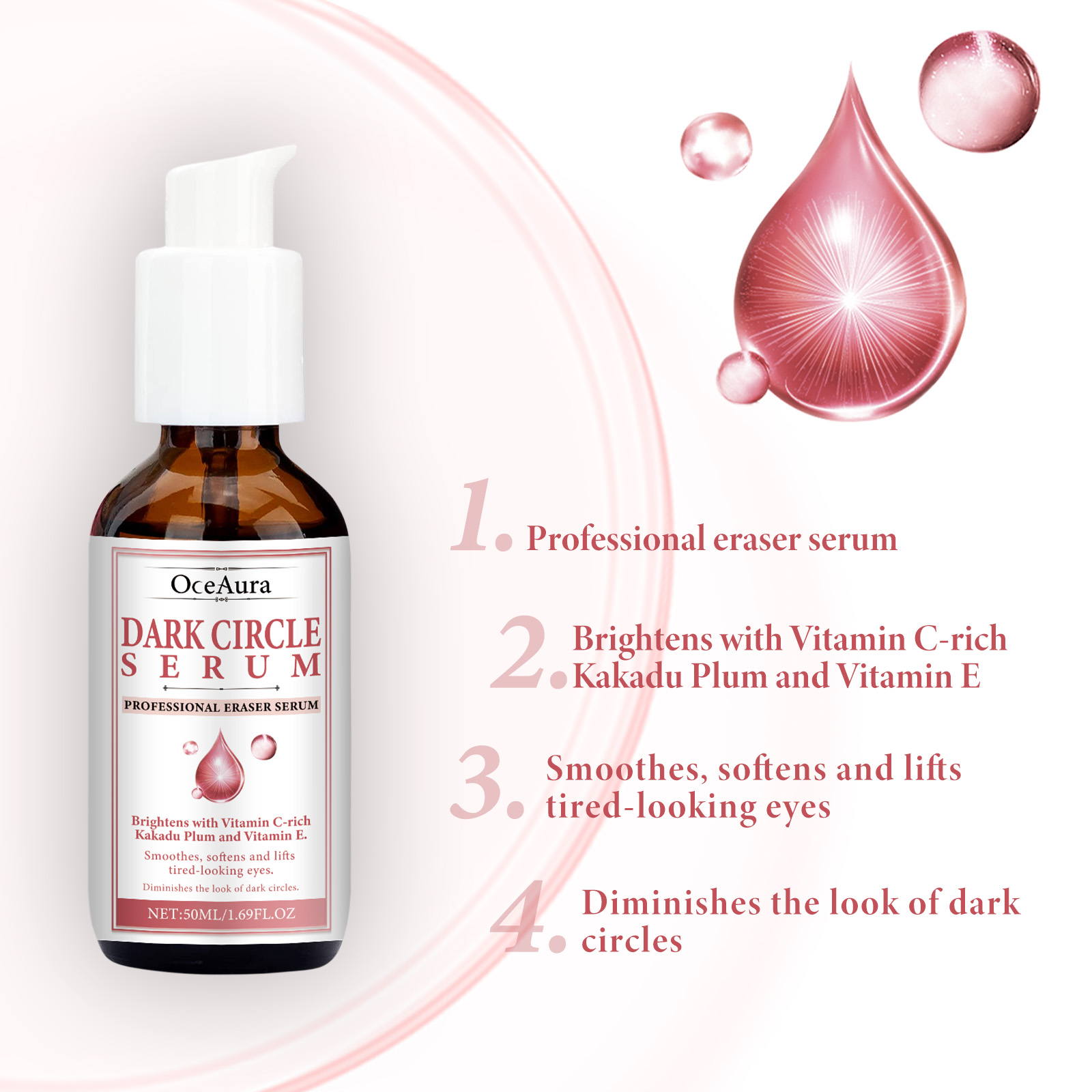 Our Dark Circle Serum contains Prunus Salicina Fruit Extract, Aloe Vera Leaf Extract, Hyaluronic Acid. It deeply moisturizes, locks in moisture, creates soft skin, reduces puffiness around the eyes, and makes the skin around the eyes look firmer. Its use method is very simple: after cleaning and drying the face, put a few drops of this product on the finger tip of the little finger, gently pat along the skin around the eye until completely absorbed, and then use with your favorite moisturizer, the effect is better. It can reduce bags and dark circles under the eyes, significantly reduce fine lines and crow's feet, improve skin firmness and elasticity, and solve the signs of aging around the delicate eyes.