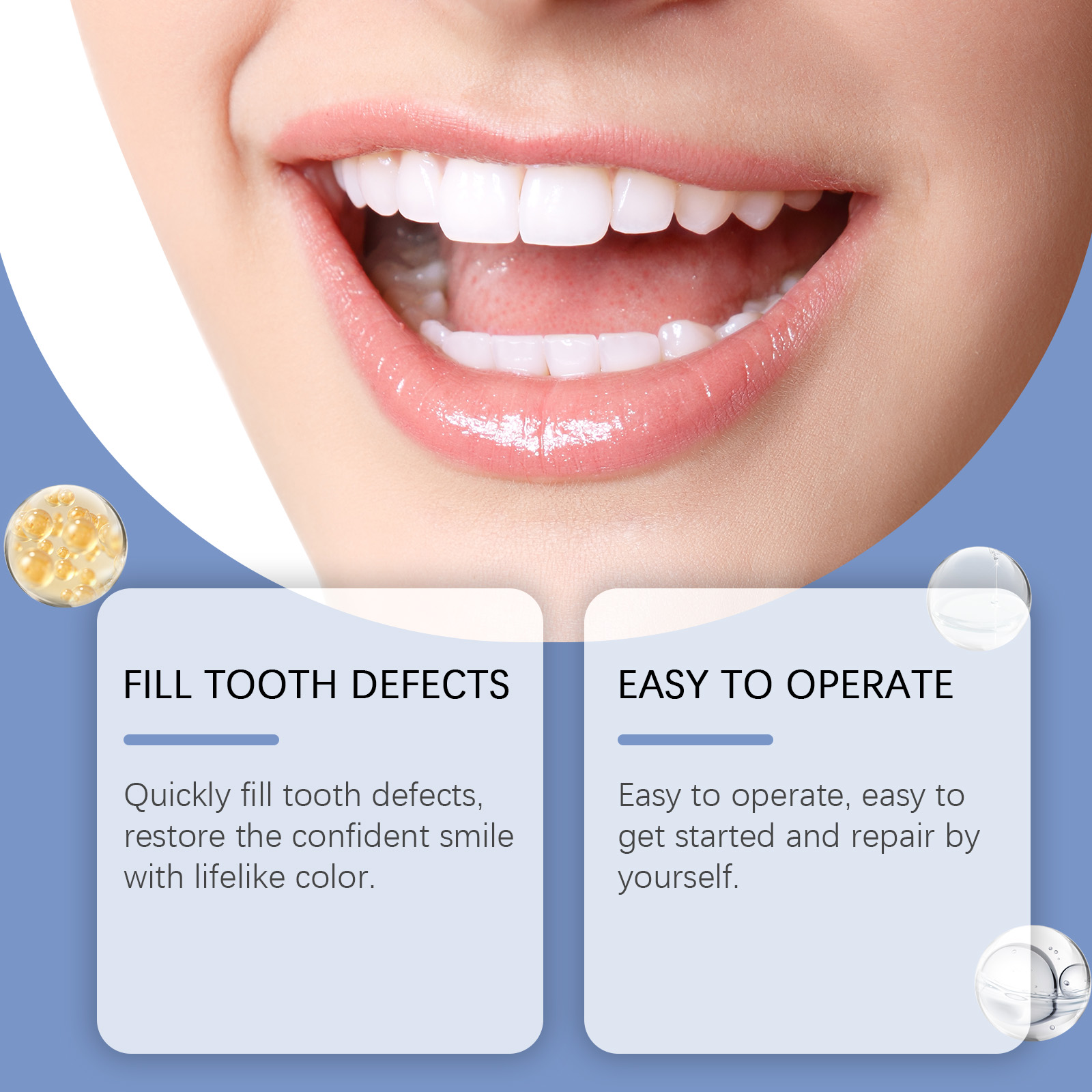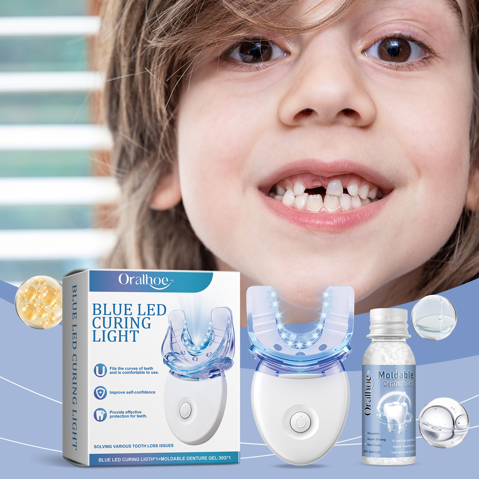 Our dental care kit contains dentures: silicone lamp: PP bottle: PET. It can quickly fill tooth defects and restore a confident smile with lifelike colors. Easy to operate, easy to self-study and maintenance. Its use is simple: clean and dry the area where the repair material will be used. The plastic prosthesis mold is heated in water at 60 degrees. Shape it according to the shape of the teeth. Place the formed material between the teeth or in the missing tooth. Put the mouth holder of the blue LED curing lamp in your mouth, stick it on your teeth, turn on the switch, and irradiate it for 3-5 minutes to cure the material. And can be safe material, durable, protect oral health. Improve your smile and show confidence.