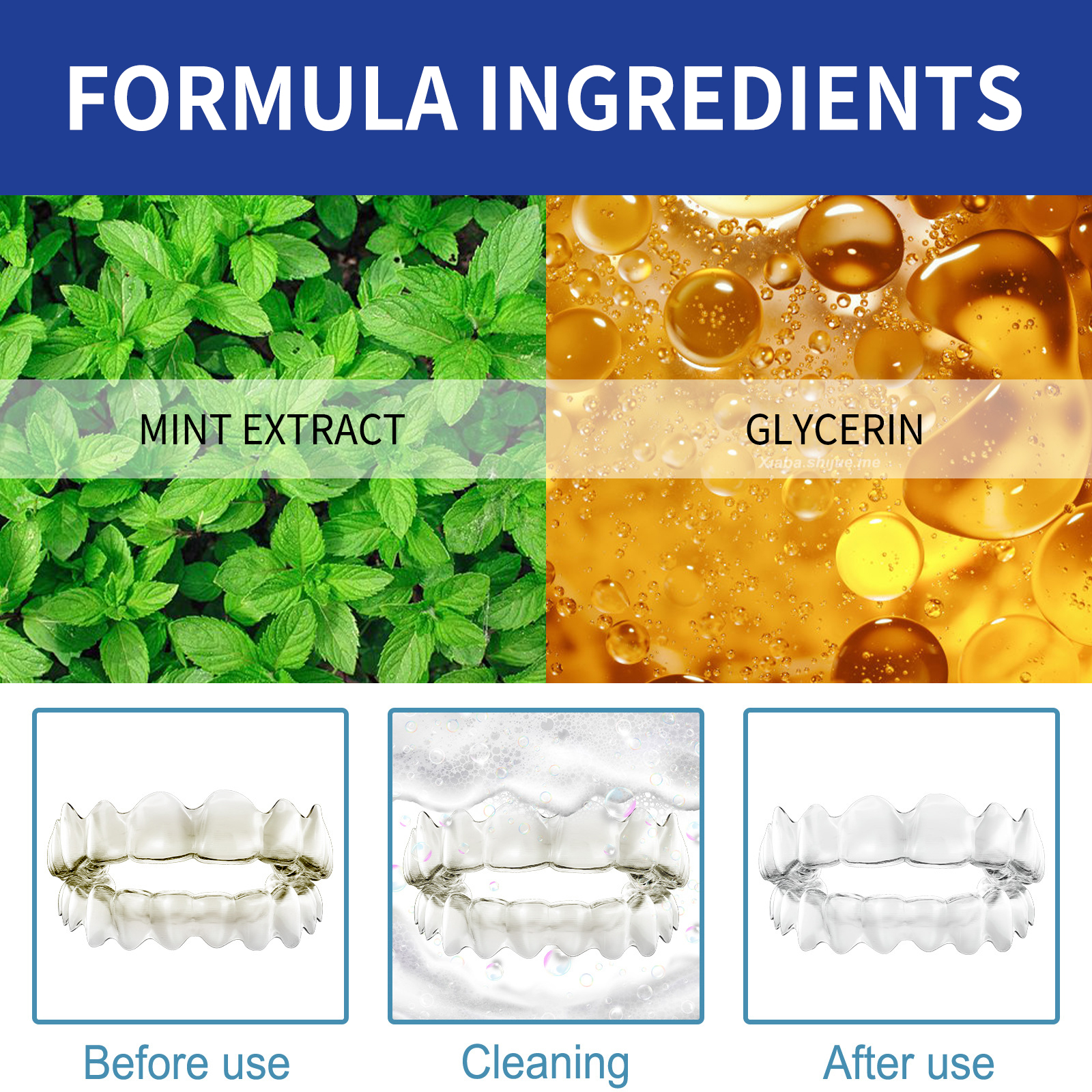 Our denture cleaner contains peppermint extract, glycerin. It removes stains and kills 99% of Odor- caused bacteria for a refreshing mint taste. Its use is simple: take out the pallets and distribute up to one full foam pump inside each pallet. Use the nozzle head to apply the foam evenly, covering and cleaning all areas. Put the dish back in your mouth and let the excess foam dissipate without rinsing. After use, the braces are clean and sterile, with a mint scent.