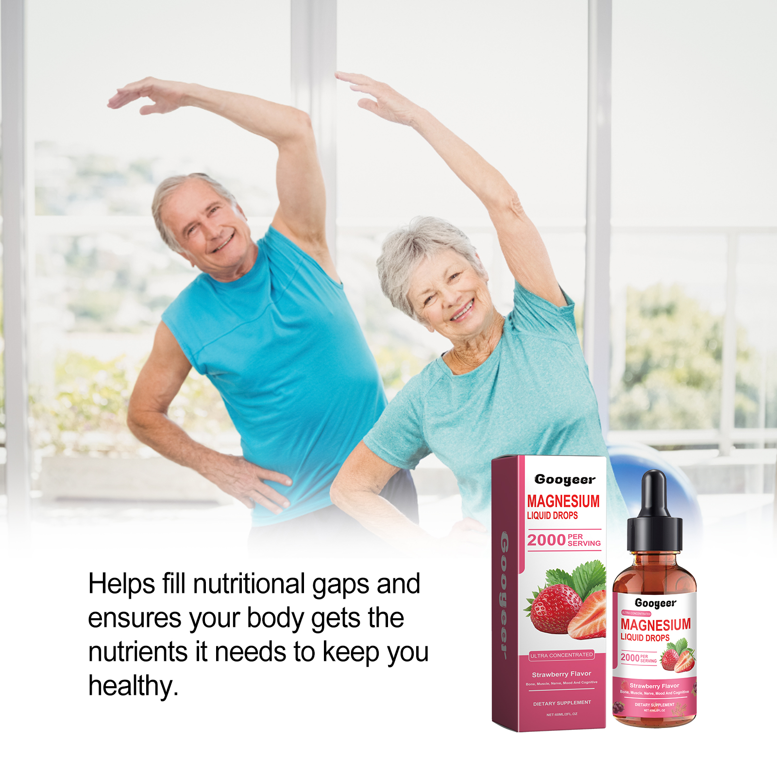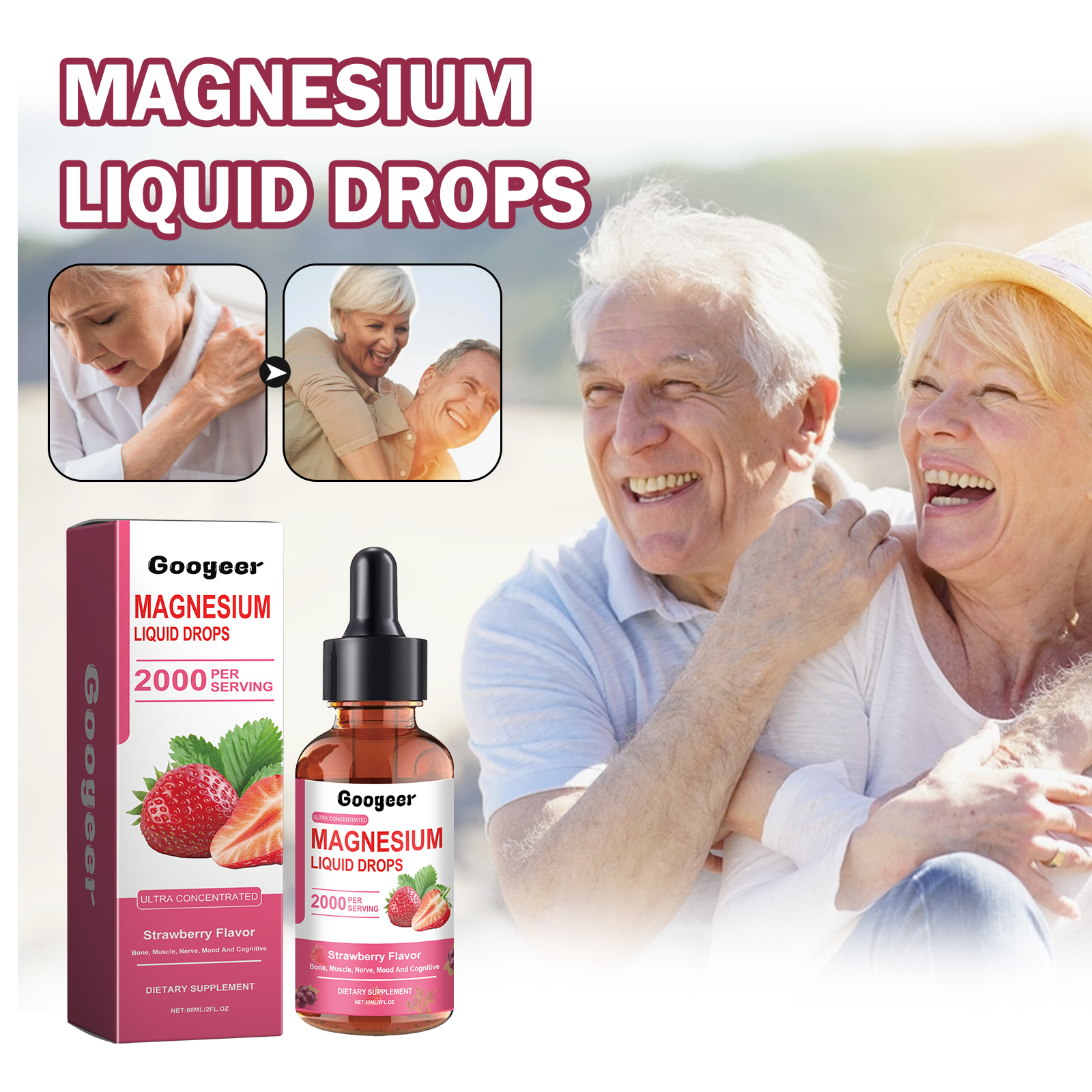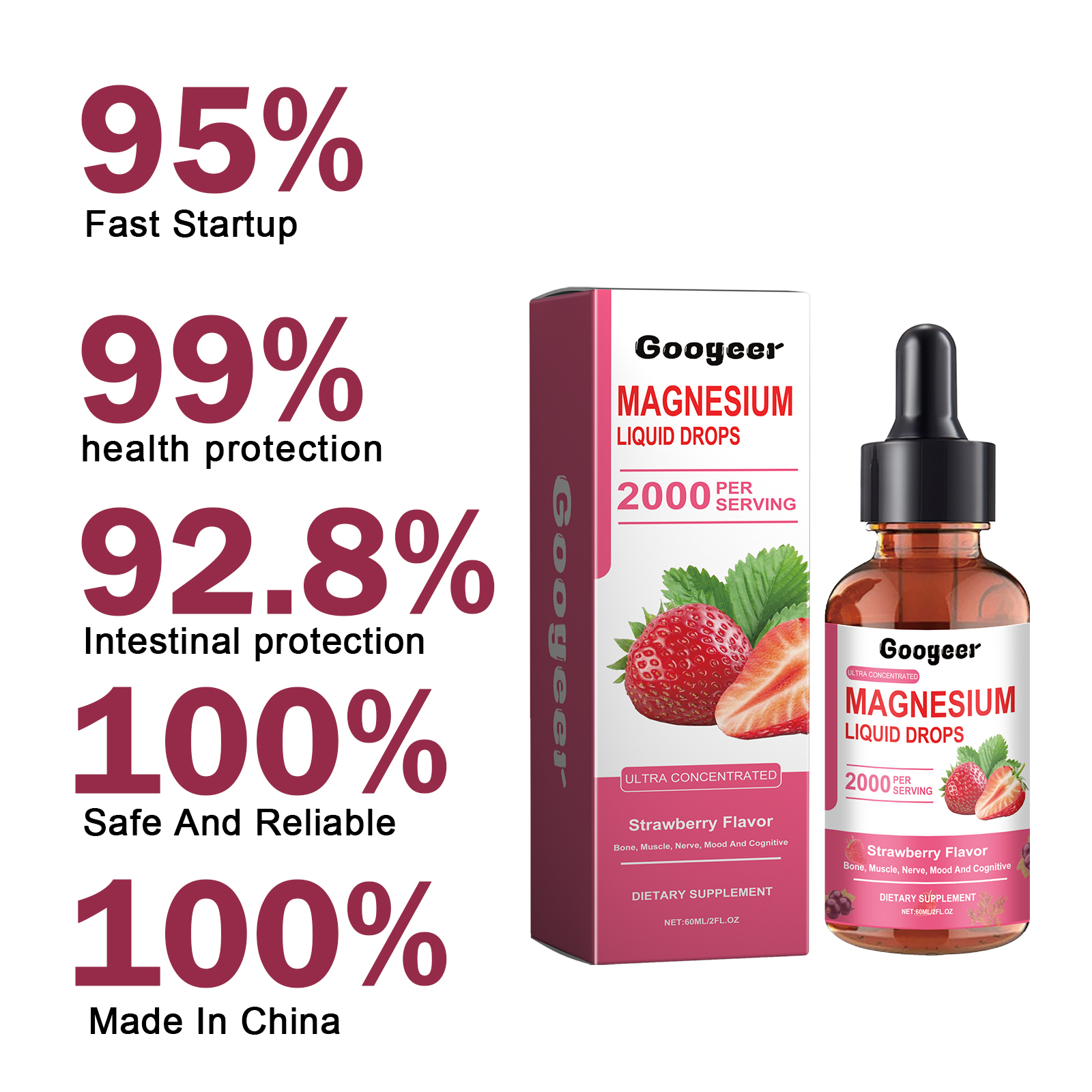 Our Magnesium Liquid Drops contain Strawberry Extract, Glycerin, Vitamin D. It promotes strong bones, muscles, and nerves, energizes your entire body, helps fill nutritional gaps, and ensures your body gets the nutrients it needs to stay healthy. Its use is very simple: shake well before eating, take 1-2 drops each time, 1-2 times a day. It can help increase calcium absorption and make the body healthier.