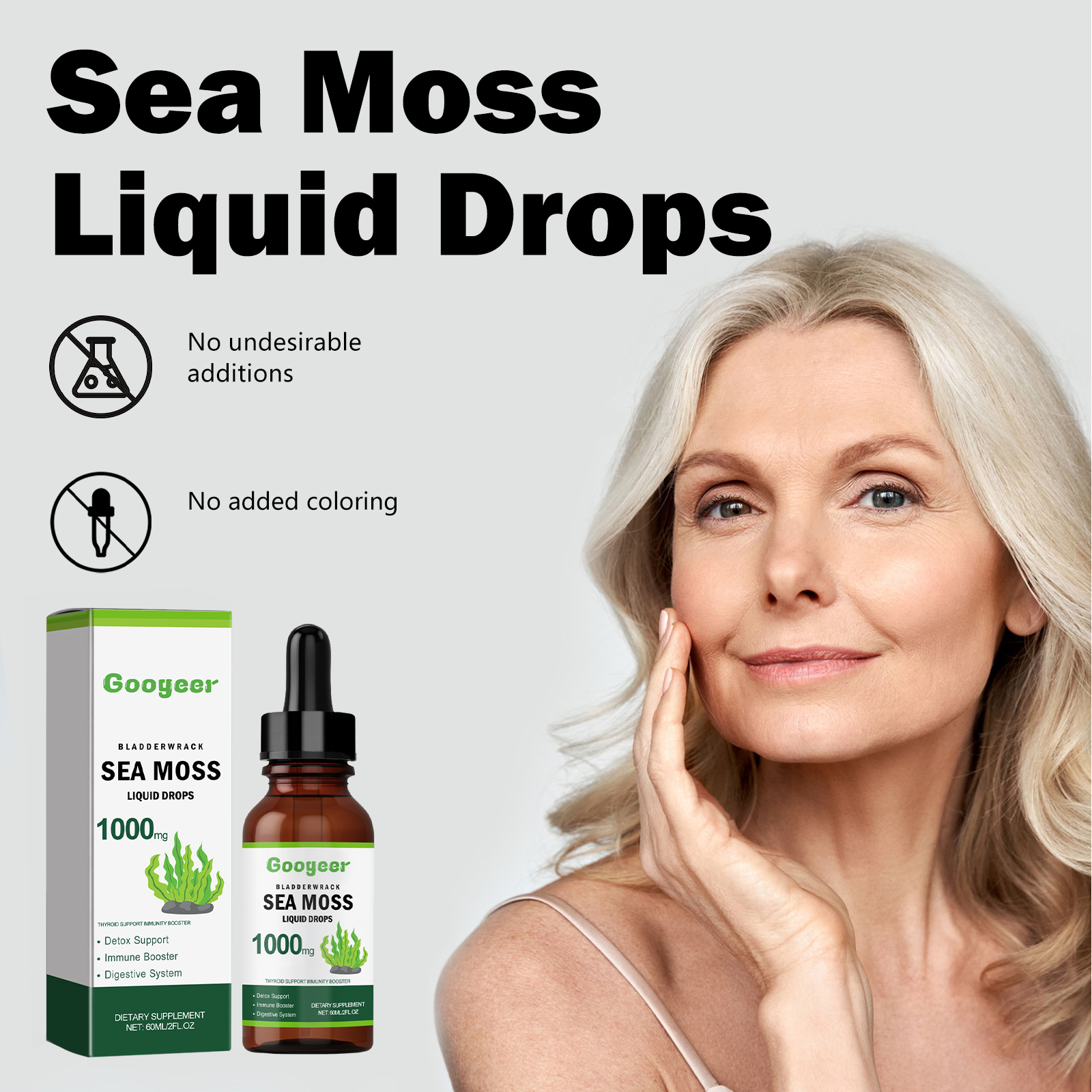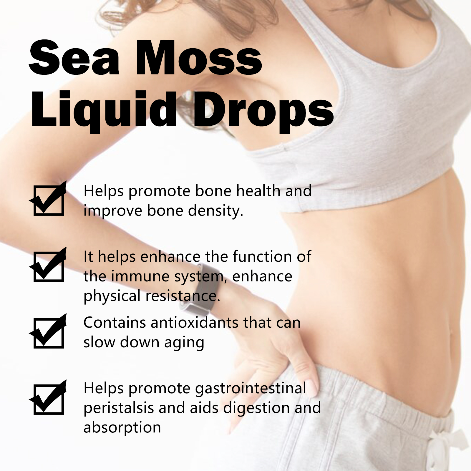 Our Sea Moss Liquid Drops contain Seaweed, Black Seed Oil, Vitamin C. It can help promote bone health, improve bone density, slow aging, help promote gastrointestinal motility, and aid digestion and absorption. The way to use it is very simple: shake well before eating, 1-2 drops at a time, 1-2 times a day. It can enhance the function of the immune system and strengthen the body's resistance.